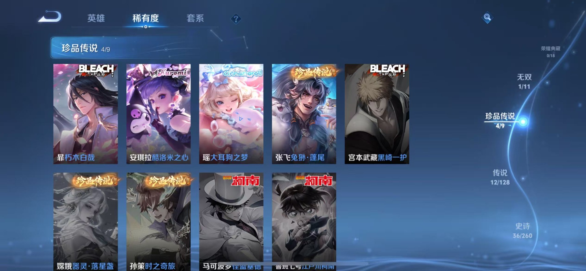 - [12116553]V7 1珍品传说 5传说 123英雄 188皮肤 可修改实名 优质装备:怪盗基德,超时空战士-狄仁杰,涂山容容 传说皮:幻光神枪 珍宝阁皮:万物之道,蔷薇恋人 限定皮:愿照·岁时盈(虞姬年限),鸣野蒿,瑞麟志(木兰年限),五谷丰年,游园惊梦,李小龙,大圣娶亲,深海之息(深海大菠萝) 史诗皮:器灵·浮梦炉,龙之律动,琥珀纪元伽罗,百相守梦-黄忠,蒙犽顽岩魄,怒海争锋,织梦人,紫霞仙子,电玩小子(小书包),白龙吟,黄金分割率,特工魅影,千年之狐,江河有灵,雪夜绮愿(周瑜),百解令(蒙犽),高渐离燃音魔法,蒙恬荣光圣徽,电玩·爆裂旋风,末日机甲-吕布,猫狗日记-大乔,乱世虎臣,节奏热浪,修罗,摇滚巨星,水果甜心,星夜王子,德古拉伯爵,暗隐猎兽者,幽灵船长,鬼剑武藏,心灵战警,纤云弄巧,缤纷独角兽,乘风破浪,逐浪之夏,水晶猎龙者,曙光守护者,箭羽风息,金属风暴,圣诞恋歌,鹰眼统帅,魅力维加斯,未来纪元-赵云
