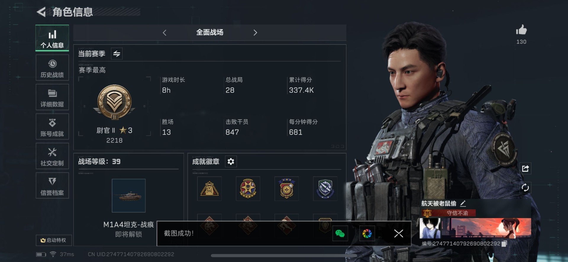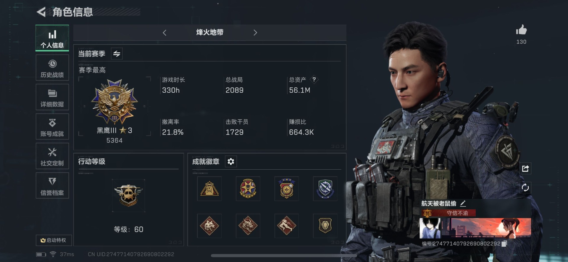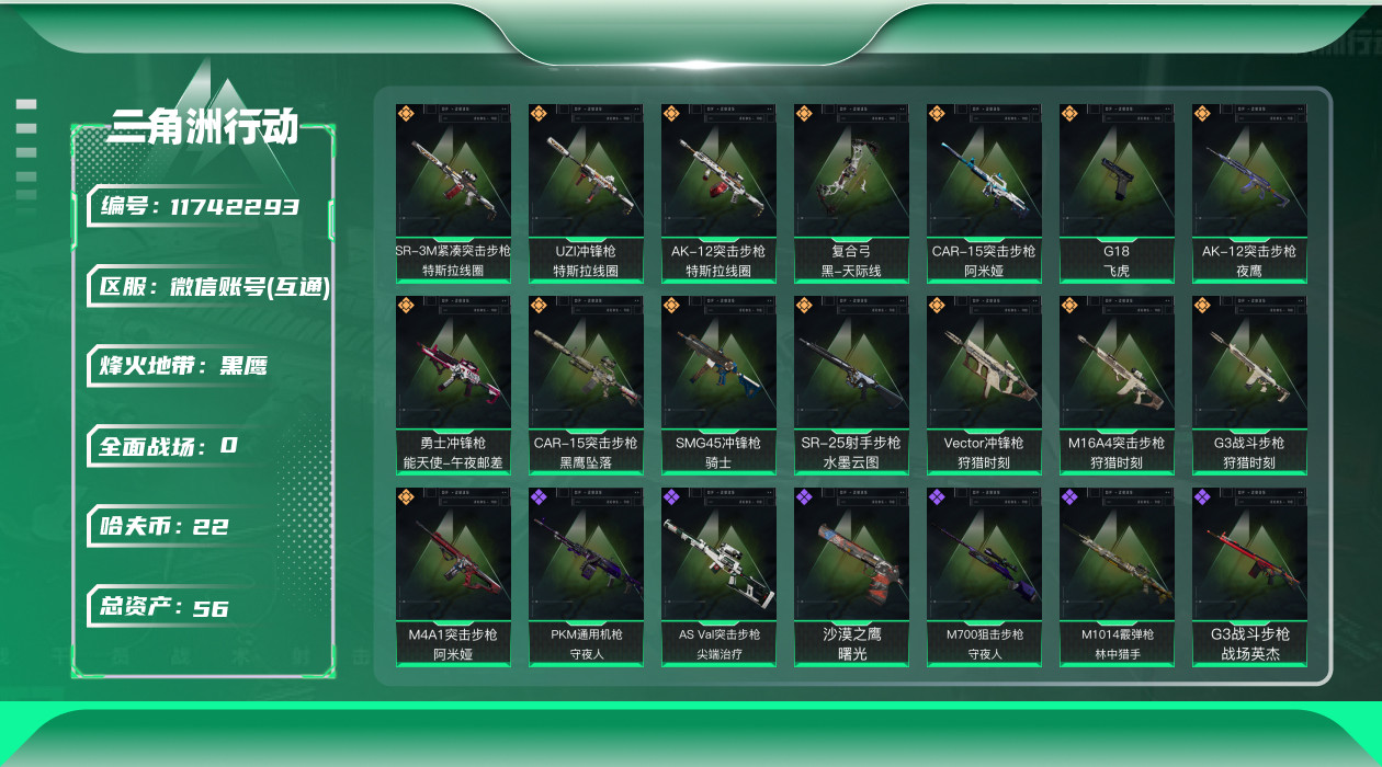 [11742293]总资产:56.1M 2干员外观 15传说枪械 哈夫币:22.272K 可二次 可修改实名 优质装备:顶级安全箱(3x3) 烽火地带段位:黑鹰 全面战场段位:尉官 传说武器皮肤:SR-25射手步枪-水墨云图,SMG45冲锋枪-骑士,G18-飞虎,UZI冲锋枪-特斯拉线圈,M16A4突击步枪-狩猎时刻,AK-12突击步枪-特斯拉线圈,SR-3M紧凑突击步枪-特斯拉线圈,勇士冲锋枪-能天使-午夜邮差,Vector冲锋枪-狩猎时刻,G3战斗步枪-狩猎时刻,复合弓-黑-天际线,M4A1突击步枪-阿米娅,CAR-15突击步枪-阿米娅,AK-12突击步枪-夜鹰,CAR-15突击步枪-黑鹰坠落 史诗武器皮肤:SR-3M紧凑突击步枪-英雄,PKM通用机枪-蝮蛇,AUG突击步枪-蝮蛇,G3战斗步枪-战场英杰,SG552突击步枪-尖端治疗,QJB201轻机枪-Old Habits,M1014霰弹枪-林中猎手,PKM通用机枪-守夜人,AS Val突击步枪-尖端治疗,M700狙击步枪-守夜人,Ash-12战斗步枪-守夜人,SR-25射手步枪-尖端治疗,MP5冲锋枪-深海恐惧,SG552突击步枪-深海恐惧,AKM突击步枪-林中猎手,M16A4突击步枪-竞赛选手,M250通用机枪-囚徒,SV-98狙击步枪-林中猎手,PTR-32突击步枪-英雄,SV-98狙击步枪-囚徒,QBZ95-1突击步枪-曙光,沙漠之鹰-曙光,Vector冲锋枪-阿萨拉文明,SVD狙击步枪-阿萨拉工艺,S12K霰弹枪-曙光,PKM通用机枪-英雄,QSZ92G-风林火山,P90冲锋枪-紧急戒备 干员外观:无名-夜鹰,威龙-飞虎