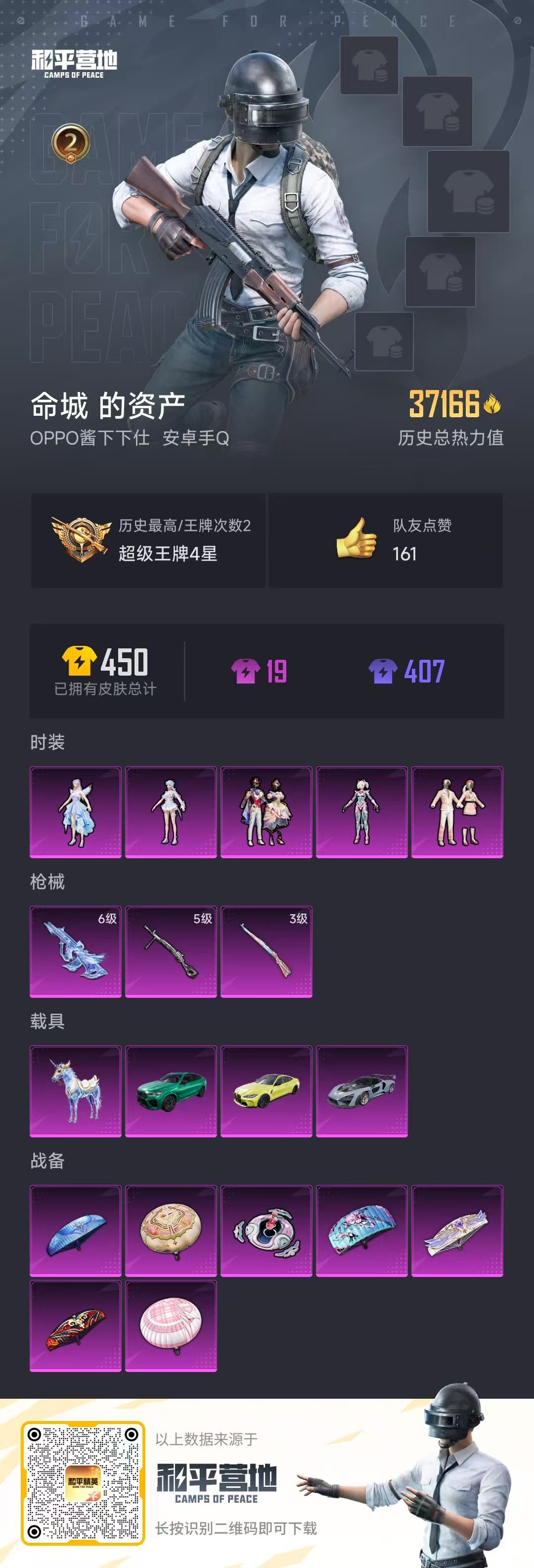 [11721566]实名: 可修改 时装数: 423 载具数: 4 枪械数: 112 战备数: 84 热门装扮: 呆萌铁蟹,第五大道,星梦奇缘,星穹咏叹调,幻星舰长,荧海星豚 载具: 星梦玉骢,宝马X6 M(曼岛绿),宝马M4(圣保罗黄),迈凯伦塞纳(冷萃蓝) 稀有枪皮: AUG星梦奇缘,Kar98K-巳巳如意,DP-28-豹影疾电
