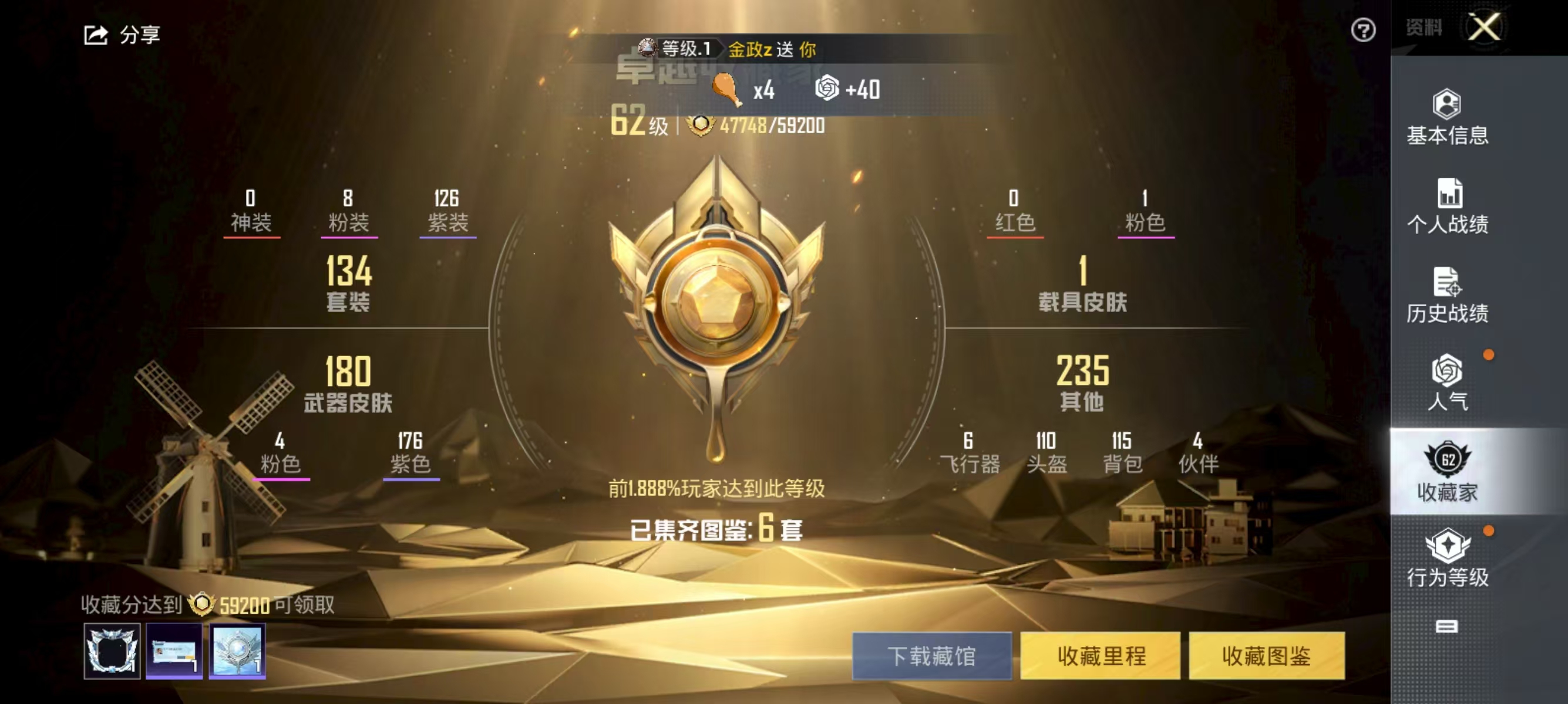 [11720362]实名: 可修改 时装数: 494 载具数: 1 枪械数: 190 战备数: 153 热门装扮: 飓风飞鹰,紫电风暴,紫钛骑兵,蜜语绒猫,美琪,创世·救赎,未来领航者 载具: 幽焰风驰摩托车 稀有枪皮: UMP45-宇宙意志,AKM-幽焰骑士,Kar98K-巳巳如意,DP-28-豹影疾电