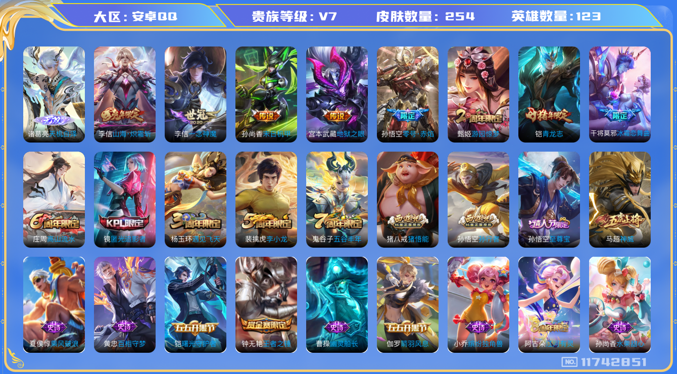 [11742851]V7 1无双 5传说 123英雄 254皮肤 可修改实名 优质装备:天机白泽,一念神魔,末日机甲-孙尚香(绿蚂蚱),零号·赤焰,地狱之眼,山海·炽霜斩(李信年限),涂山容容 珍宝阁皮:妄想食味,玩趣恶龙 限定皮:至尊宝,神威(电光马子),遇见飞天,高山流水,五谷丰年,青龙志(铠年限),游园惊梦,李小龙,孙行者,猪悟能,冰霜恋舞曲,匿光追影者 史诗皮:星界战将,龙之律动,百相守梦-周瑜,百相守梦-黄忠,白龙吟,黄金分割率,永昼,江河有灵,魅语,蒙恬荣光圣徽,偶像歌手,末日机甲-吕布,修罗,女仆咖啡,摇滚巨星,水果甜心,星夜王子,心灵骇客,暗隐猎兽者,幽灵船长,鬼剑武藏,暗渊魔法,心灵战警,天秀·启明,舞动绿茵,纤云弄巧,繁星吟游(呼啦呼啦),缤纷独角兽,乘风破浪,逐浪之夏,水晶猎龙者,曙光守护者,箭羽风息,金属风暴,原初追逐者,圣诞狂欢,圣诞恋歌,鹰眼统帅,王者之锤,魅力维加斯,黎明之约,赏金猎手,无心,未来纪元-赵云