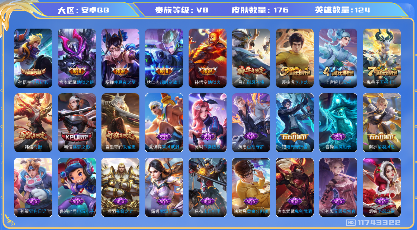 - [12428739]【商品标题】:安卓Q-V4-最强王者段位-125英雄-226皮肤-2典藏-0珍品无双-0无双-2珍品传说-16传说-51史诗 【荣耀典藏】:武则天英雄,小乔天鹅之梦,韩信弑枪猎影 【珍品传说】:嫦娥器灵落星盏,张飞兔狲蓬尾 【传说皮肤】:公孙离云诺千山,澜愿照九州拓,虞姬愿照岁时盈,云缨幻光神枪,吕布怒海麟威,赵云淬星耀世,王昭君乞巧织情,虞姬启明星使,李信一念神魔,干将莫邪久胜战神,后羿黄金射手座,貂蝉仲夏夜之梦,李白凤求凰,孙尚香末日机甲,宫本武藏地狱之眼,武则天海洋之心 【限定皮肤】:白起狰,姜子牙天穹之誓,狄仁杰阴阳师,小乔纯白花嫁,虞姬凯尔特女王,赵云皇家上将,孙尚香蔷薇恋人,孙膑妖精王,扁鹊炼金王,芈月重明,夏侯惇朔风刀,甄姬游园惊梦,曹操烛龙,马可波罗逐梦之星,狄仁杰魔术师,狄仁杰万华元夜,达摩沙漠行僧,项羽海滩派对,老夫子醍醐杖,关羽冰锋战神,貂蝉逐梦之音,程咬金演武夺筹,露娜一生所爱,韩信逐梦之影,兰陵王金庭之子,牛魔御旌,李元芳云中旅人,虞姬霸王别姬,虞姬启明星使,钟馗驱傩正仪,杨玉环遇见飞天,杨戬潮玩骑兵,太乙真人饕餮,鬼谷子原初探秘者,鬼谷子五谷丰年,苏烈千军破阵,弈星混沌棋,沈梦溪大漠名商,明世隐疑决卦,裴擒虎擒涛扼浪,狂铁御狮,米莱狄御霄,盾山御銮,鲁班大师探海日志,桑启海盐诗旅,张良古海寻踪,刘邦剑破天穹,周瑜熔金海岸 【年限皮肤】:李白凤求凰,马超神威 【赛季限定】:孙膑妖精王,扁鹊炼金王,白起狰,芈月重明,夏侯惇朔风刀,曹操烛龙,狄仁杰万华元夜,达摩沙漠行僧,老夫子醍醐杖,程咬金演武夺筹,兰陵王金庭之子,张良古海寻踪,牛魔御旌,李元芳云中旅人,虞姬凯尔特女王,钟馗驱傩正仪,太乙真人饕餮,鬼谷子原初探秘者,苏烈千军破阵,弈星混沌棋,沈梦溪大漠名商,明世隐疑决卦,裴擒虎擒涛扼浪,狂铁御狮,米莱狄御霄,盾山御銮,鲁班大师探海日志,桑启海盐诗旅,刘邦剑破天穹,姜子牙天穹之誓 【战令限定】:杨戬潮玩骑兵 【史诗皮肤】:露娜紫霞仙子,赵云皇家上将,貂蝉圣诞恋歌,王昭君偶像歌手,狄仁杰魔术师,孙尚香蔷薇恋人,孙尚香水果甜心,嬴政暗夜贵公子,墨子金属风暴,吕布圣诞狂欢,刘禅绅士熊喵,小乔纯白花嫁,曹操幽灵船长,李白千年之狐,韩信白龙吟,虞姬霸王别姬,关羽冰锋战神,貂蝉逐梦之音,花木兰水晶猎龙者,刘邦德古拉伯爵,韩信逐梦之影,夏侯惇乘风破浪,兰陵王