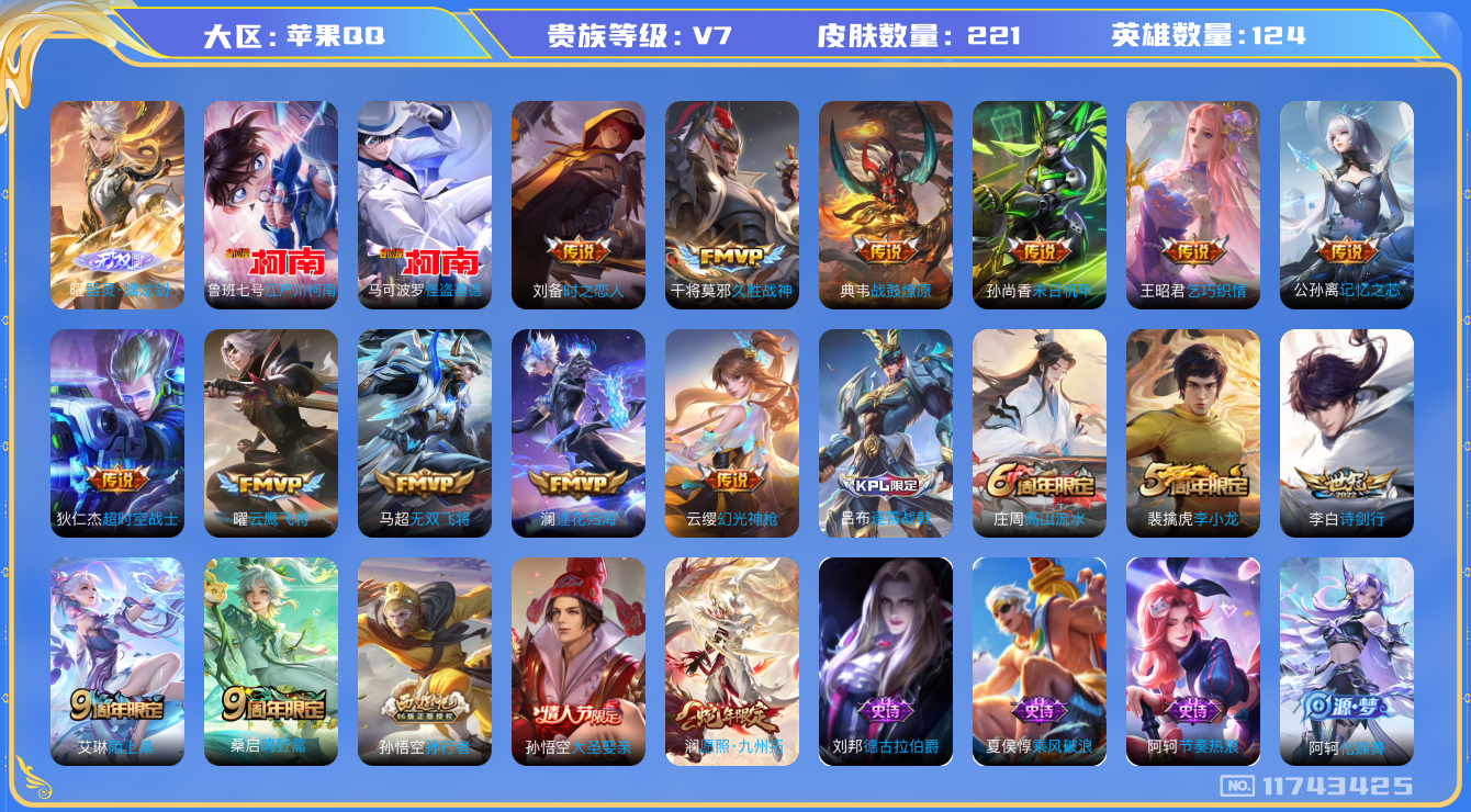 [11743425]V7 1无双 2珍品传说 14传说 124英雄 221皮肤 可修改实名 优质装备:器灵·螭龙剑,江户川柯南,怪盗基德,云鹰飞将(小将军),久胜战神,末日机甲-孙尚香(绿蚂蚱),乞巧织情,时之恋人-刘备(电焊工),超时空战士-狄仁杰,无双飞将,记忆之芯(机甲兔),澜逐花归海 传说皮:典韦战鼓燎原,幻光神枪 珍宝阁皮:玩趣恶龙 限定皮:愿照·九州拓(澜年限),逐霄战戟,陌上桑,鸣野蒿,高山流水,诗剑行,李小龙,孙行者,大圣娶亲 史诗皮:化蝶舞,茶境仙,破空之剑,战舞者,东方月初,蒙犽顽岩魄,芈月浮光幕影,百相守梦-百里守约,星界特工,百相守梦-黄忠,紫霞仙子,黄金分割率,千年之狐,真我赫兹(百里守约),魅语,百解令(蒙犽),偶像歌手,龙骑士(小龙虾),节奏热浪,修罗,水果甜心,绅士熊喵,星夜王子,德古拉伯爵,暗隐猎兽者,幽灵船长,鬼剑武藏,心灵战警,地狱岩魂,纤云弄巧,拒霜思,乘风破浪,逐浪之夏,月团寄思,水晶猎龙者,热力回旋,金属风暴,原初追逐者,圣诞狂欢,圣诞恋歌,鹰眼统帅,魅力维加斯,奇遇舞章,未来纪元-赵云