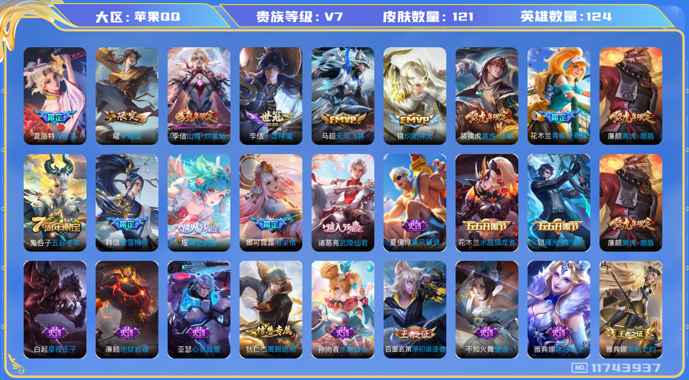 [11743937]V7 10传说 124英雄 121皮肤 可修改实名 优质装备:炽阳神光,一念神魔,李逍遥,无双飞将,山海·炽霜斩(李信年限),浮生妄 珍宝阁皮:胡桃夹子 限定皮:武陵仙君(小桃花),傲雪梅枪,前尘镜,五谷丰年,青春决赛季,寅虎·御盾(廉颇年限),寅虎·赤拳(老虎年限),时之祈愿-瑶(瑶传限) 史诗皮:电玩小子(小书包),魅语,冰冠公主,电玩·爆裂旋风,末日机甲-吕布,水果甜心,天才门将,星夜王子,心灵战警,地狱岩魂,乘风破浪,逐浪之夏,水晶猎龙者,曙光守护者,金属风暴,原初追逐者,圣诞狂欢,鹰眼统帅,魅力维加斯,黎明之约,赏金猎手,寅虎·御盾,无心