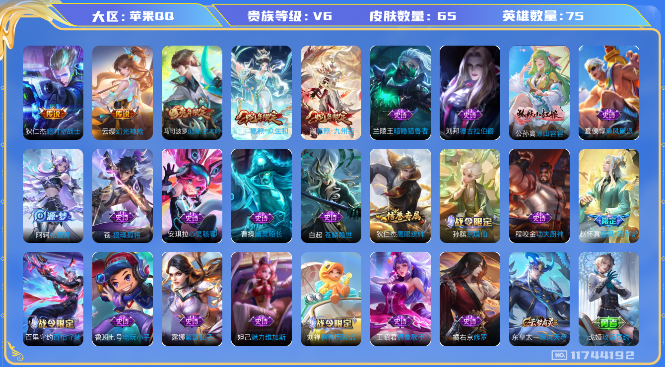 - [12280818]V10 5典藏 1珍品无双 2无双 7珍品传说 50传说 125英雄 486皮肤 可修改实名 优质装备:馥梦繁花,无限飓风号(高达),活力突击,鸣剑·曳影,全息碎影(猴子典藏),弑枪猎影(韩信典藏),碎月剑心(李白无双),器灵·螭龙剑,江户川柯南,怪盗基德,酷洛米之心,大耳狗之梦,朽木白哉,黑崎一护,黄金狮子座,黄金射手座,冠军飞将,云鹰飞将(小将军),黄金白羊座,猫影幻舞,久胜战神,炽阳神光,一念神魔,末日机甲-孙尚香(绿蚂蚱),地狱火,仲夏夜之梦(大飞蛾),零号·赤焰,地狱之眼,李逍遥,时之恋人-刘备(电焊工),淬星耀世,超时空战士-狄仁杰,山海·炽霜斩(李信年限),山海·琳琅生(小乔年限),鹤羽星尊,妄想实况,霜月吟,澜逐花归海,艾琳觅芳踪,黄金天蝎座,牧神诗旅,玄雷天君 珍品传说:兔狲·蓬尾 传说皮:乘龙·铭钟鼎(赵云年限),乘龙·淬吴钩(孙策年限),典韦战鼓燎原,铠冥王哈迪斯,祥瑞亨通,幻光神枪 珍宝阁皮:万物之道,蔷薇恋人,女武神 限定皮:愿照·九州拓(澜年限),愿照·福禄聚(蔡文姬年限),愿照·岁时盈(虞姬年限),愿照·山河定(司空震年限),愿照·众生和(妲己年限),愿照·千秋盛(女娲年限),逐霄战戟,映山客,陌上桑,鸣野蒿,夏侯惇霜北刀,至尊宝,白虎志(电光耗子),凤求凰(白切鸡),武陵仙君(小桃花),魔法小厨娘,时雨天司(水龙头),神威(电光马子),飞衡(韩信年限),山海·碧波行(瑶年限),遇见飞天,高山流水,诗剑行,齐天大圣,五谷丰年,青龙志(铠年限),梁祝,御风骁将(吕布年限),龙胆,逐梦之星,岱宗(典韦年限),李小龙,逐梦之影,玄武志(苏烈年限),辉光之辰,默契交锋-花木兰,孙行者,一生所爱,大圣娶亲,冰霜恋舞曲,乒乒小将,寅虎·御盾(廉颇年限),百木心枪,神器·万象笔,梦圆繁星 史诗皮:鸭鸭历险记-刘禅,苍鳞隐世,器灵·浮梦炉,糖绘人间,狼魂孤将,绮世丹青,化蝶舞,灵蛊蚀心,星界战将,谪仙醉月,龙之律动,雪豹·霜爪,藏狐·褐绒,布丁狗之誓,石田雨龙,百相守梦-周瑜,茶境仙,炽弈燎原,撼地雄心,破空之剑,涂山红红,东方月初,蒙犽顽岩魄,埋骨钱,琥珀纪元伽罗,决胜骁骑,蔬乡物语(鲁班七号),百相守梦-百里守约,星界特工,紫霞仙子,苍穹之光,电玩小子(小书包),白龙吟,黄金分割率,特工魅影,千年之狐,永昼,真我赫兹(镜),魅语,百解令(蒙犽)