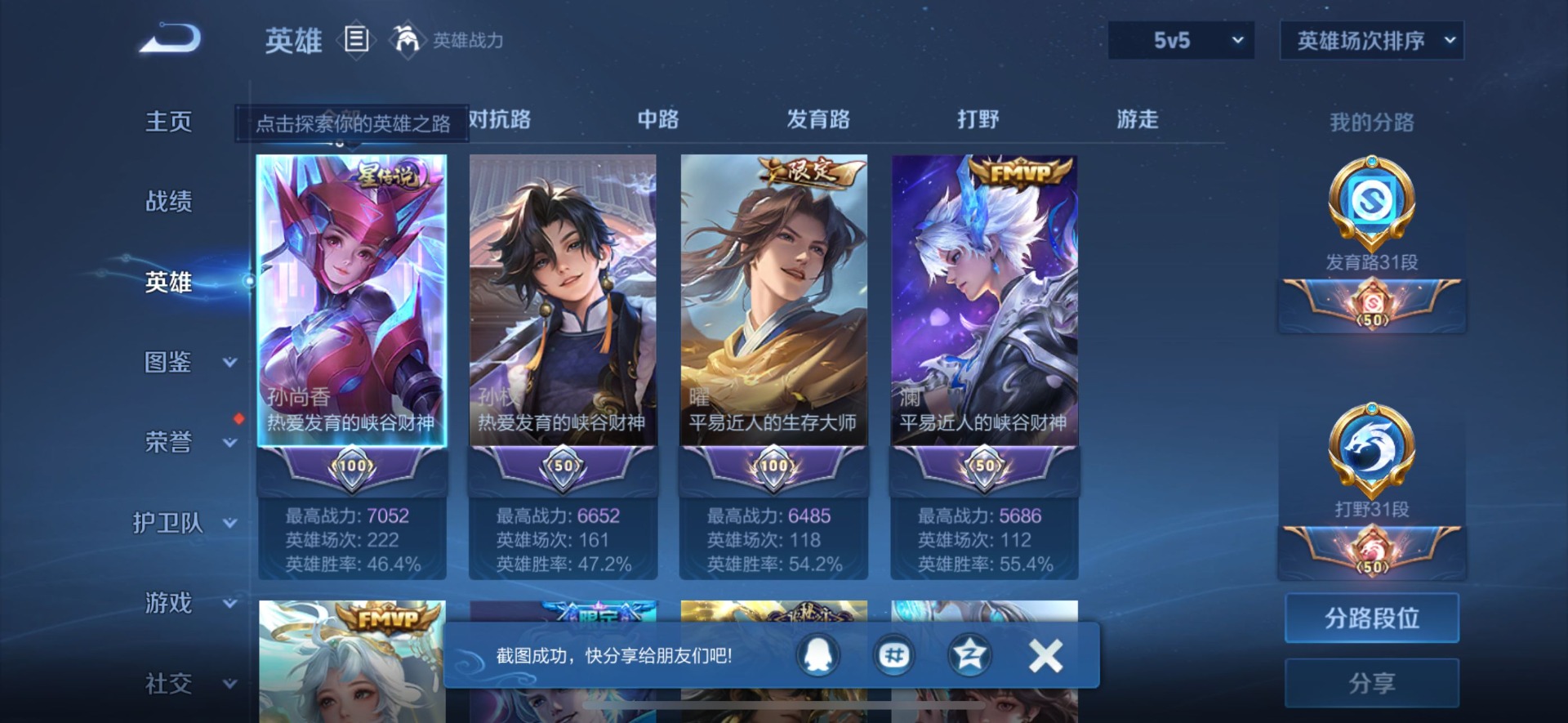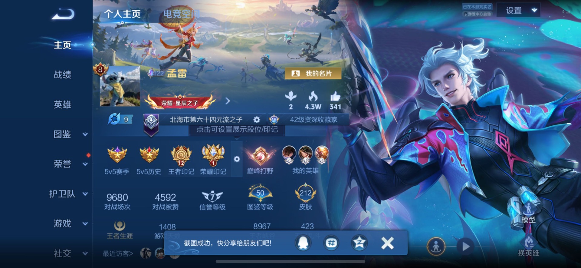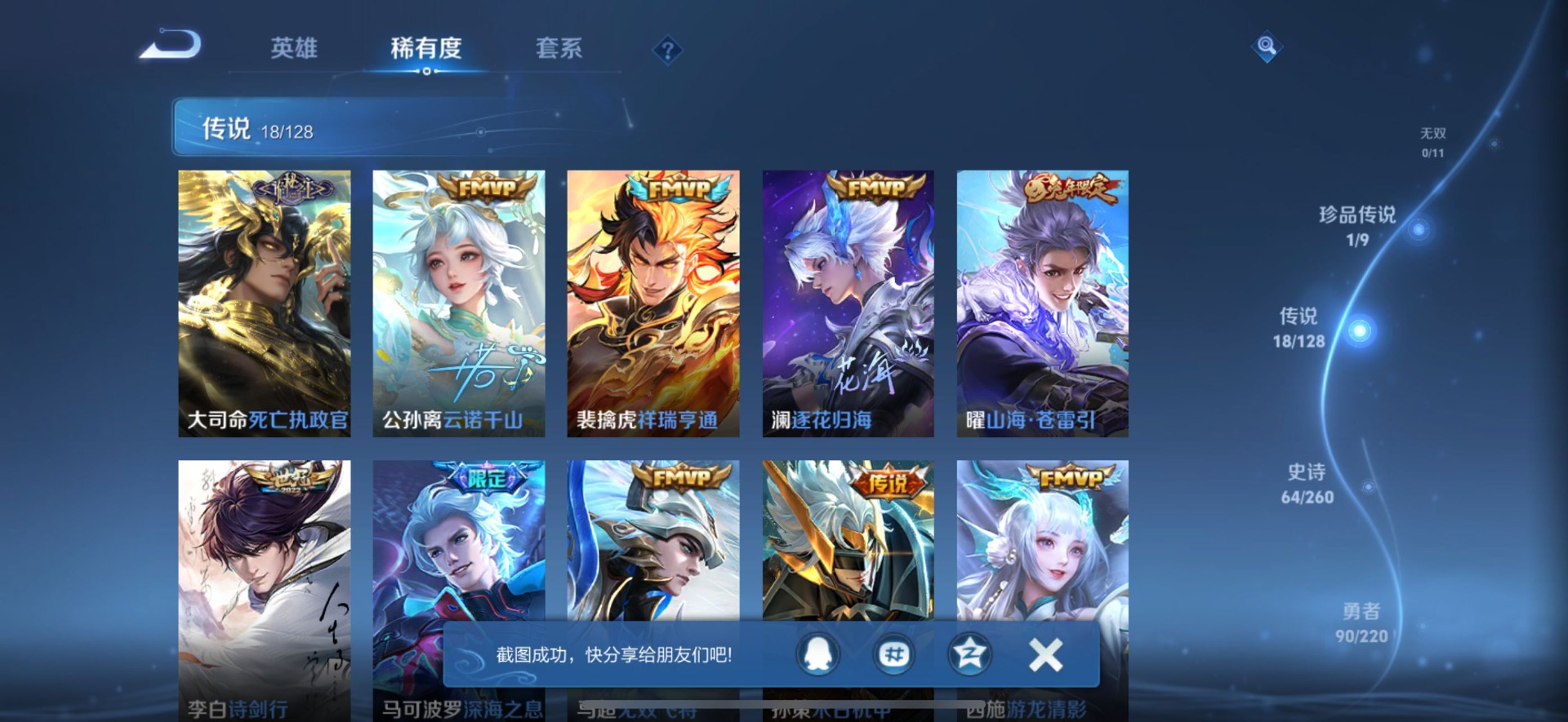- [12030611]V7 4传说 123英雄 133皮肤 可修改实名 优质装备:黄金射手座 传说皮:幻光神枪 珍宝阁皮:妄想食味 限定皮:愿照·岁时盈(虞姬年限),鸣野蒿,五谷丰年,梁祝 史诗皮:器灵·浮梦炉,特工魅影,江河有灵,匿光破解者,末日机甲-吕布,节奏热浪,水果甜心,绅士熊喵,暗隐猎兽者,幽灵船长,鬼剑武藏,心灵战警,乘风破浪,曙光守护者,热力回旋,金属风暴,鹰眼统帅,魅力维加斯,赏金猎手,无心,未来纪元-赵云,玫瑰异探