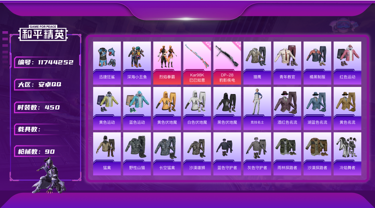 [11744252]1粉装 2特效枪 3印记 可二次 可修改实名 优质装备:Kar98K-巳巳如意 热门装扮:烈焰拳霸,迅捷狂鲨,深海小丑鱼 稀有枪皮:DP-28-豹影疾电 五级特效枪:五级Kar98K-巳巳如意 四级特效枪:四级DP-28-豹影疾电 紫色装扮:SS22特训,SS21特训,人气偶像,冰川特警,冷焰舞者,霓虹热舞,青涩时光,顶瓜瓜,SS20特训,SS15特训,暗夜傀儡,时空追击者,暴风机械师,SS16特训,SS13特训,SS14特训,萌趣颜团子,特种颜团子,SS19特训,军刀雅典娜,吉莉礼服,瑞龙福将,团圆交子,醒狮腾龙,SS17特训,SS18特训,都市魅力,酒红色名流,野性山猫,长空猛禽,雨林探路者,霓虹街区,青年教官,缤纷果语,耀眼新星,荣耀,蓝彩潮人,蓝色守护者,蓝色运动,虎虎生威吉莉,街头潮人,无面战甲,飞行日记,魅力单车,黄色伏地魔,黄色名流,黄色运动,黑色伏地魔,龙的传人,龟仙人,香桃花海,极速红龙,橘黑制服,沙漠探路者,沙漠雄狮,深蓝色名流,幻影武者,夏日音浪,完美偶像,帅气教官,幻世战舞者,战地督导,战地菁英,湖蓝色名流,绮丽涂鸦,白色伏地魔,破晓战魂,破蛋小黄鸡,福星高照,空投萌叽,竞技达人朋克,红色运动,甜蜜熊情侣,潮流先锋,牛气冲天,灰色守护者,灼焰舞者,炫蓝之夏,燃烧卡路里,牛气满满,猛禽,特战英豪,猎鹰,星途旅人,SS28特训,巳巳如意,森林游猎者,竞技名士,绒宝小鹅,SS24特训(SS24特训套装),SS25特训,大橘大利,粉甜马卡龙,原初圣火,逆风勇士,SS12特训,SS11特训,耀粉歌者,深海来使,绯格组合,萌黄之夏,白糯汤圆,金耀舞者,贵族骑装,冰冻风暴,海上生明月 优质战备:星途旅人降落伞,月影灵韵降落伞,垂柳戏鸭降落伞