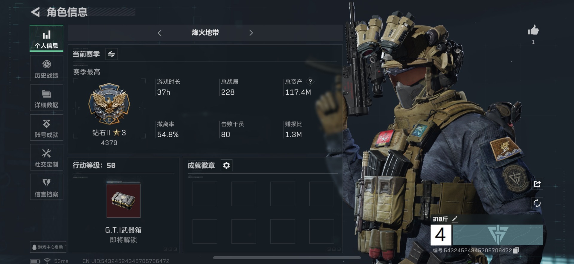 [11744388]总资产:117.4M 10传说枪械 哈夫币:99.772K 可二次 可修改实名 烽火地带段位:钻石 全面战场段位:无段位 传说武器皮肤:SMG45冲锋枪-骑士,M16A4突击步枪-狩猎时刻,AWM狙击步枪-捞点薯条,腾龙突击步枪-捞点薯条,93R-捞点薯条,勇士冲锋枪-能天使-午夜邮差,Vector冲锋枪-狩猎时刻,Vector冲锋枪-能天使-午夜邮差,G3战斗步枪-狩猎时刻,CAR-15突击步枪-阿米娅 史诗武器皮肤:QJB201轻机枪-Old Habits,M1014霰弹枪-林中猎手,勇士冲锋枪-深海恐惧,SG552突击步枪-深海恐惧,AKM突击步枪-林中猎手,M16A4突击步枪-竞赛选手,SV-98狙击步枪-林中猎手,SV-98狙击步枪-囚徒,P90冲锋枪-紧急戒备