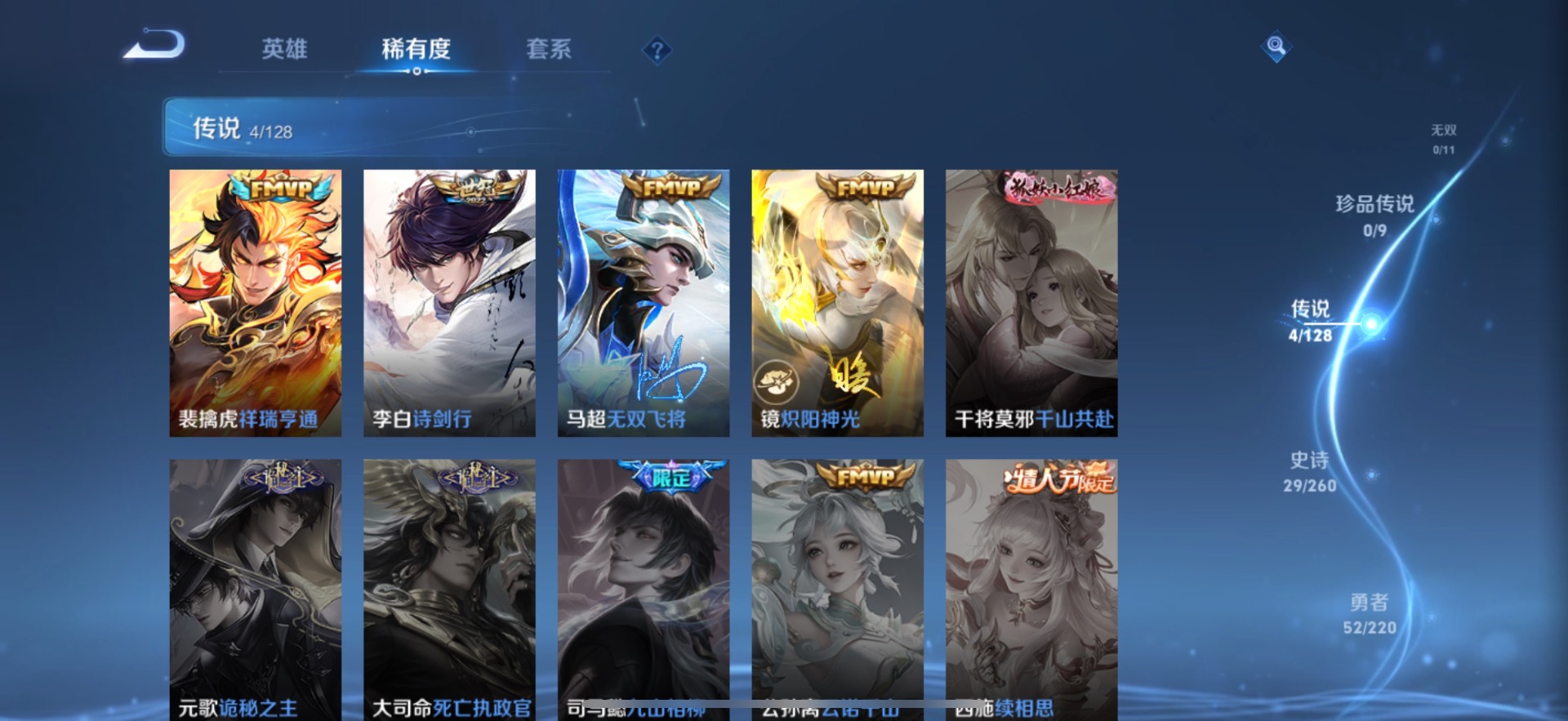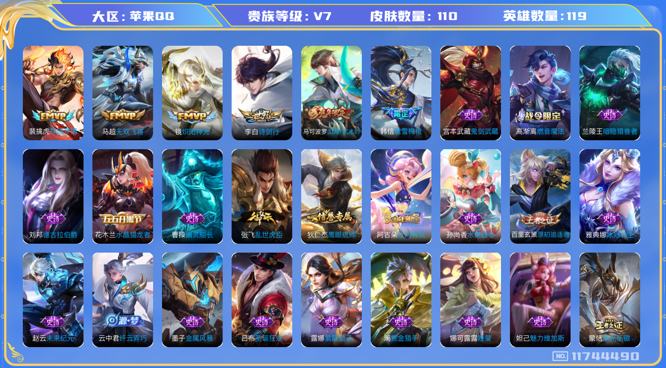 - [11685247]V7 1典藏 5传说 124英雄 257皮肤 可修改实名 优质装备:九霄神辉(木兰典藏),黄金狮子座,无双飞将 珍宝阁皮:蔷薇恋人,女武神 限定皮:愿照·九州拓(澜年限),鸣野蒿,傲雪梅枪,时雨天司(水龙头),神威(电光马子),飞衡(韩信年限),遇见飞天,高山流水,五谷丰年,游园惊梦,梁祝,天狼狩猎者,李小龙,逐梦之影,朱雀志(守约年限),猪悟能,大圣娶亲,引擎之心,冰霜恋舞曲 史诗皮:星界战将,龙之律动,藏狐·褐绒,破空之剑,紫霞仙子,苍穹之光,白龙吟,黄金分割率,特工魅影,千年之狐,永昼,电玩·爆裂旋风,江河有灵,蒙恬荣光圣徽,偶像歌手,龙骑士(小龙虾),暗夜猫娘,魅语,晚萤,青蛇,末日机甲-吕布,猫狗日记-孙策,节奏热浪,修罗,水果甜心,天才门将,星夜王子,心灵骇客,暗隐猎兽者,幽灵船长,鬼剑武藏,舞动绿茵,繁星吟游(呼啦呼啦),乘风破浪,逐浪之夏,水晶猎龙者,曙光守护者,箭羽风息,金属风暴,原初追逐者,圣诞狂欢,圣诞恋歌,鹰眼统帅,王者之锤,魅力维加斯,黎明之约,赏金猎手,未来纪元-赵云