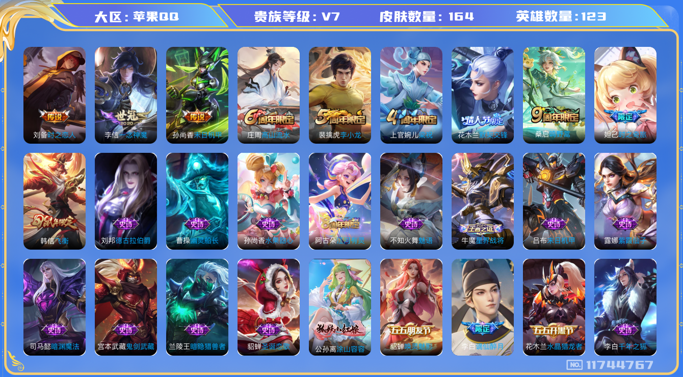 [11744767]V7 4传说 123英雄 164皮肤 可修改实名 优质装备:一念神魔,末日机甲-孙尚香(绿蚂蚱),时之恋人-刘备(电焊工),涂山容容 珍宝阁皮:蔷薇恋人 限定皮:鸣野蒿,飞衡(韩信年限),高山流水,梁祝,李小龙,默契交锋-花木兰,时之奇旅-妲己 史诗皮:星界战将,谪仙醉月,织梦人,遇见神鹿,紫霞仙子,千年之狐,江河有灵,魅语,蒙恬荣光圣徽,末日机甲-吕布,修罗,女仆咖啡,水果甜心,心灵骇客,德古拉伯爵,暗隐猎兽者,幽灵船长,鬼剑武藏,暗渊魔法,舞动绿茵,水晶猎龙者,唤灵魅影,金属风暴,原初追逐者,圣诞恋歌,鹰眼统帅,暗夜贵公子,魅力维加斯,黎明之约,赏金猎手,未来纪元-赵云