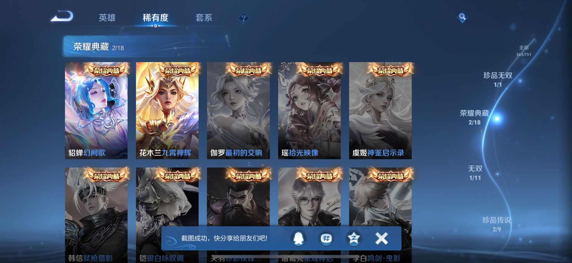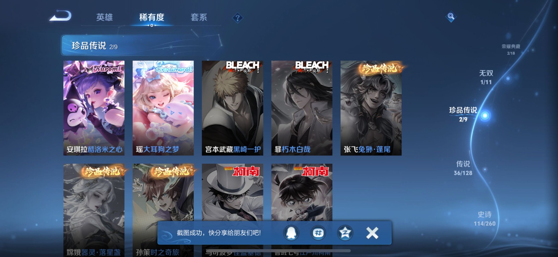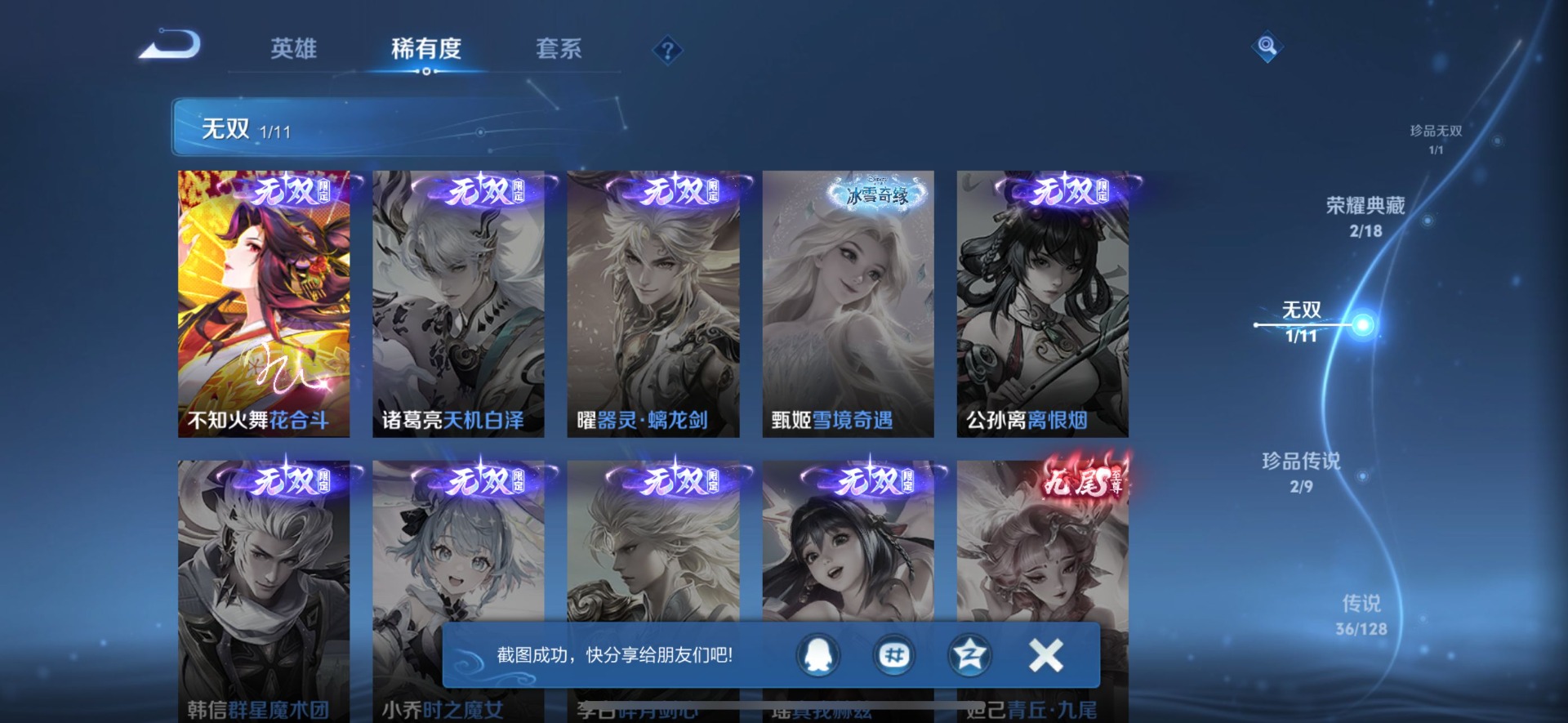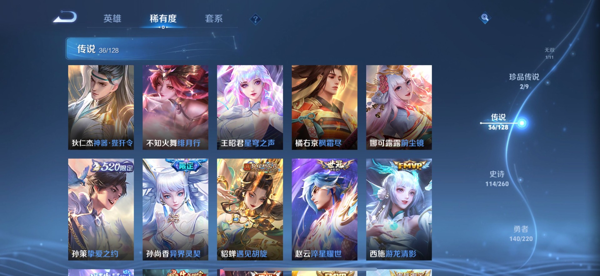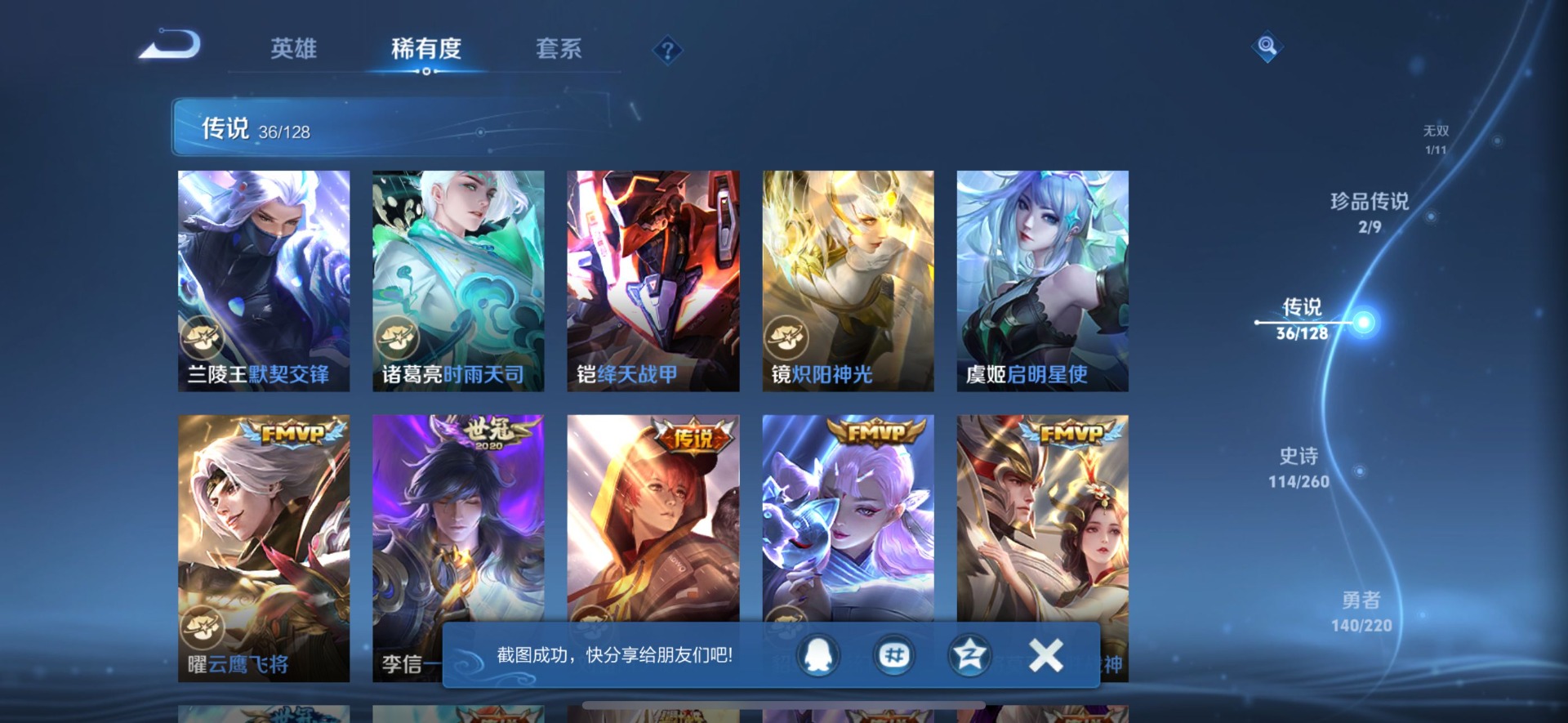 - PX_2073012-【蛇年限定全!】贵族等级: V7 英雄数: 122 皮肤数: 178 珍品传说: 兔狲·蓬尾 星传说: 幽冥之眼 传说皮: 浮生妄,妄想实况,澜逐花归海,幻光神枪 限定皮: 飞衡,五谷丰年,怒海麟威,山海·玄木吟,鸣野蒿,愿照·千秋盛,愿照·众生和,愿照·山河定,愿照·岁时盈,愿照·福禄聚,愿照·九州拓