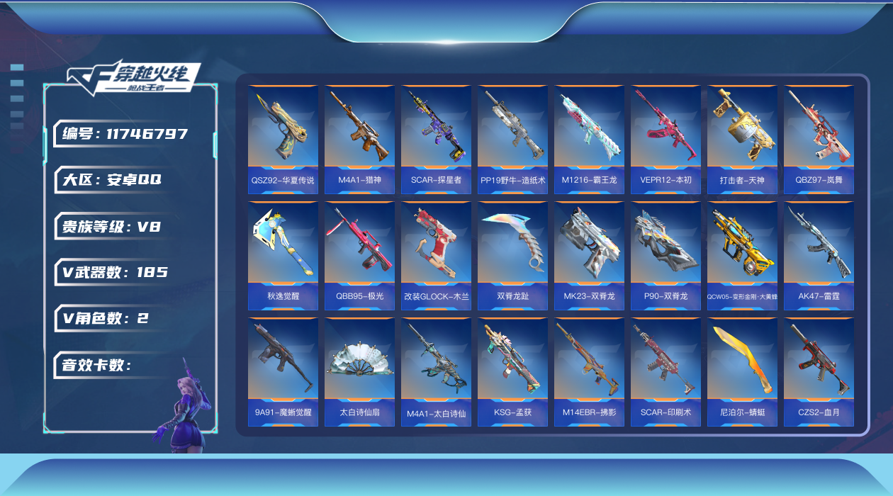 [11746797]V8 可二次 可修改实名 V8 5王者武器 185英雄武器 2英雄角色 296万化 专家 武器:王者之圣,王者之兽,王者之狱,M4A1-仲达,VEPR12-本初,AK47-奉先,M4A1-星象,MK47-云舞,KSG-孟获,SCAR-文远,AK47-策,COP 357-堕天神,COP 357-雷霆,M4A1-竞界荣光,M4A1-堕天神,M4A1-雷霆,M4A1-哈迪斯,AK47-黑武士觉醒,AK47-无影,AK47-变色龙,AK47-火麒麟,AK47-无影-葵,M4A1-游骑兵-香香,AK47-波塞冬,AK47-木兰,M4A1-黑龙,M4A1-黑骑士,M4A1-死神,M4A1-雷神,MK47-机械纪元,AWM-游骑兵,QBB95-极光,MG36-黑骑士,双持斯泰尔-天使,MK5-极光,QCW05-死神,P90-双脊龙,亡命之徒-幻兽,VEPR12-宙斯,M4A1-心动次元觉醒,M4A1-龙血,M4A1-运输船,M4A1-赛博雷神,M4A1-海骑士,AK47-猩红传说,AK47-耀金伯爵,AK47-幸运日觉醒,M4A1-猎神,M4A1-千变,AK47-雷麒麟,AK47-心动次元觉醒,AK47-血武士,AK47-华夏传说,AK47-春雅,M4A1-卧龙觉醒,M4A1-Rush-夜袭,激光毁灭者Ⅲ,M4A1-夏清,SCAR-幽暗骑士觉醒,AN94-超新星,SCAR-探星者,AN94-四凶觉醒,9A91-天神,QBZ97-岚舞,MK47-鼓龙,AA12-火药,M1216-霸王龙,KSG-火力竞放,KSG-极光,SCAR-印刷术,QCW05-变形金刚·大黄蜂,加特林-蟒蛇,寒霜烈龙,加特林-堡垒觉醒,刘易斯-血月,CBJ-MS-毒蜂,打击者-天神,CZS2-血月,CZS2-心动次元觉醒,PP19野牛-造纸术,AK47-雷霆,AK47-破空冰刃,M14EBR-拂影,M4A1-太白诗仙,AK47-雅韵青花,9A91-魔蜥觉醒,气手枪-炼狱,蟒蛇-奉先,丈八蛇矛,墨刃-幻神,沙鹰-修罗,USP-机械迷城,双管猎枪-哈迪斯,MK23-机械纪元,MK23-双脊龙,QSZ92-天使,QSZ92-华夏传说,M16-恶魔,左轮-竞界荣光,沙鹰-波塞冬,沙鹰-宇航兔兔,沙鹰-幻兽,沙鹰-修罗-铁骑,改装GLOCK-木兰,毛瑟-毒蜂,GLOCK18-宙斯,USP-太白诗仙,尼泊尔-雷霆,