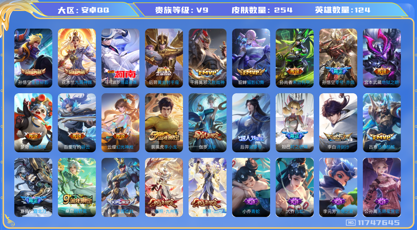 [11747645]【商品标题】:安卓Q-V9-至尊星耀IV段位-124英雄-254皮肤-2典藏-0珍品无双-0无双-1珍品传说-17传说-63史诗