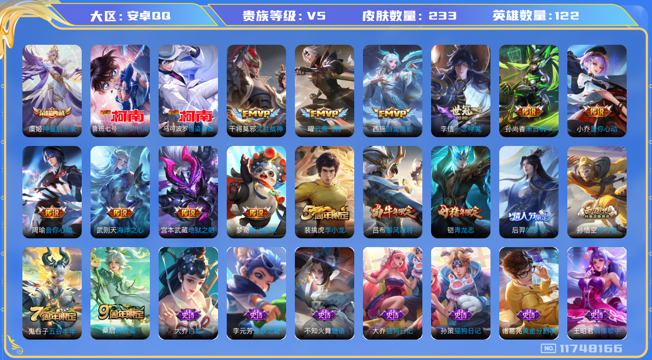 [11748166]【商品标题】:安卓Q-V5-至尊星耀IV段位-122英雄-233皮肤-1典藏-0珍品无双-0无双-2珍品传说-11传说-61史诗