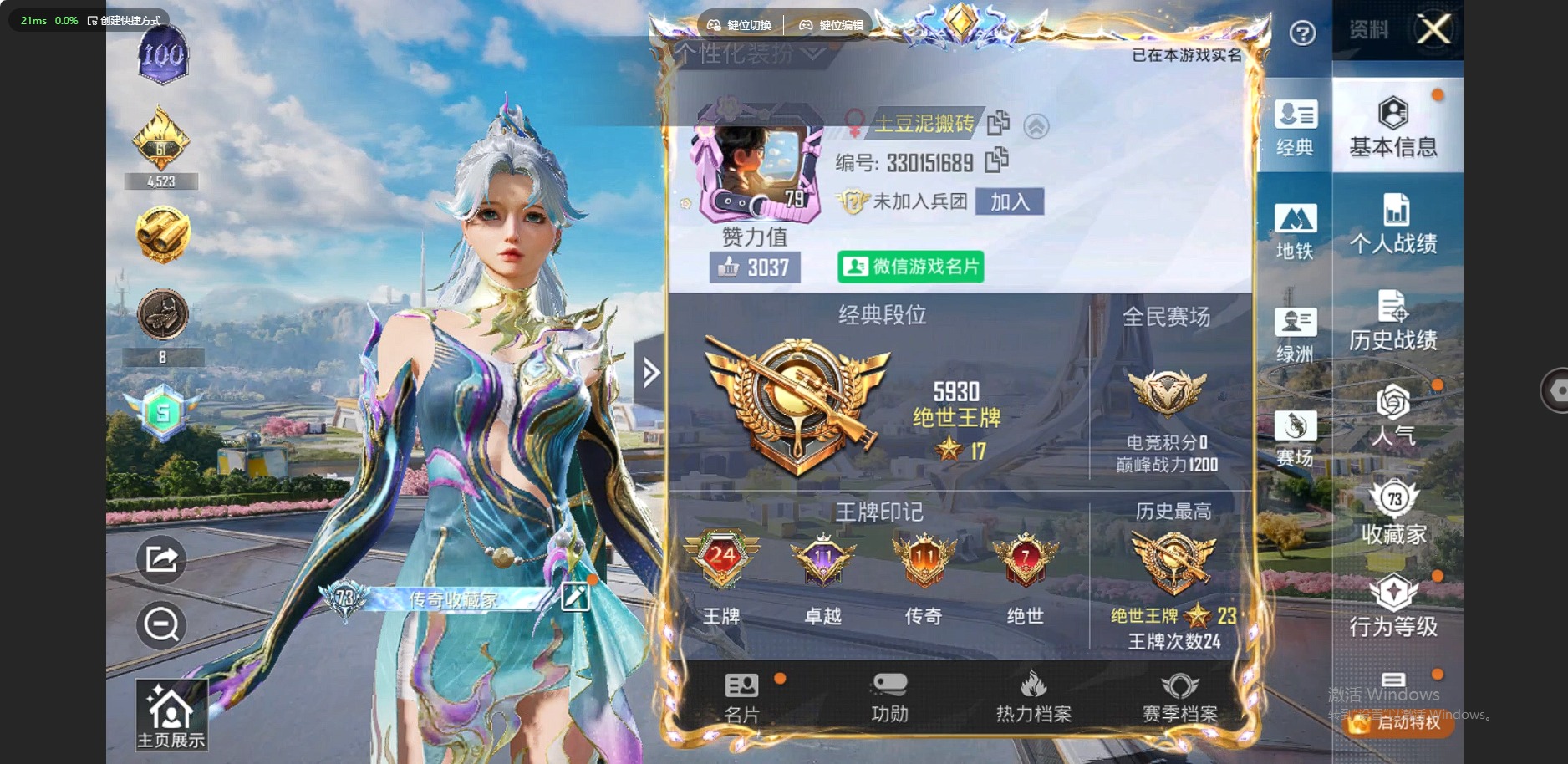 - [10716922]实名: 可修改 时装数: 784 载具数: 1 枪械数: 241 战备数: 168 热门装扮: 梦幻火箭(新101),浪漫波比,梦魇先生,锦绣火鲤,星之彼岸,蓝莓炮弹,太空嘟嘟,动感兔斯基,暗夜鎏金,莲影清波 载具: 兰博基尼URUS(明艳黄) 稀有枪皮: 黄金龙骨SCAR-L,MK14闲梦青缨,Kar98K-巳巳如意,DP-28-豹影疾电
