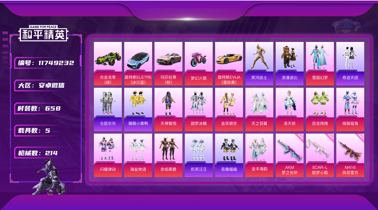 [11749232]12粉装 12特效枪 5载具 24印记 可二次 可修改实名 身法装备:冥河战士(老木乃伊),Mark.06(新蓝螳螂),萌熊伴侣背包(粉熊背包) 优质装备:冥河战士(老木乃伊),木乃伊套装(老)(冥河战士),雪国幻梦(冰雪女王),玛莎拉蒂Ghibli(粉),合金龙骨(绿),路特斯ELETRE(冰川蓝),路特斯EVIJA(星际黄),萌熊伴侣背包(粉熊背包),M416心之恋语,天禅智恒,AKM梦之光华,甜梦冰蝶,M416风花雪月,洛天依,GROZA焦糖拿铁,SCAR-L青春物语,UMP45恐龙拽拽,SCAR-L甜梦小狐,DP-28幻梦音符,M762冷魅冰骑,AWM橘柚倾心,七级SCAR-L-甜梦小狐,七级GROZA-焦糖拿铁,七级M416-风花雪月,七级AKM-梦之光华,Kar98K-巳巳如意 热门装扮:金风银杏,天之羽翼,海盐物语,恐龙拽拽,赤焰黑爵,绚丽摇曳,闪耀律动,金丰海韵,奇迹天团,奶芙汪汪,恶魔喵喵,潮萌小黄鸭,仓鼠灰灰,浪漫波比 载具:双人摩托-梦幻火箭 稀有枪皮:DP-28-豹影疾电 五级特效枪:五级Kar98K-巳巳如意,五级DP-28-豹影疾电 三级特效枪:三级M762-冷魅冰骑 二级特效枪:二级UMP45-恐龙拽拽,二级DP-28-幻梦音符,二级AWM-橘柚倾心 一级特效枪:一级M416-心之恋语,一级SCAR-L-青春物语 紫色装扮:田园牧歌,轻风白浪,莱茵河畔,SS23特训,幻彩翩翩,妙红点点,娇憨猪猪,萌趣咩咩,SS31特训套装,S6赛事,SS2特训,SS5特训,人气偶像,决胜时刻,凛冬战士,刚毅裁决者,北国孤狼,千禧之恋,S5赛事,SS30特训套装,SS33特训套装,青涩时光,顶瓜瓜,SS20特训,青春冒险家,潮流游乐家,SS15特训,迪迦奥特曼,闪银刀客,时空追击者,暴风机械师,SS16特训,萌趣颜团子,特种颜团子,微雨春柳,飞驰魅影,音速流光,极速竞梦,SS19特训,豚鼠丹丹,吉莉礼服,甜心亚梦,虚音幻奏,雪兔飞飞,浓情蜜辣,浓情摩卡,瑞龙福将,团圆交子,炫光向阳,沁蓝冰爽,焰山流火,异彩先驱,SS18特训,智慧隐士,双彩绵绵,都市魅力,酷潮明星,长空猛禽,雪山征服者,雪山精英,霓虹极客,霓虹街区,缤纷果语,蓝彩潮人,街头潮人,跃动心情,骑行爱好者,魅力单车,鹤鸣,黄色名流,黑色伏地魔,龙的传人,龟仙人,冰河战士,龙魂突击队,蝶变,香