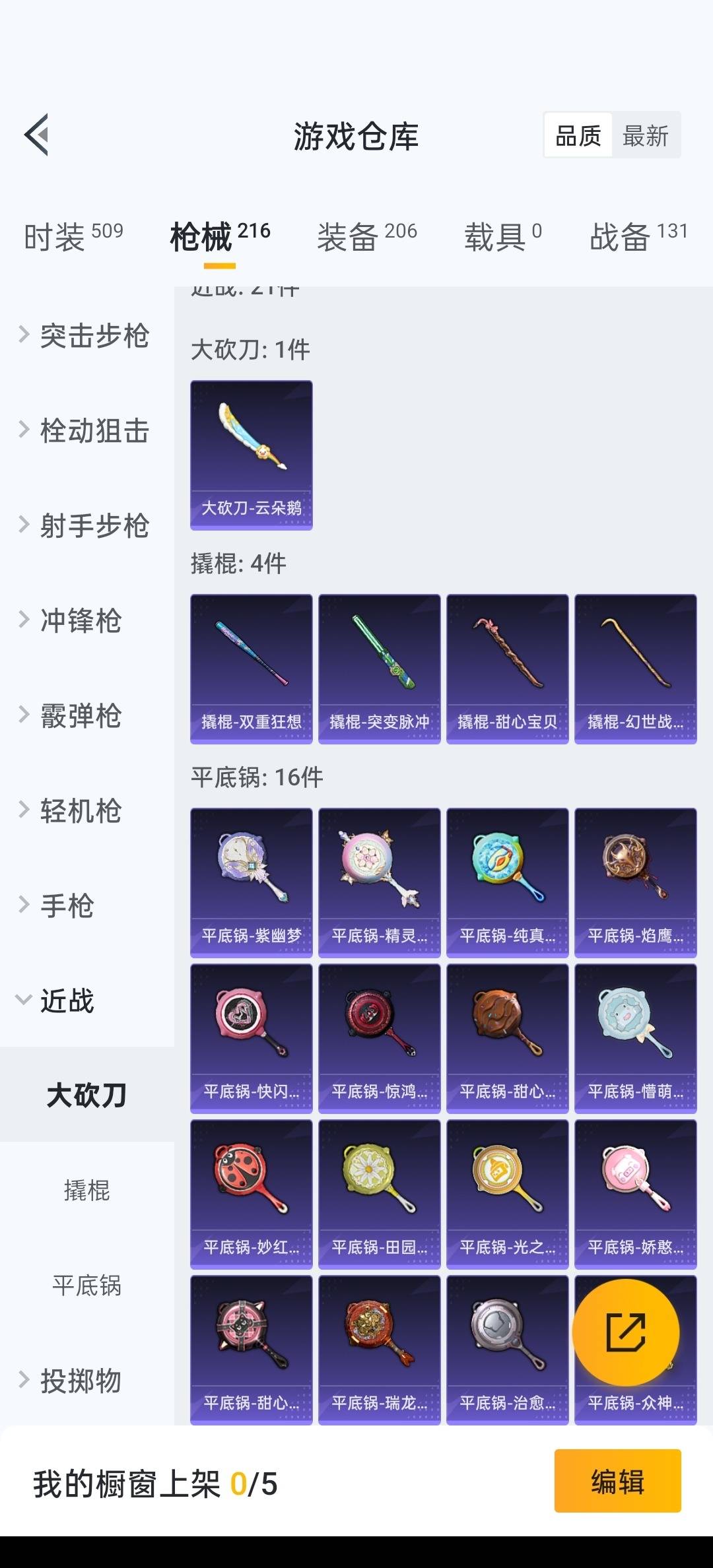 AKM-绿萝繁花,SCAR-L-锦绣绵绵,M416-电玩时刻,GROZA-镜光银凌,AUG-暖羊咩咩,Kar98K-巳巳如意,PKM-守护天翼