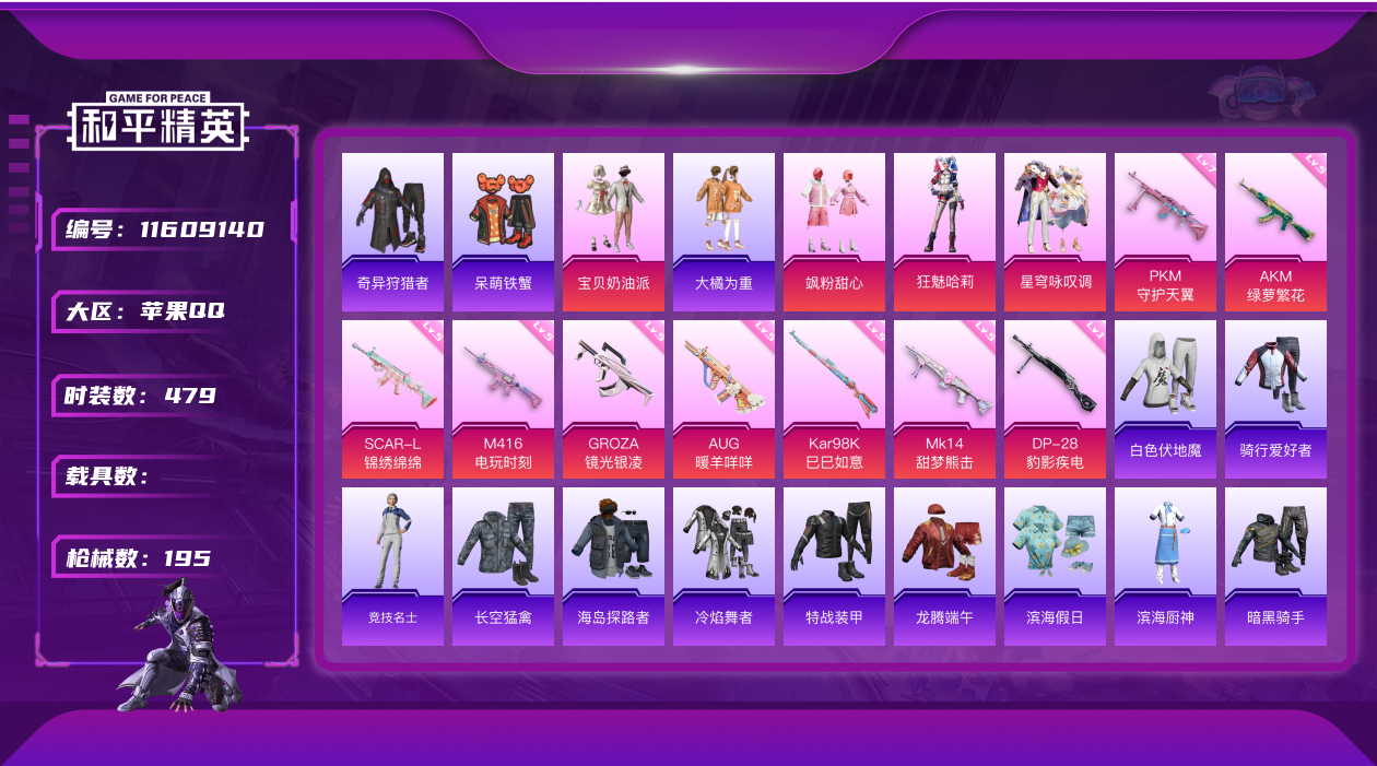 [11609140]4粉装 9特效枪 5印记 可二次 可修改实名 优质装备:奇异狩猎者,宝贝奶油派,AKM绿萝繁花,SCAR-L-锦绣绵绵,M416电玩时刻,七级PKM-守护天翼,PKM-守护天翼,GROZA-镜光银凌,AUG-暖羊咩咩,星穹咏叹调,MK14-甜梦熊击,狂魅哈莉,Kar98K-巳巳如意 热门装扮:飒粉甜心,大橘为重,呆萌铁蟹 稀有枪皮:DP-28-豹影疾电 五级特效枪:五级GROZA-镜光银凌,五级Kar98K-巳巳如意,五级MK14-甜梦熊击,五级AUG-暖羊咩咩,五级M416-电玩时刻,五级SCAR-L-锦绣绵绵,五级AKM-绿萝繁花 一级特效枪:一级DP-28-豹影疾电 紫色装扮:田园牧歌,轻风白浪,和煦暖阳,SS22特训,飞狐塔尔斯,SS23特训,幻彩翩翩,妙红点点,娇憨猪猪,萌趣咩咩,SS21特训,SS31特训套装,人气偶像,冰川特警,冷焰舞者,霓虹热舞,SS30特训套装,云朵鹅,雪绒豹,SS33特训套装,混沌火种,SS20特训,SS15特训,SS16特训,SS13特训,治愈之星,科技之星,SS14特训,萌趣颜团子,特种颜团子,英勇保护者,吉莉礼服,甜心亚梦,虚音幻奏,瑞龙福将,团圆交子,SS17特训,SS18特训,野性战心,长空猛禽,荣耀,荧惑魅影,蓝彩潮人,虎虎生威吉莉,街头潮人,飞行日记,龙腾端午,骑行爱好者,魅力单车,鹤鸣,麻辣教官,龙的传人,冰河战士,龙魂突击队,香桃花海,极地朋克,柠萌假日,格斗先锋,海岛探路者,涂山之恋,深蓝色名流,暗黑骑手,滨海假日,幻世战舞者,怒火燎原,探宝勇士,滨海厨神,白熊同盟,白色伏地魔,破晓战魂,竞技达人朋克,王牌教练,牛气冲天,热血青春,牛气满满,特战装甲,星途旅人,纯真浪花,热情海星,SS28特训,冰公主,鱼渊荷华,玉兔迎春,燕燕于飞,巳巳如意,竞技名士,街头风暴,怀庆长公主,惊鸿侠骨,神气柴柴,懵萌河马,SS24特训(SS24特训套装),萤火魅影(套装-荧惑魅影),SS25特训,绝对偶像,锦衣飞扬,粉红小猪,焰鹰斗篷,幻羽潜行,SS27特训,小丑鱼,SS26特训,春光漫游,快闪甜心,智谋强哥,核芯基因,大橘大利,星影赞美诗,抹茶蜜豆,智慧之神,SS10特训,SS11特训,蓝冰羽,紫幽梦,SS32特训服(SS32特训套装),青玉碎影,绯格组合,萌黄之夏,白糯汤圆,蓝调潮人,光之冒险,海上生明月 优质战备:星梦奇缘