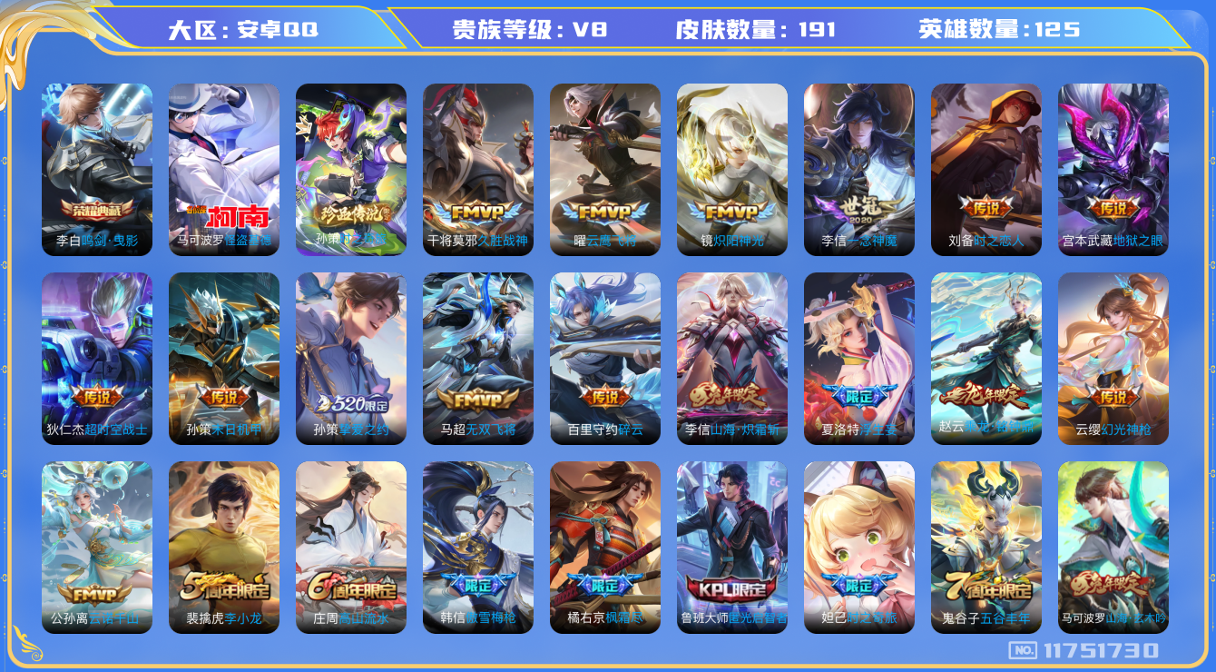 [11751730]【商品标题】:安卓Q-V8-最强王者段位-125英雄-191皮肤-1典藏-0珍品无双-0无双-2珍品传说-23传说-62史诗