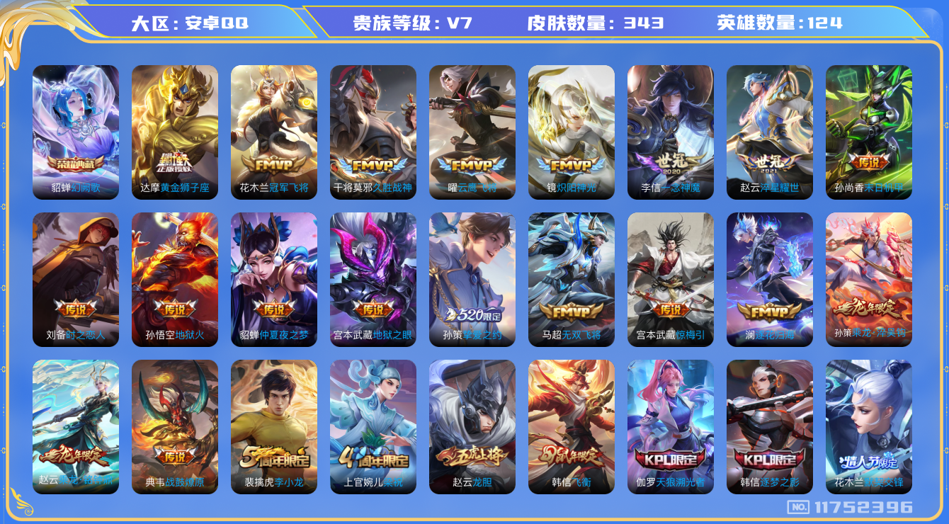 [11752396]【商品标题】:安卓Q-V7-至尊星耀III段位-124英雄-343皮肤-1典藏-0珍品无双-0无双-0珍品传说-22传说-100史诗