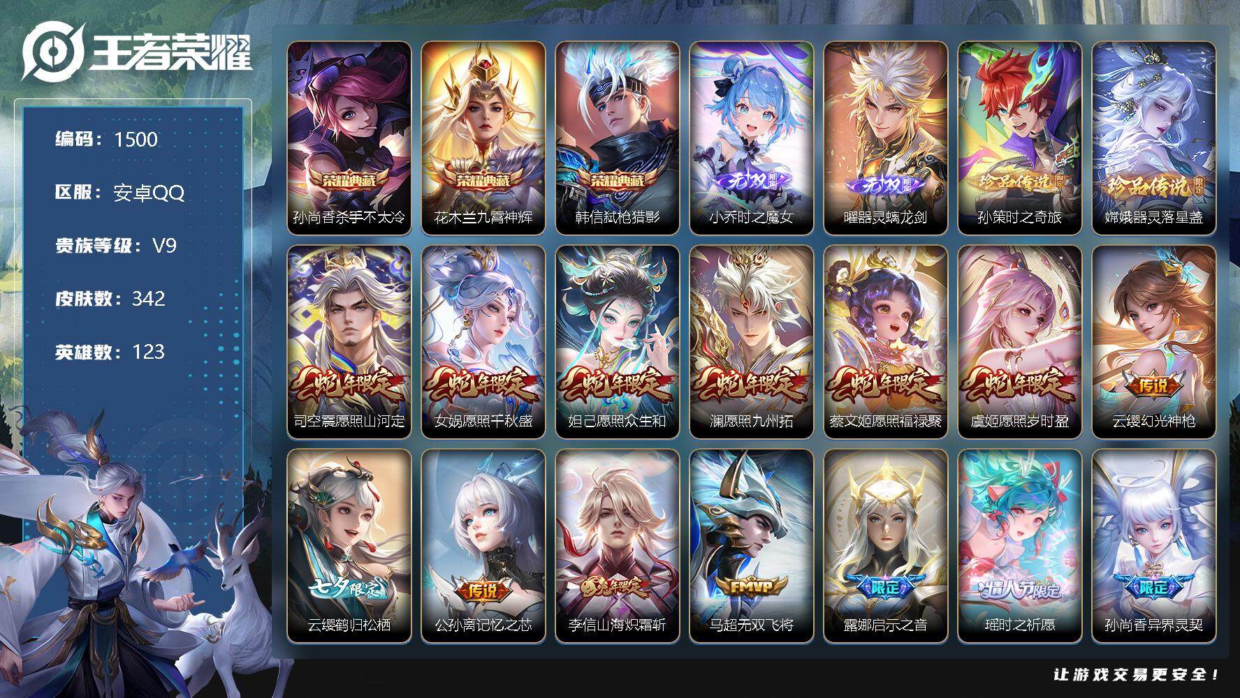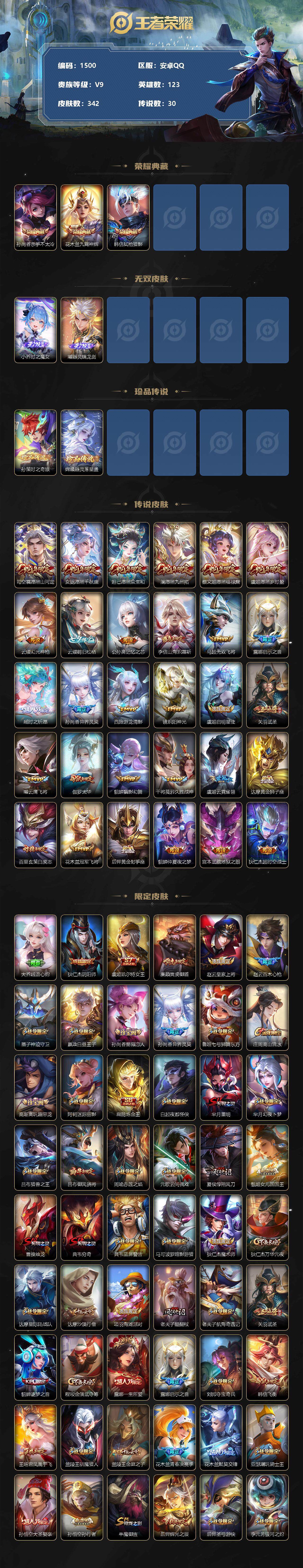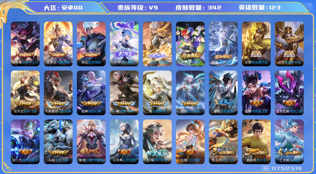[11752514]【商品标题】:安卓Q-V6-永恒钻石V段位-123英雄-342皮肤-3典藏-0珍品无双-2无双-2珍品传说-30传说-111史诗