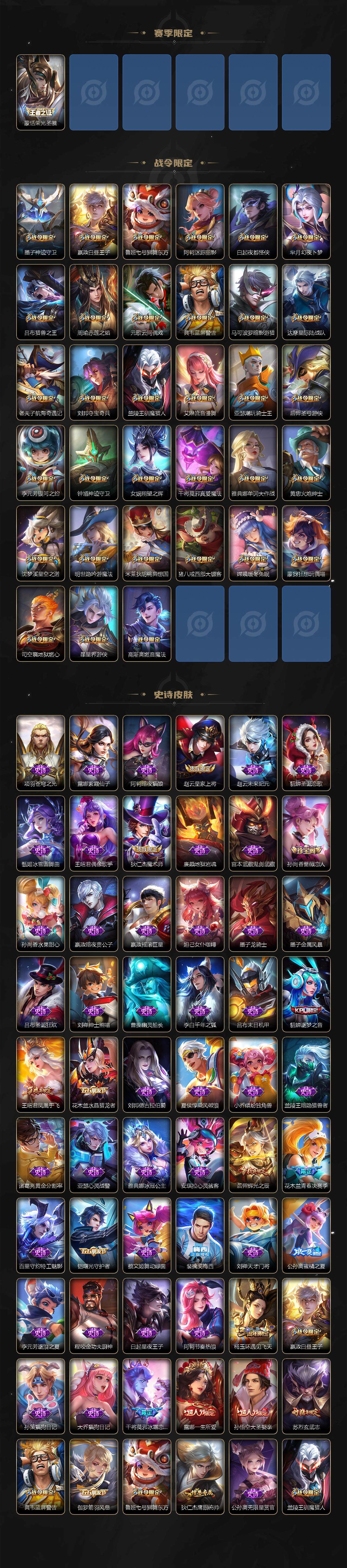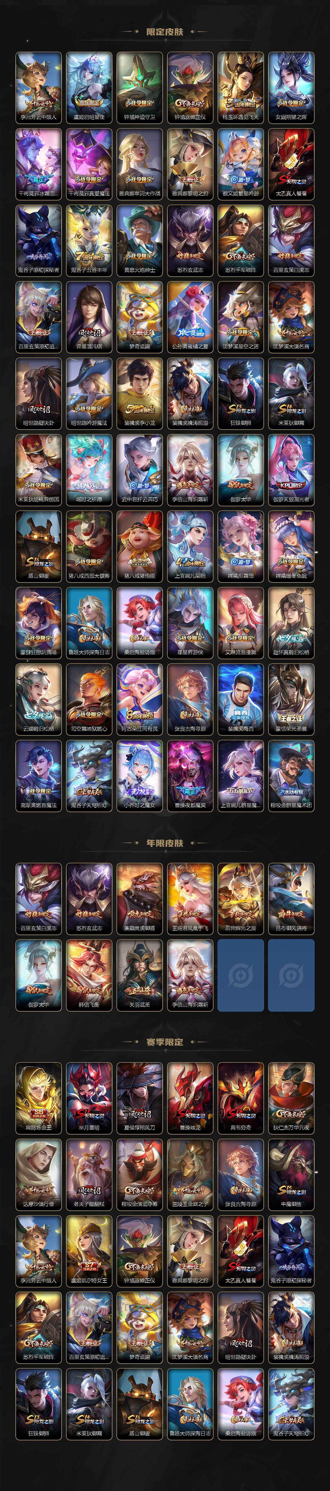 【限定皮肤】:大乔绒语心约,狄仁杰阴阳师,虞姬凯尔特女王,廉颇寅虎御盾,赵云皇家上将,赵云百木心枪,墨子神迹守卫,嬴政白昼王子,孙尚香蔷薇恋人,孙尚香异界灵契,鲁班七号狮舞东方,庄周高山流水,高渐离玩趣恶龙,阿轲迷踪丽影,扁鹊炼金王,白起夜都怪侠,芈月重明,芈月幻夜卜梦,吕布猎兽之王,吕布御风骁将,周瑜赤莲之焰,元歌云间偶戏,夏侯惇朔风刀,甄姬女儿国国王,曹操烛龙,典韦穷奇,典韦蓝屏警告,马可波罗暗影游猎,狄仁杰魔术师,狄仁杰万华元夜,达摩星际陆战队,达摩沙漠行僧,项羽海滩派对,老夫子醍醐杖,老夫子航海奇遇记,关羽武圣,貂蝉逐梦之音,程咬金演武夺筹,露娜一生所爱,露娜启示之音,刘邦夺宝奇兵,韩信飞衡,王昭君凤凰于飞,兰陵王驯魔猎人,兰陵王金庭之子,花木兰青春决赛季,花木兰默契交锋,亚瑟潮玩骑士王,孙悟空大圣娶亲,孙悟空孙行者,牛魔御旌,后羿辉光之辰,后羿圣弓游侠,李元芳银河之约,李元芳云中旅人,虞姬启明星使,钟馗神迹守卫,钟馗驱傩正仪,杨玉环遇见飞天,女娲朔望之晖,干将莫邪冰霜恋舞曲,干将莫邪真爱魔法,雅典娜单词大作战,雅典娜黎明之约,蔡文姬繁星吟游,太乙真人饕餮,鬼谷子原初探秘者,鬼谷子五谷丰年,黄忠火炮绅士,苏烈玄武志,苏烈千军破阵,百里玄策白虎志,百里玄策原初追逐者,弈星混沌棋,梦奇顽趣,公孙离蜜橘之夏,沈梦溪星空之诺,沈梦溪大漠名商,明世隐疑决卦,明世隐吟游魔法,裴擒虎李小龙,裴擒虎擒涛扼浪,狂铁御狮,米莱狄御霄,米莱狄胡桃异想国
