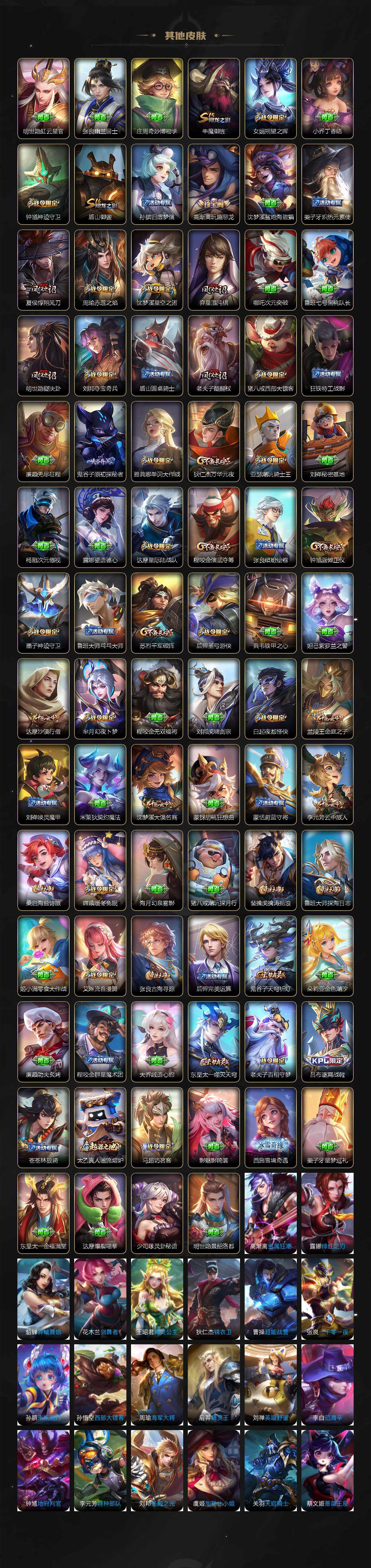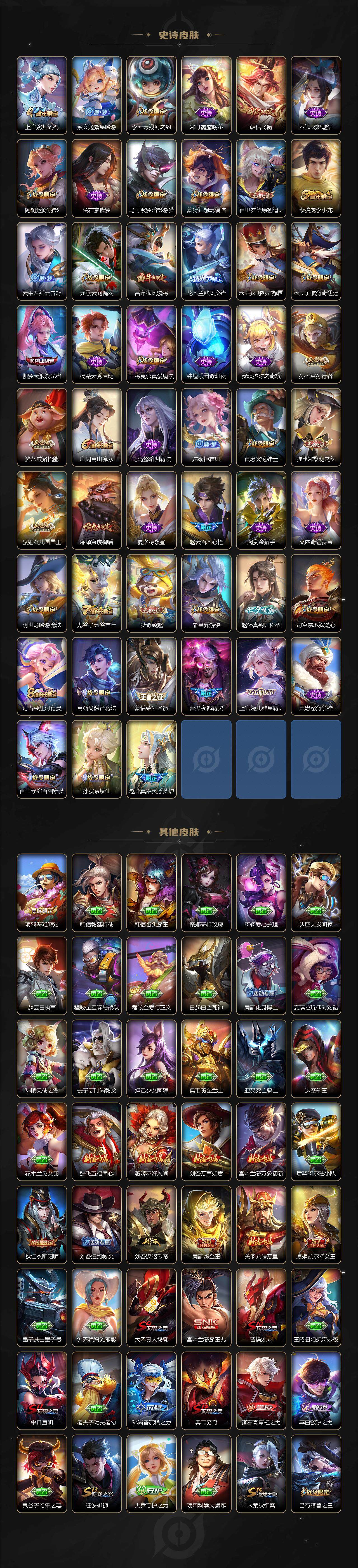 扁鹊炼金王,虞姬凯尔特女王,太乙真人饕餮,曹操烛龙,芈月重明,典韦穷奇,狂铁御狮,米莱狄御霄,牛魔御旌,盾山御銮,夏侯惇朔风刀,明世隐疑决卦,老夫子醍醐杖,鬼谷子原初探秘者,狄仁杰万华元夜,程咬金演武夺筹,钟馗驱傩正仪,苏烈千军破阵,吕布猎兽之王,嬴政白昼王子,女娲朔望之晖,典韦蓝屏警告,钟馗神迹守卫,鲁班七号狮舞东方,沈梦溪星空之诺,李元芳银河之约,刘邦夺宝奇兵,马可波罗暗影游猎,蒙犽狂想玩偶喵,元歌云间偶戏,弈星混沌棋,达摩沙漠行僧,兰陵王金庭之子,沈梦溪大漠名商,李元芳云中旅人,桑启海盐诗旅,裴擒虎擒涛扼浪,鲁班大师探海日志,张良古海寻踪