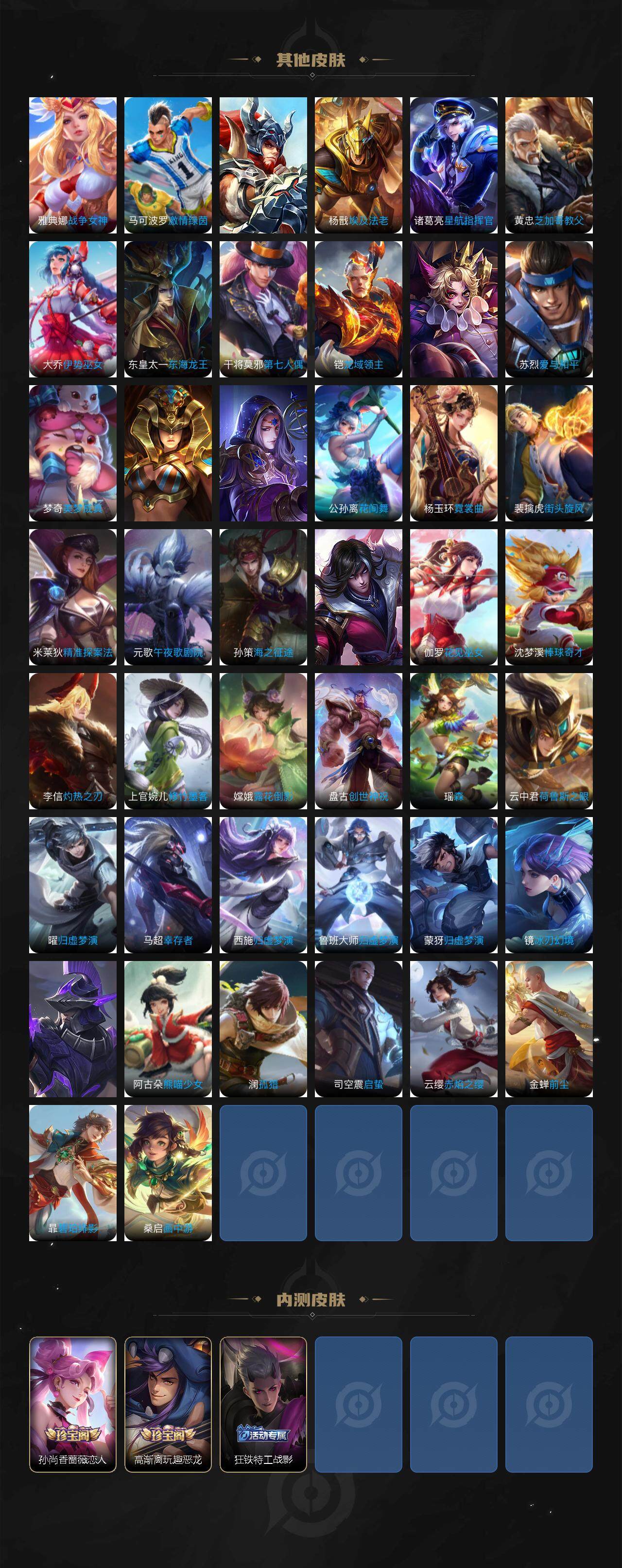 裴擒虎李小龙,上官婉儿梁祝,貂蝉逐梦之音,吕布御风骁将,关羽武圣,后羿辉光之辰,韩信飞衡,伽罗太华,伽罗天狼溯光者,百里玄策白虎志,苏烈玄武志,王昭君凤凰于飞,孙悟空大圣娶亲,露娜一生所爱,花木兰默契交锋,裴擒虎梅西,干将莫邪冰霜恋舞曲,花木兰青春决赛季,公孙离蜜橘之夏,猪八戒猪悟能,廉颇寅虎·御盾,孙尚香异界灵契,孙悟空孙行者,甄姬女儿国国王,瑶时之祈愿,赵云百木心枪,露娜启示之音,澜愿照·九州拓,蔡文姬愿照·福禄聚,虞姬愿照·岁时盈,司空震愿照·山河定,妲己愿照·众生和,女娲愿照·千秋盛