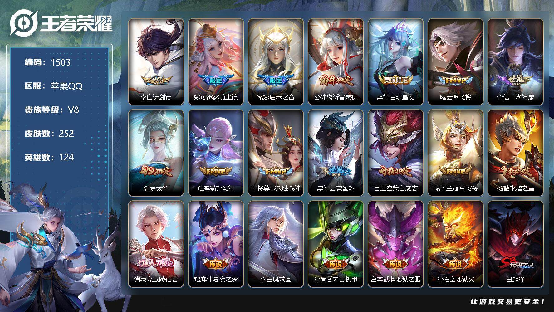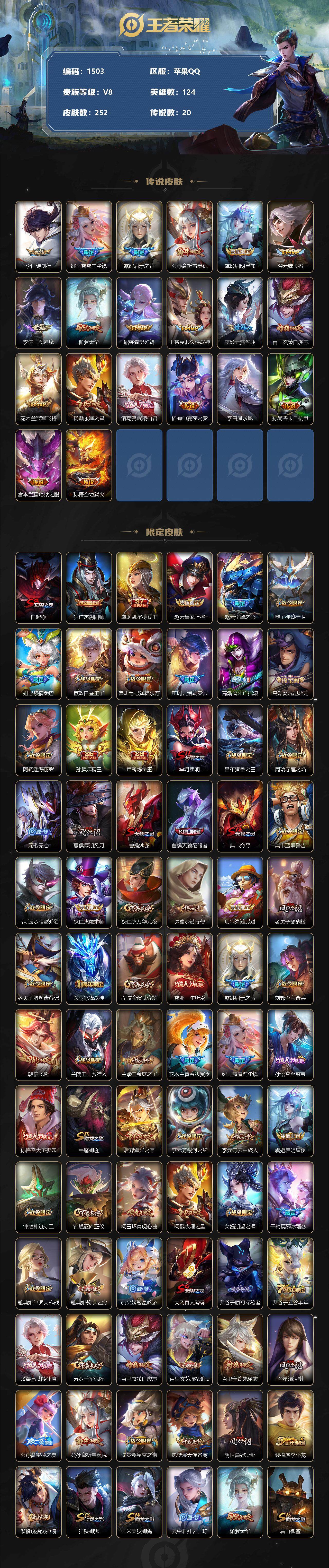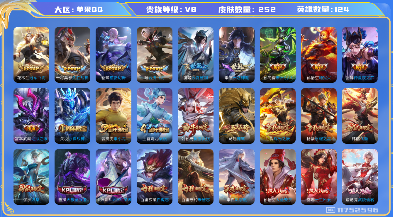 [11752596]【商品标题】:苹果Q-V0-永恒钻石V段位-124英雄-252皮肤-0典藏-0珍品无双-0无双-0珍品传说-20传说-73史诗