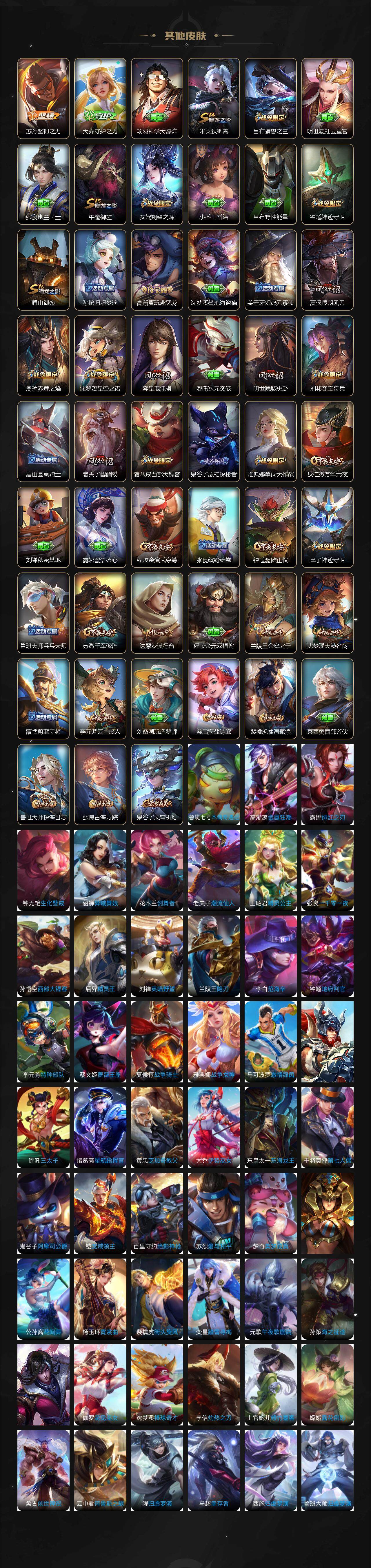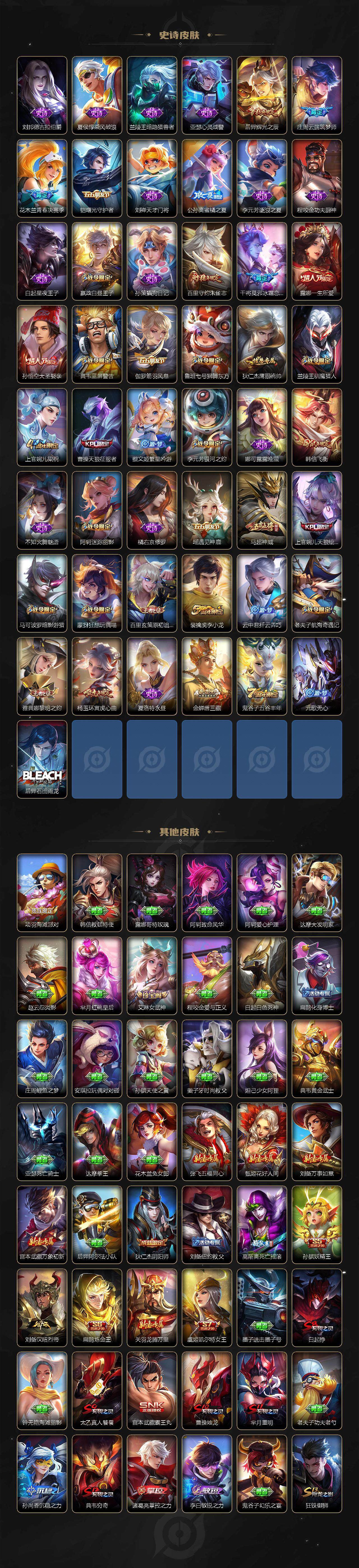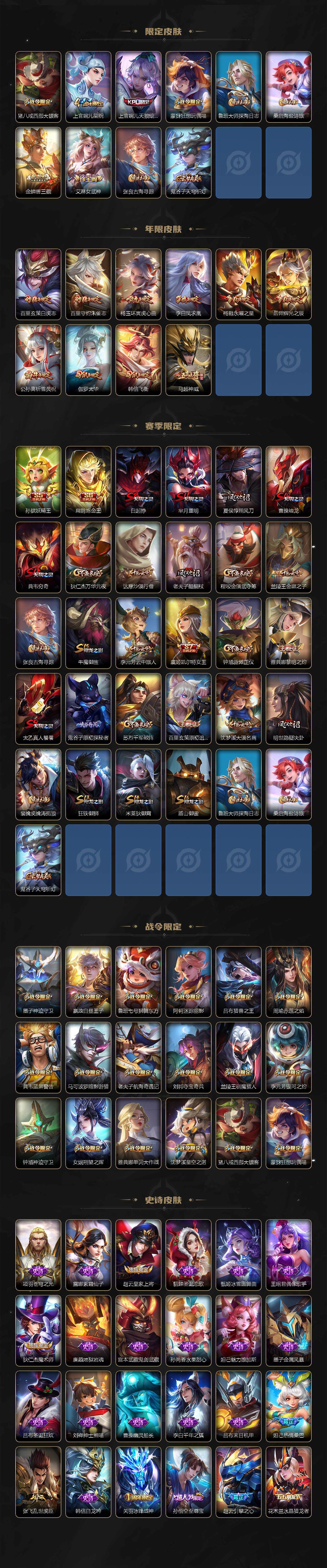 【限定皮肤】:白起狰,狄仁杰阴阳师,虞姬凯尔特女王,赵云皇家上将,赵云引擎之心,墨子神迹守卫,妲己热情桑巴,嬴政白昼王子,鲁班七号狮舞东方,庄周云端筑梦师,高渐离死亡摇滚,高渐离玩趣恶龙,阿轲迷踪丽影,孙膑妖精王,扁鹊炼金王,芈月重明,吕布猎兽之王,周瑜赤莲之焰,元歌无心,夏侯惇朔风刀,曹操烛龙,曹操天狼征服者,典韦穷奇,典韦蓝屏警告,马可波罗暗影游猎,狄仁杰魔术师,狄仁杰万华元夜,达摩沙漠行僧,项羽海滩派对,老夫子醍醐杖,老夫子航海奇遇记,关羽冰锋战神,程咬金演武夺筹,露娜一生所爱,露娜启示之音,刘邦夺宝奇兵,韩信飞衡,兰陵王驯魔猎人,兰陵王金庭之子,花木兰青春决赛季,娜可露露前尘镜,孙悟空至尊宝,孙悟空大圣娶亲,牛魔御旌,后羿辉光之辰,李元芳银河之约,李元芳云中旅人,虞姬启明星使,钟馗神迹守卫,钟馗驱傩正仪,杨玉环寅虎心曲,杨戬永曜之星,女娲朔望之晖,干将莫邪冰霜恋舞曲,雅典娜单词大作战,雅典娜黎明之约,蔡文姬繁星吟游,太乙真人饕餮,鬼谷子原初探秘者,鬼谷子五谷丰年,诸葛亮武陵仙君,苏烈千军破阵,百里玄策白虎志,百里玄策原初追逐者,百里守约朱雀志,弈星混沌棋,公孙离蜜橘之夏,公孙离祈雪灵祝,沈梦溪星空之诺,沈梦溪大漠名商,明世隐疑决卦,裴擒虎李小龙,裴擒虎擒涛扼浪,狂铁御狮,米莱狄御霄,云中君纤云弄巧,伽罗太华,盾山御銮,猪八戒西部大镖客,上官婉儿梁祝,上官婉儿天狼绘梦者,蒙犽狂想玩偶喵,鲁班大师探海日志,桑启海盐诗旅,金蝉唐三藏,艾琳女武神,张良古海寻踪,鬼谷子天穹祈灯