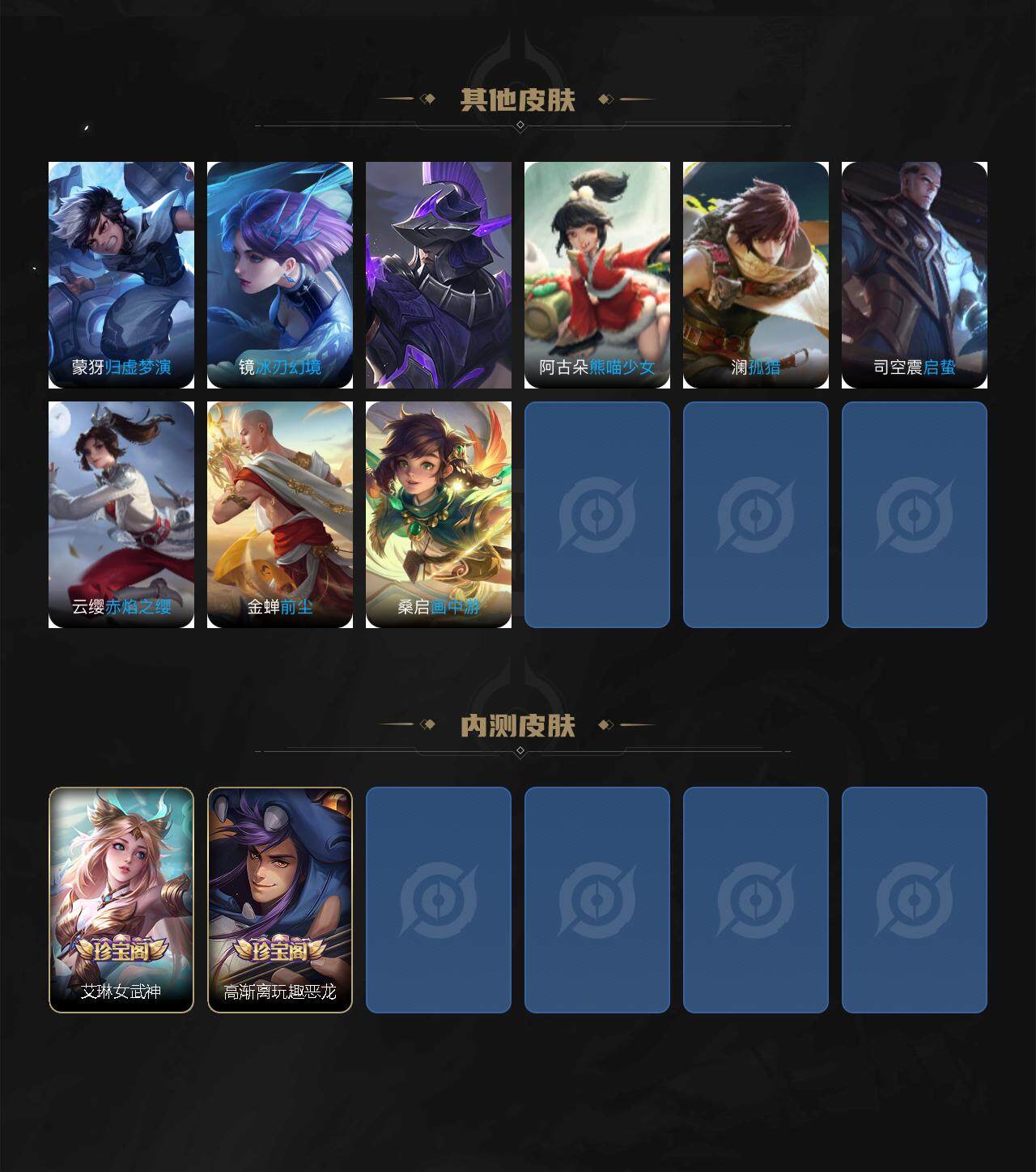 【年限皮肤】:百里玄策白虎志,百里守约朱雀志,杨玉环寅虎心曲,李白凤求凰,杨戬永曜之星,后羿辉光之辰,公孙离祈雪灵祝,伽罗太华,韩信飞衡,马超神威