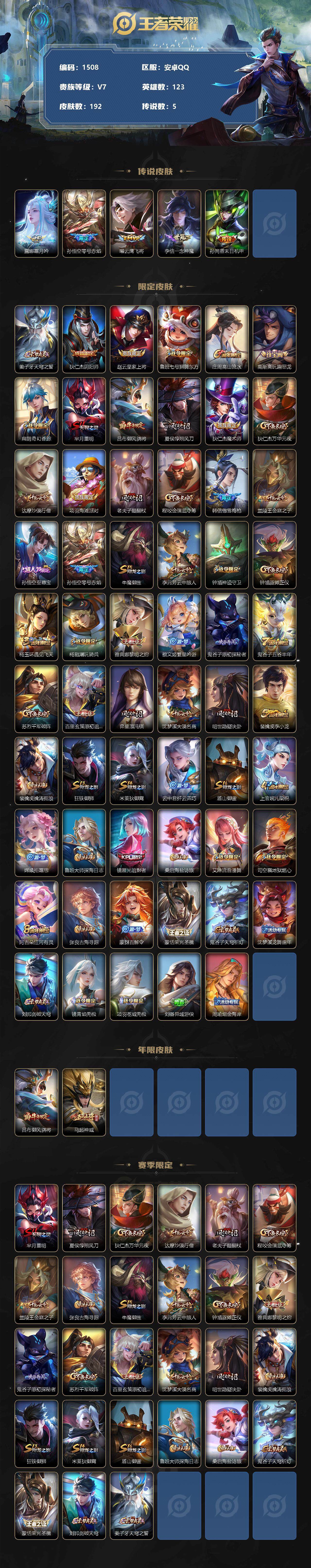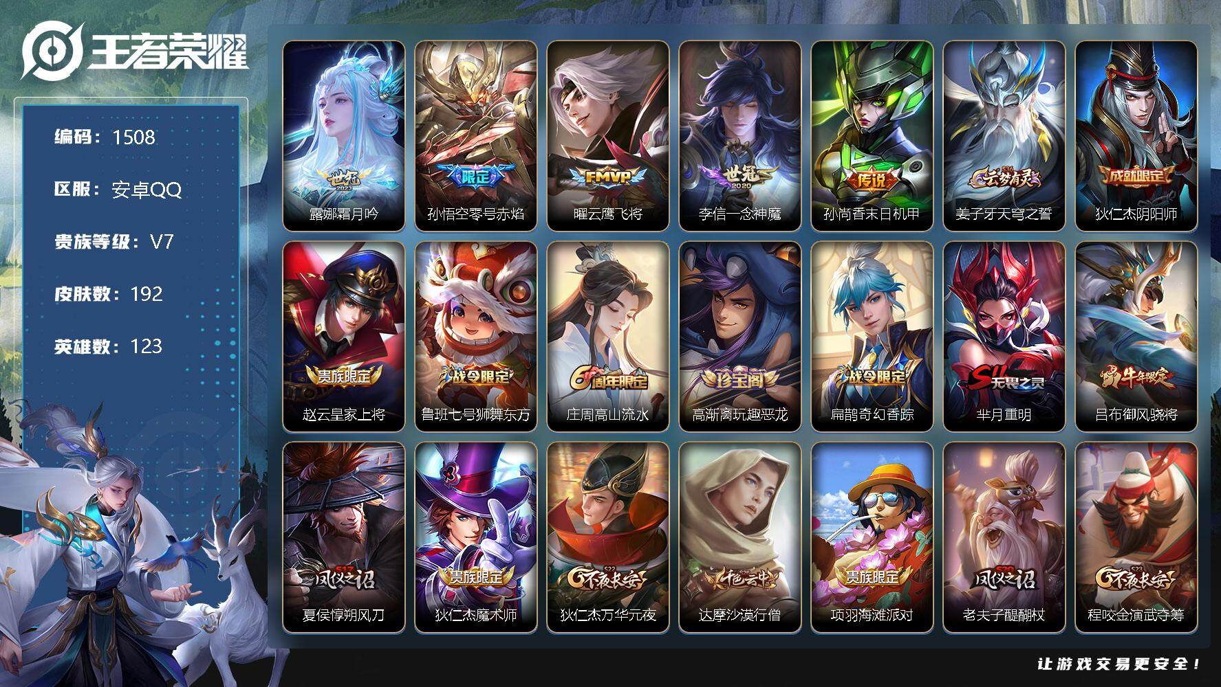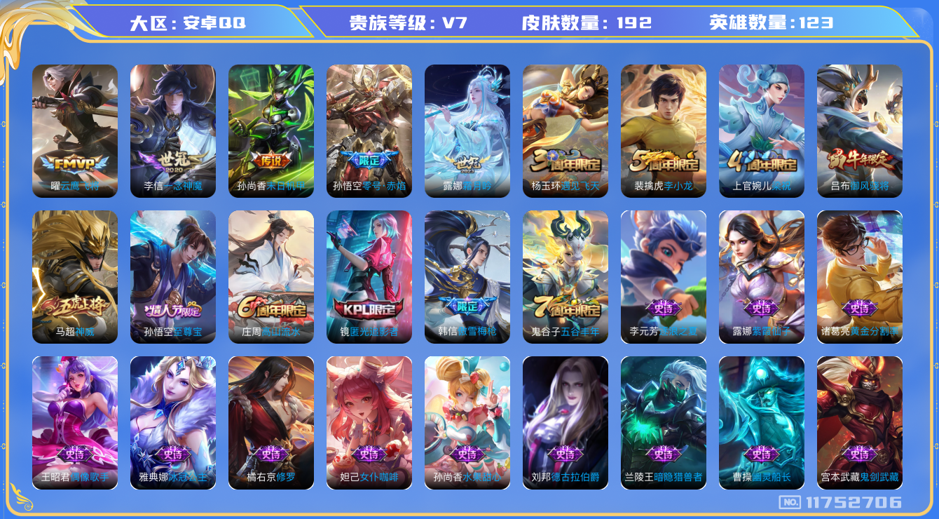 [11752706]【商品标题】:安卓Q-V7-至尊星耀IV段位-123英雄-192皮肤-0典藏-0珍品无双-0无双-0珍品传说-5传说-45史诗