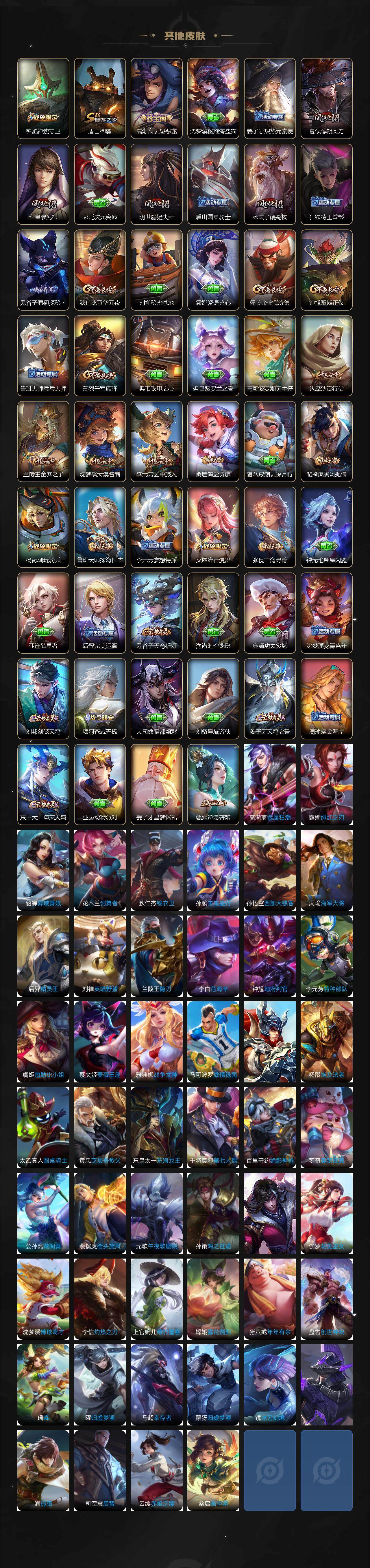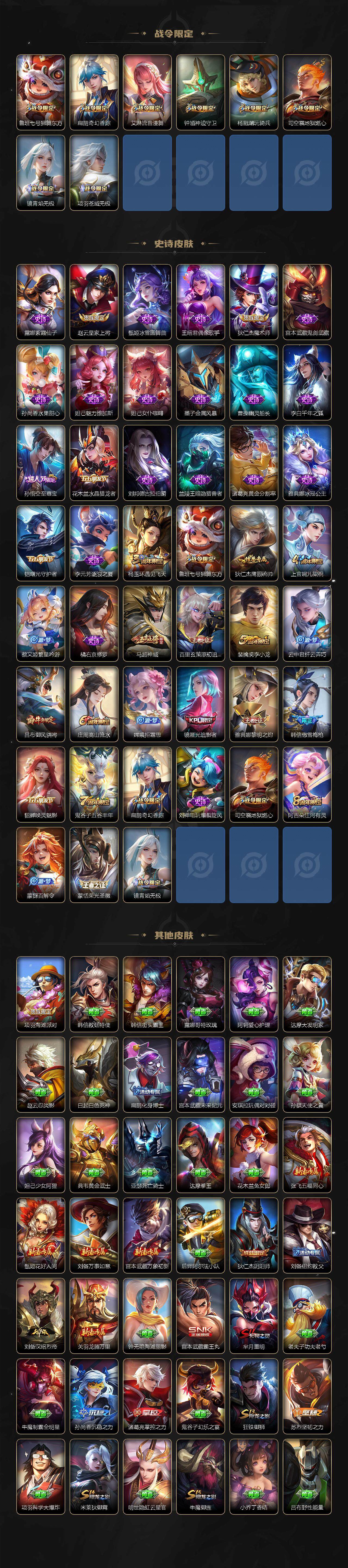 【限定皮肤】:姜子牙天穹之誓,狄仁杰阴阳师,赵云皇家上将,鲁班七号狮舞东方,庄周高山流水,高渐离玩趣恶龙,扁鹊奇幻香踪,芈月重明,吕布御风骁将,夏侯惇朔风刀,狄仁杰魔术师,狄仁杰万华元夜,达摩沙漠行僧,项羽海滩派对,老夫子醍醐杖,程咬金演武夺筹,韩信傲雪梅枪,兰陵王金庭之子,孙悟空至尊宝,孙悟空零号赤焰,牛魔御旌,李元芳云中旅人,钟馗神迹守卫,钟馗驱傩正仪,杨玉环遇见飞天,杨戬潮玩骑兵,雅典娜黎明之约,蔡文姬繁星吟游,鬼谷子原初探秘者,鬼谷子五谷丰年,苏烈千军破阵,百里玄策原初追逐者,弈星混沌棋,沈梦溪大漠名商,明世隐疑决卦,裴擒虎李小龙,裴擒虎擒涛扼浪,狂铁御狮,米莱狄御霄,云中君纤云弄巧,盾山御銮,上官婉儿梁祝,嫦娥拒霜思,鲁班大师探海日志,镜匿光追影者,桑启海盐诗旅,艾琳流音漫舞,司空震地狱燃心,阿古朵江河有灵,张良古海寻踪,蒙犽百解令,蒙恬荣光圣徽,鬼谷子天穹祈灯,沈梦溪龙舞盛年,刘邦剑破天穹,镜青焰无极,项羽苍威无极,刘备异域游侠,周瑜熔金海岸