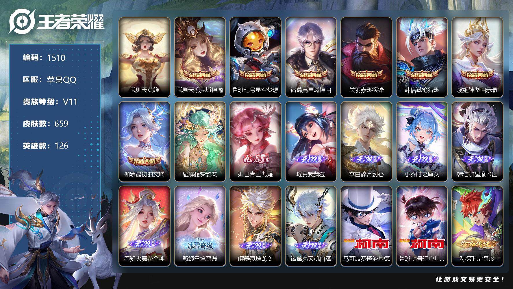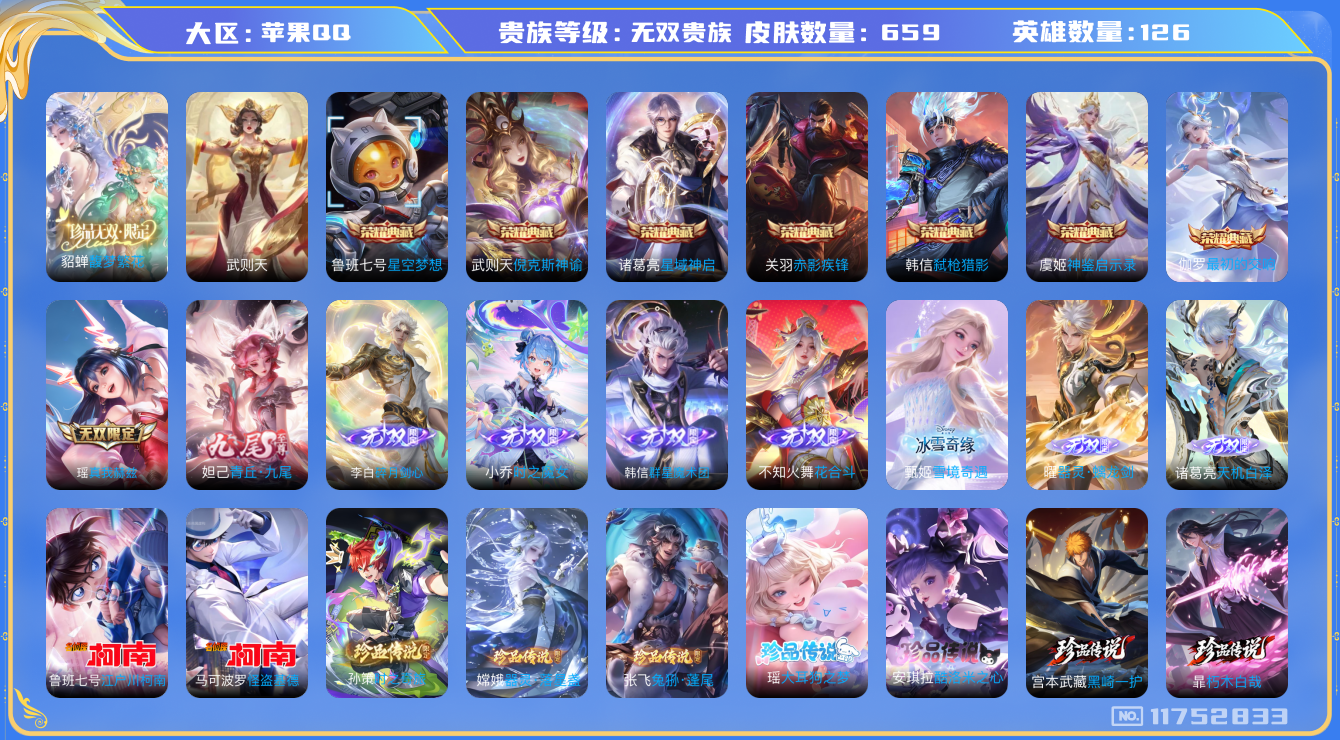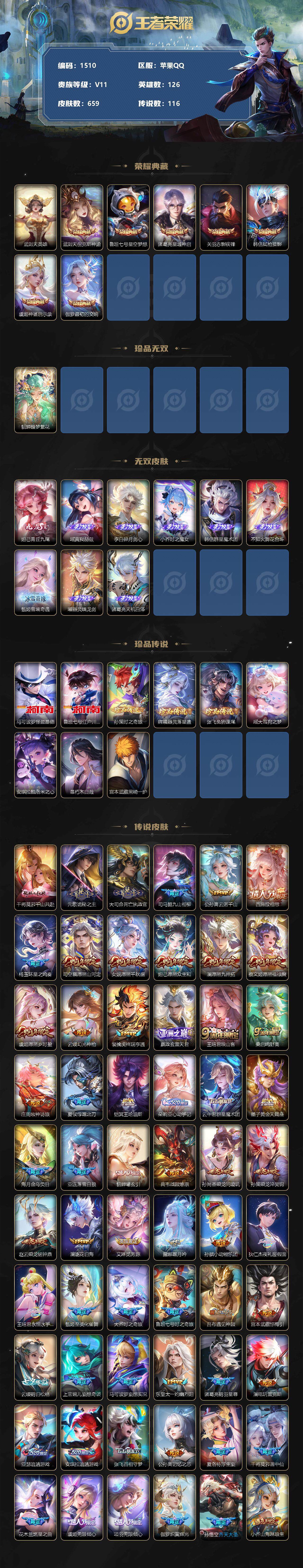 [11752833]【商品标题】:苹果Q-V11-最强王者段位-126英雄-659皮肤-7典藏-1珍品无双-9无双-9珍品传说-116传说-224史诗