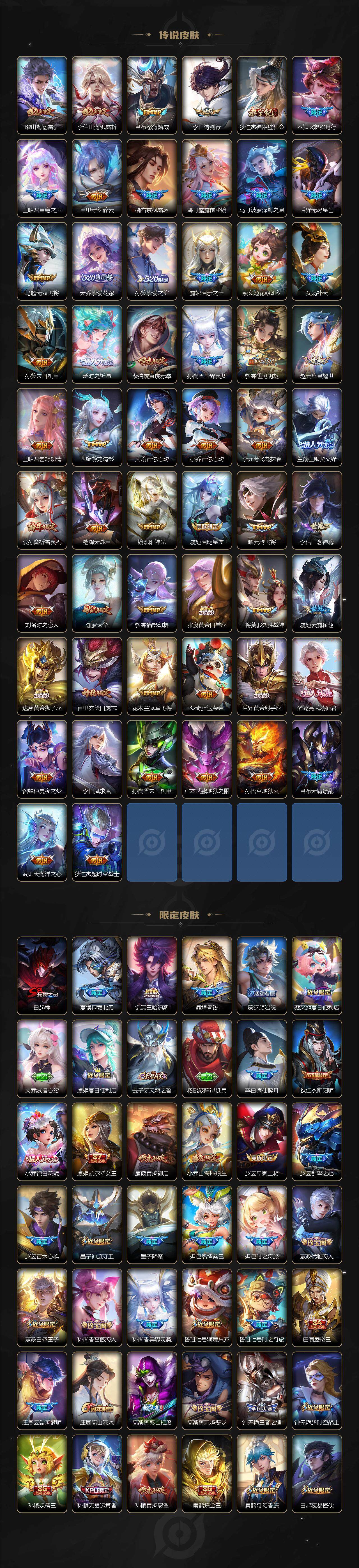 【传说皮肤】:干将莫邪千山共赴,元歌诡秘之主,大司命死亡执政官,司马懿九山相柳,公孙离云诺千山,西施续相思,杨玉环星之鸣奏,司空震愿照山河定,女娲愿照千秋盛,妲己愿照众生和,澜愿照九州拓,蔡文姬愿照福禄聚,虞姬愿照岁时盈,云缨幻光神枪,裴擒虎祥瑞亨通,嬴政玄雷天君,王昭君映山客,桑启鸣野蒿,庄周牧神诗旅,夏侯惇霜北刀,铠冥王哈迪斯,朵莉亚心动手记,云中君群星魔术团,墨子黄金天蝎座,海月金乌负日,亚连落雪白狼,貂蝉曦玄引,典韦战鼓燎原,孙尚香乘龙问璇玑,孙策乘龙淬吴钩,赵云乘龙铭钟鼎,澜逐花归海,艾琳觅芳踪,露娜霜月吟,孙膑小动物乐团,狄仁杰夜礼服假面,王昭君永恒水手月亮,甄姬至美化雀舞,大乔时之奇旅,鲁班七号时之奇旅,吕布遇见神鼓,宫本武藏惊梅引,云缨鹤归松栖,上官婉儿妄想奇谈,马可波罗妄想实况,东皇太一灼幽烈阳,诸葛亮鹤羽星尊,澜电玩雷克斯,亚瑟追逃游戏,安琪拉追逃游戏,张飞百相守梦,公孙离记忆之芯,夏洛特浮生妄,干将莫邪画中仙,花木兰燃星之曲,虞姬无限倾心,项羽无限倾心,伽罗炽翼辉光,孙悟空齐天大圣,小乔山海琳琅生,曜山海苍雷引,李信山海炽霜斩,吕布怒海麟威,李白诗剑行,狄仁杰神器狴犴令,不知火舞绯月行,王昭君星穹之声,百里守约碎云,橘右京枫霜尽,娜可露露前尘镜,马可波罗深海之息,后羿无尽星芒,马超无双飞将,大乔挚爱花嫁,孙策挚爱之约,露娜启示之音,蔡文姬花朝如约,女娲补天,孙策末日机甲,瑶时之祈愿,裴擒虎寅虎赤拳,孙尚香异界灵契,貂蝉遇见胡旋,赵云淬星耀世,王昭君乞巧织情,西施游龙清影,周瑜音你心动,小乔音你心动,李元芳飞鸢探春,兰陵王默契交锋,公孙离祈雪灵祝,铠绛天战