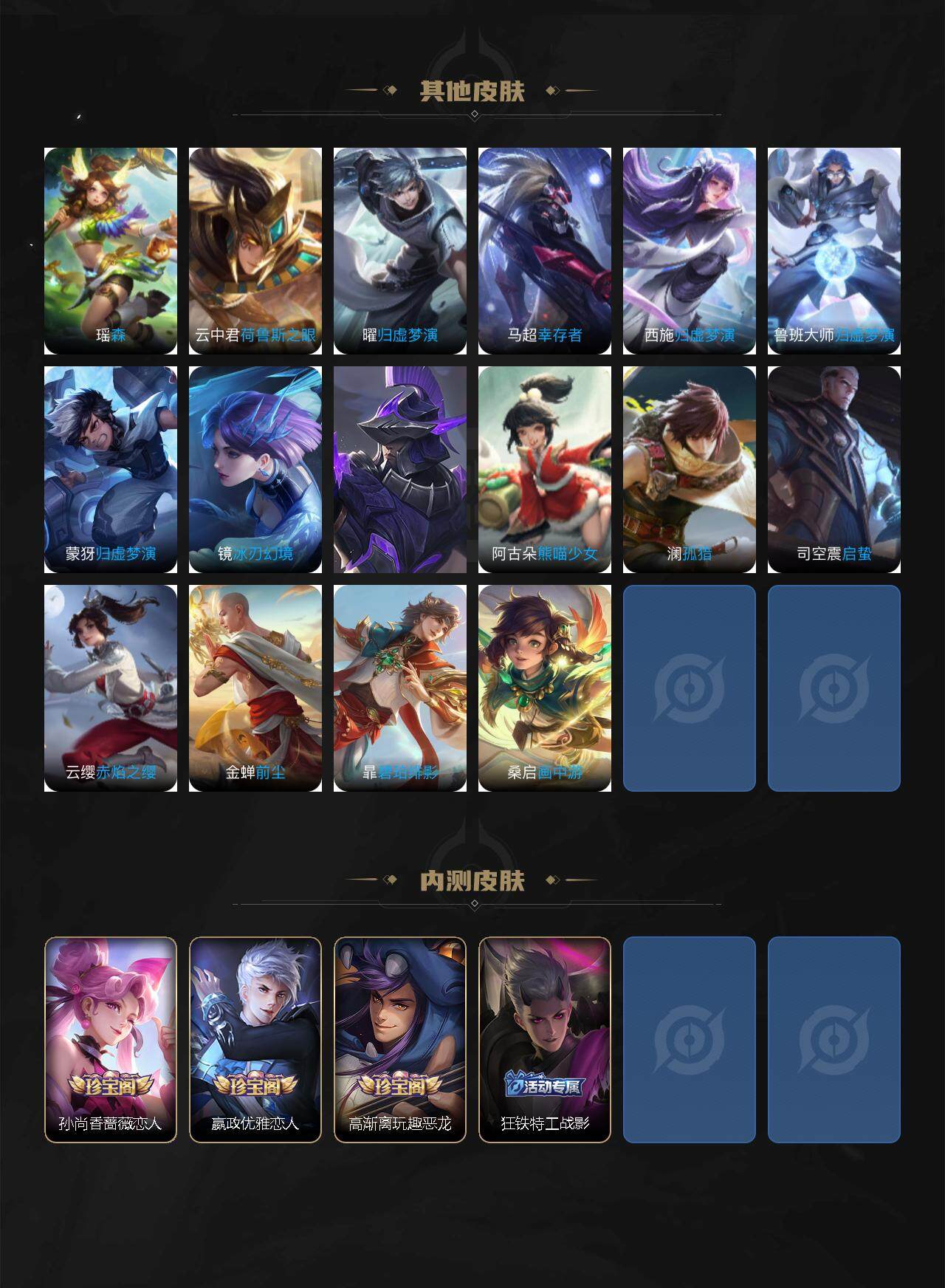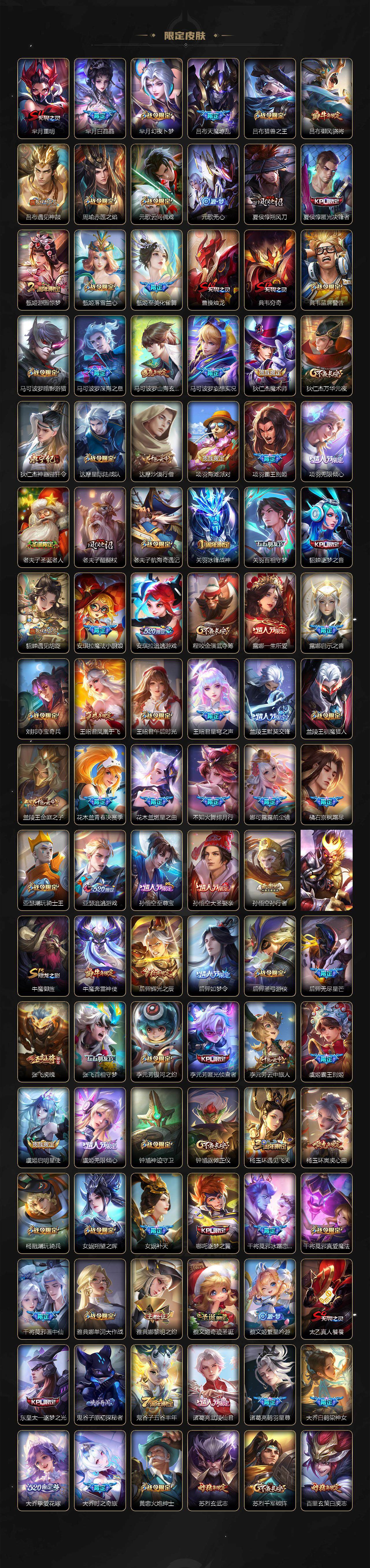 关羽冰锋战神,裴擒虎李小龙,上官婉儿梁祝,牛魔奔雷神使,貂蝉逐梦之音,公孙离祈雪灵祝,吕布御风骁将,张飞虎魄,马超神威,后羿辉光之辰,伽罗太华,裴擒虎天狼狩猎者,孙膑天狼运算者,上官婉儿天狼绘梦者,伽罗天狼溯光者,哪吒逐梦之翼,东皇太一逐梦之光,百里玄策白虎志,苏烈玄武志,百里守约朱雀志,王昭君凤凰于飞,项羽霸王别姬,虞姬霸王别姬,小乔纯白花嫁,孙悟空大圣娶亲,露娜一生所爱,兰陵王默契交锋,后羿如梦令,嫦娥如梦令,孙悟空至尊宝,裴擒虎梅西,雅典娜神奇女侠,妲己热情桑巴,干将莫邪冰霜恋舞曲,花木兰青春决赛季,蔡文姬奇迹圣诞,公孙离蜜橘之夏,芈月白晶晶,安琪拉魔法小厨娘,赵云引擎之心,庄周云端筑梦师,大乔白鹤梁神女,猪八戒猪悟能,廉颇寅虎·御盾,孙尚香异界灵契,老夫子圣诞老人,孙悟空孙行者,镜匿光追影者,孙膑寅虎·展翼,杨玉环寅虎·心曲,裴擒虎寅虎·赤拳,瑶时之祈愿,女娲补天,赵云百木心枪,露娜启示之音,夏侯惇匿光决锋者,后羿无尽星芒,马可波罗深海之息,金蝉唐三藏,娜可露露前尘镜,橘右京枫霜尽,鲁班大师匿光启智者,妲己时之奇旅,王昭君星穹之声,不知火舞绯月行,上官婉儿神器·万象笔,盾山梦圆繁星,墨子降魔,李白诗剑行,马可波罗山海·玄木吟,瑶山海·碧波行,西施至美·乘鲤谣,甄姬至美·化雀舞,夏侯惇霜北刀,桑启鸣野蒿,艾琳陌上桑,王昭君映山客,澜愿照·九州拓,蔡文姬愿照·福禄聚,虞姬愿照·岁时盈,司空震愿照·山河定,妲己愿照·众生和,女娲愿照·千秋盛