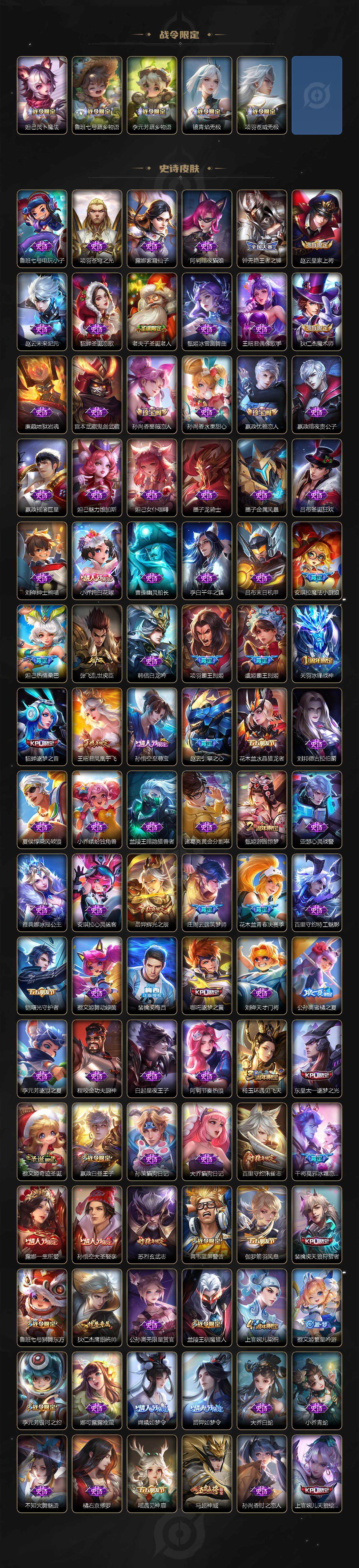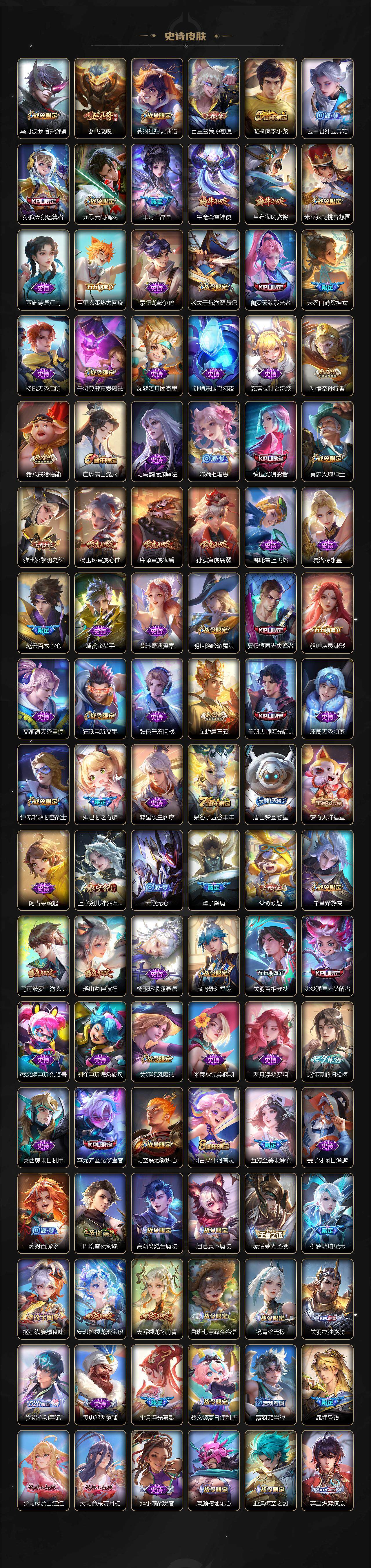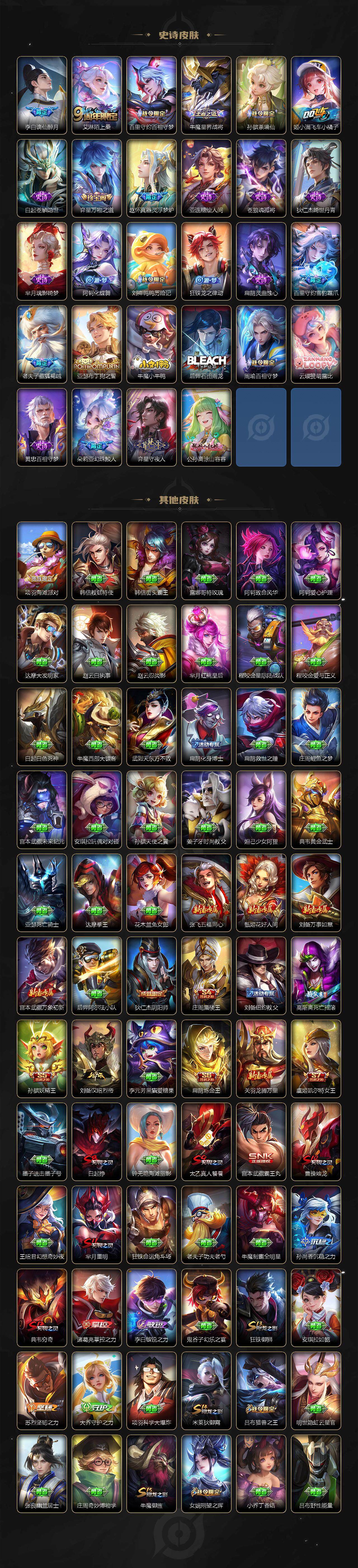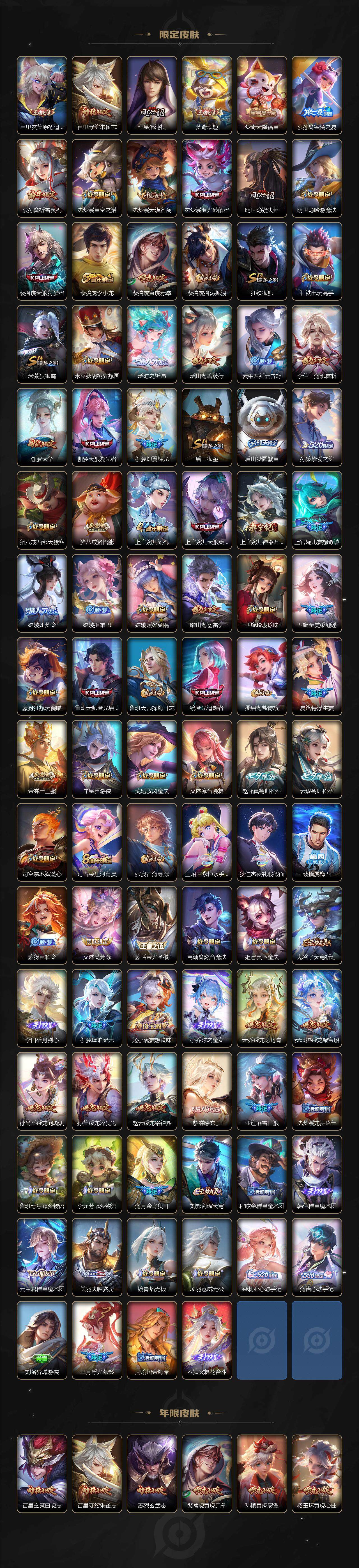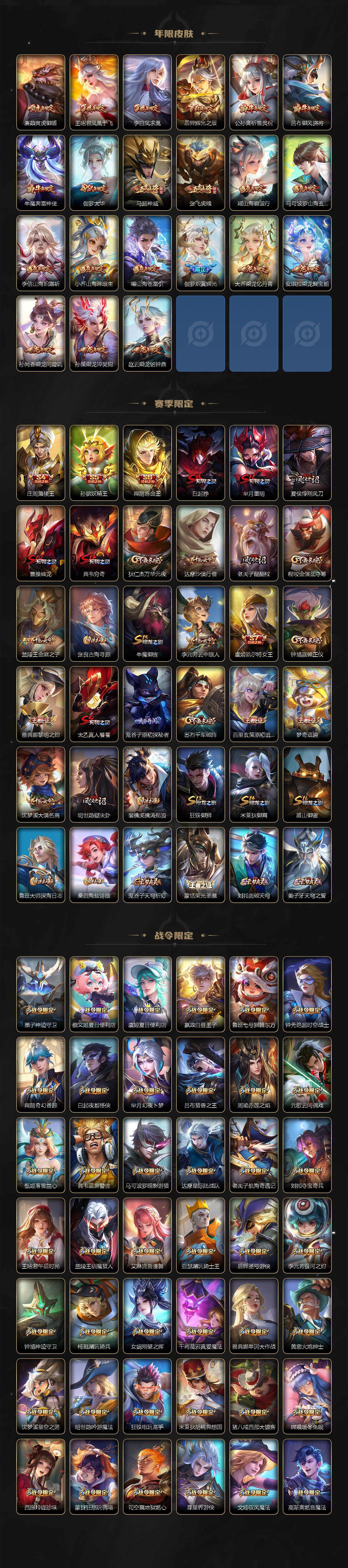 庄周蜃楼王,孙膑妖精王,扁鹊炼金王,虞姬凯尔特女王,白起狰,太乙真人饕餮,曹操烛龙,芈月重明,典韦穷奇,狂铁御狮,米莱狄御霄,牛魔御旌,盾山御銮,夏侯惇朔风刀,明世隐疑决卦,老夫子醍醐杖,鬼谷子原初探秘者,狄仁杰万华元夜,程咬金演武夺筹,钟馗驱傩正仪,苏烈千军破阵,吕布猎兽之王,嬴政白昼王子,女娲朔望之晖,典韦蓝屏警告,钟馗神迹守卫,鲁班七号狮舞东方,沈梦溪星空之诺,李元芳银河之约,刘邦夺宝奇兵,马可波罗暗影游猎,蒙犽狂想玩偶喵,元歌云间偶戏,弈星混沌棋,达摩沙漠行僧,兰陵王金庭之子,沈梦溪大漠名商,李元芳云中旅人,桑启海盐诗旅,裴擒虎擒涛扼浪,鲁班大师探海日志,张良古海寻踪,项羽苍威无极,镜青焰无极