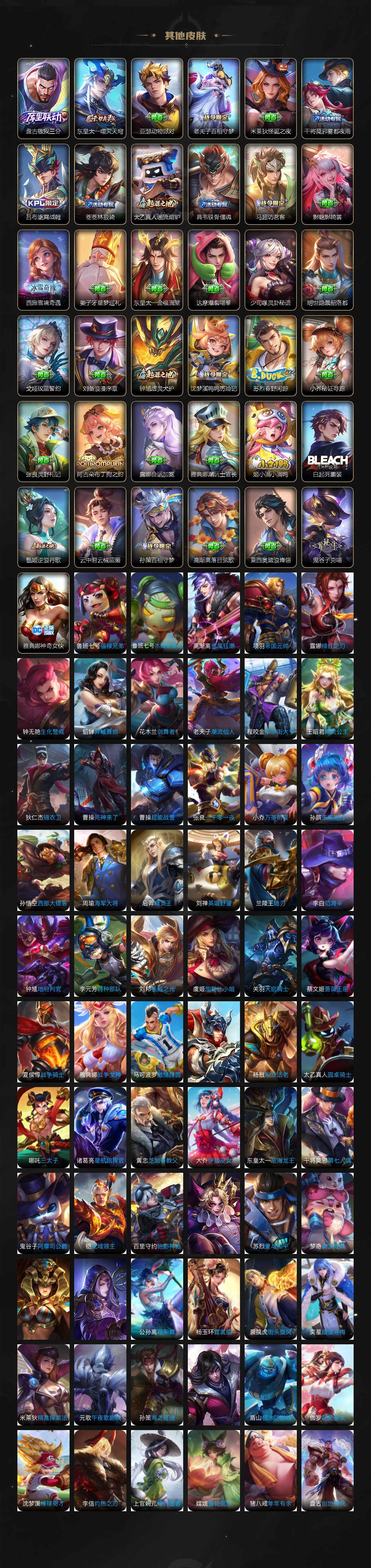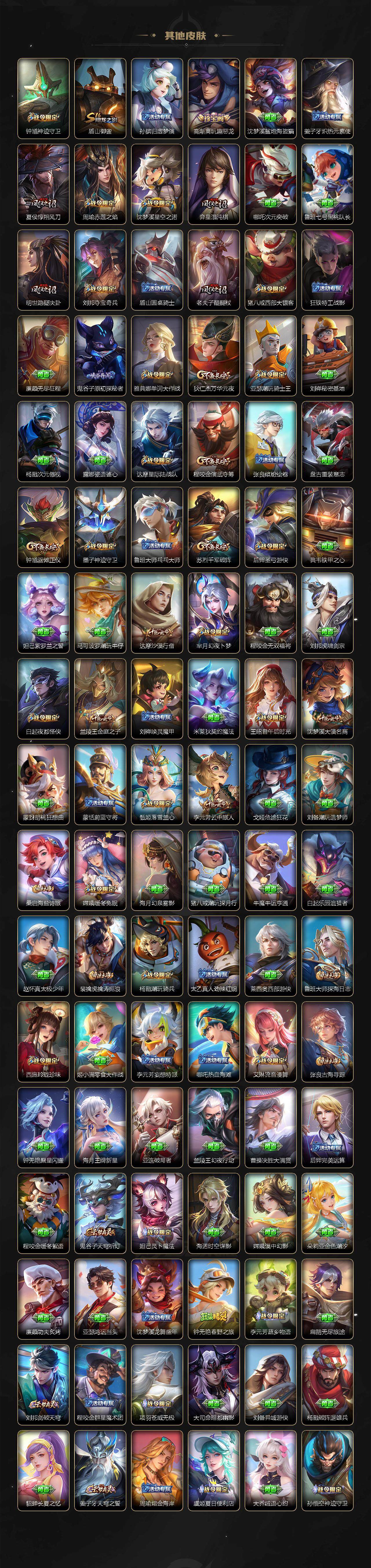 小乔青蛇,大乔白蛇,瑶遇见神鹿,娜可露露晚萤,伽罗箭羽风息,李元芳逐浪之夏,不知火舞魅语,公孙离无限星赏官,大乔猫狗日记,孙策猫狗日记,阿轲节奏热浪,露娜紫霞仙子,诸葛亮黄金分割率,王昭君偶像歌手,韩信白龙吟,项羽苍穹之光,孙尚香时之恋人,阿轲暗夜猫娘,雅典娜冰冠公主,吕布末日机甲,鲁班七号电玩小子,蒙犽龙鼓争鸣,橘右京修罗,墨子龙骑士,嬴政摇滚巨星,刘禅绅士熊喵,刘禅天才门将,白起星夜王子,安琪拉心灵骇客,安琪拉时之奇旅,程咬金功夫厨神,刘邦德古拉伯爵,兰陵王暗隐猎兽者,曹操幽灵船长,宫本武藏鬼剑武藏,司马懿暗渊魔法,亚瑟心灵战警,钟馗乐园奇幻夜,杨戬天秀·启明,蔡文姬舞动绿茵,廉颇地狱岩魂,西施诗语江南,小乔缤纷独角兽,夏侯惇乘风破浪,花木兰水晶猎龙者,铠曙光守护者,百里玄策热力回旋,墨子金属风暴,百里玄策原初追逐者,吕布圣诞狂欢,貂蝉圣诞恋歌,百里守约特工魅影,嬴政暗夜贵公子,嫦娥拒霜思,雅典娜黎明之约,李白千年之狐,哪吒雪上飞焰,夏洛特永昼,澜赏金猎手,艾琳奇遇舞章,貂蝉唤灵魅影,高渐离天秀·音浪,张良千筹问战,庄周天秀·幻梦,弈星滕王阁序,阿古朵顽趣,杨玉环银翎春语,关羽百相守梦,沈梦溪匿光破解者,蔡文姬电玩·兔顽号,刘禅电玩·爆裂旋风,海月浮梦罗烟,赵怀真鹤归松栖,莱西奥末日机甲,李元芳匿光侦查者,姜子牙闲日渔趣,蒙犽百解令,周瑜雪夜绮愿,高渐离燃音魔法,伽罗琥珀纪元,大乔乘龙·忆丹青,安琪拉乘龙·聚宝船,关羽决胜骁骑,海诺心动手记,李白谪仙醉月,姬小满飞车小橘子,白起苍鳞隐世,赵怀真器灵·浮梦炉,亚连糖绘人间,苍狼魂孤将,狄仁杰绮世丹青