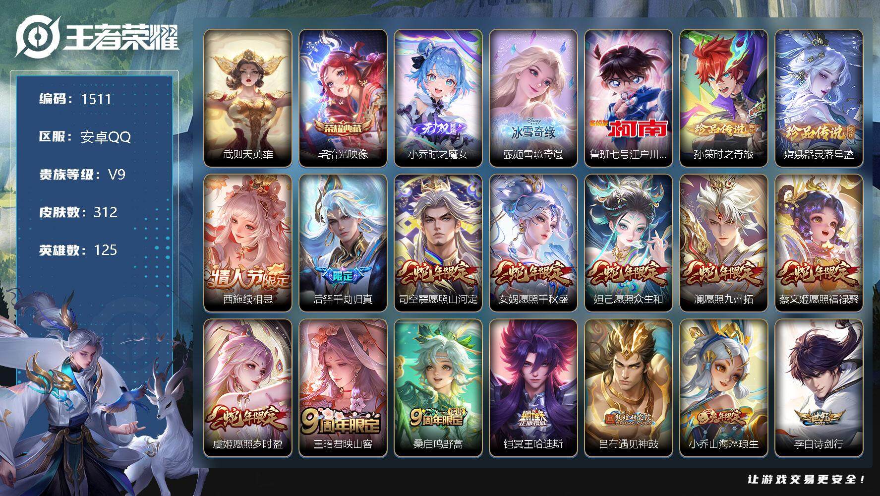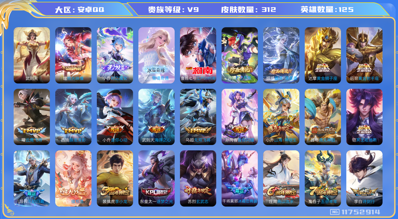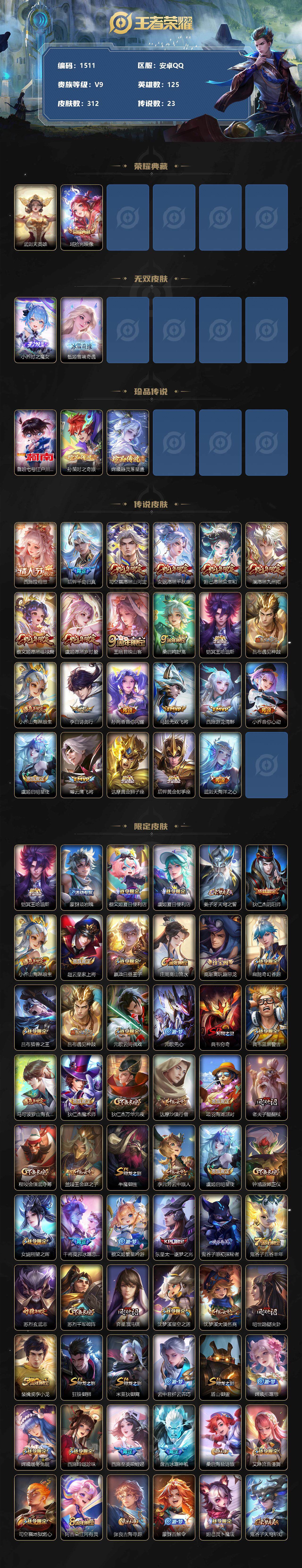 [11752914]【商品标题】:安卓Q-V9-最强王者段位-125英雄-312皮肤-1典藏-0珍品无双-2无双-3珍品传说-23传说-82史诗