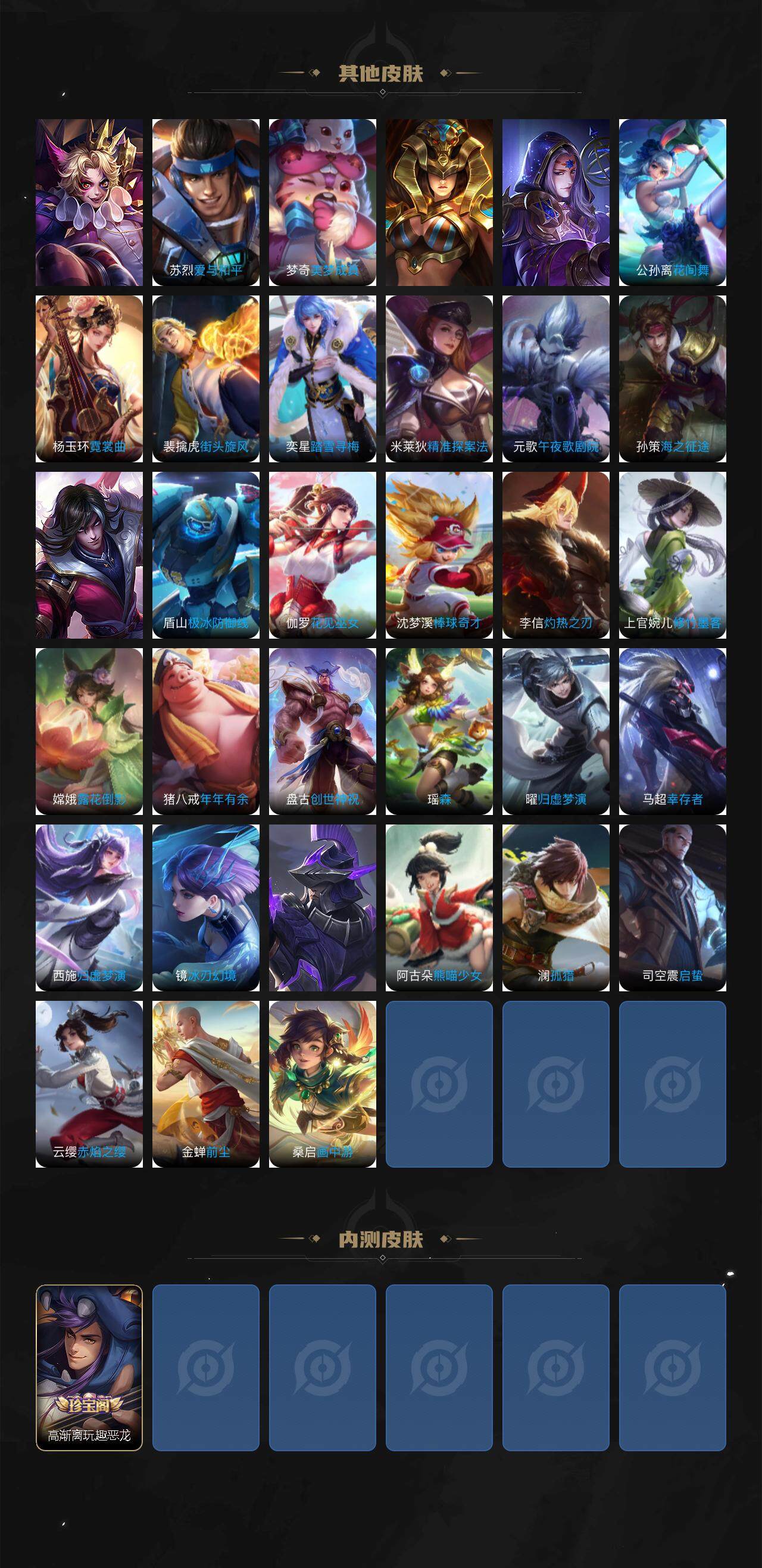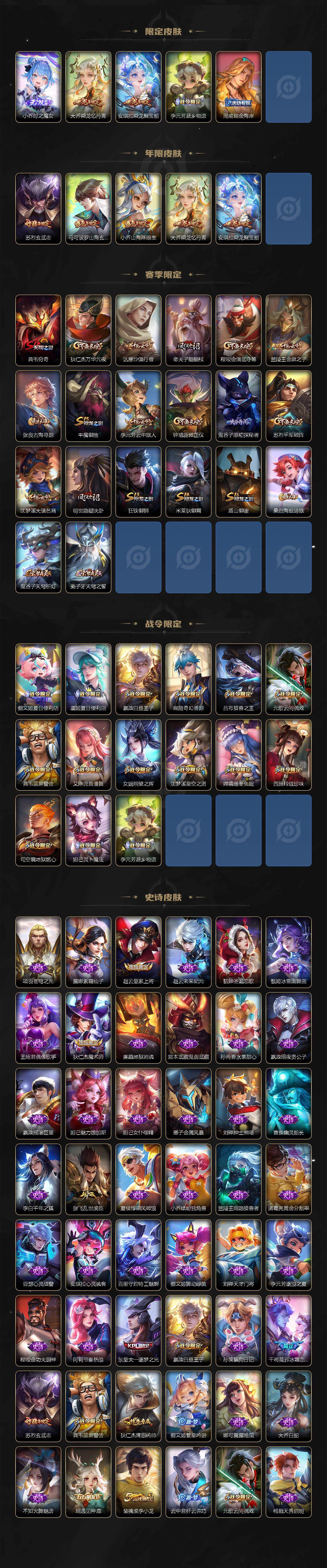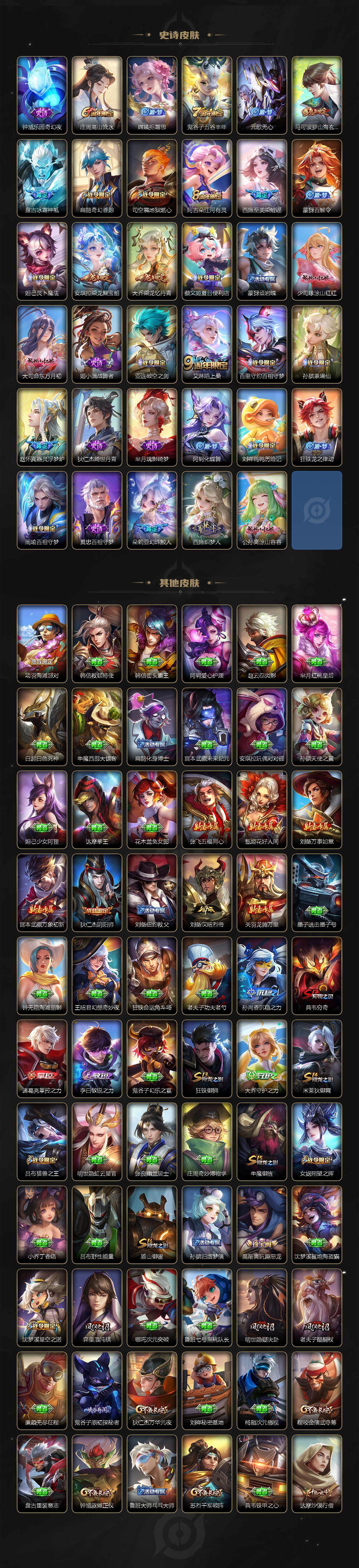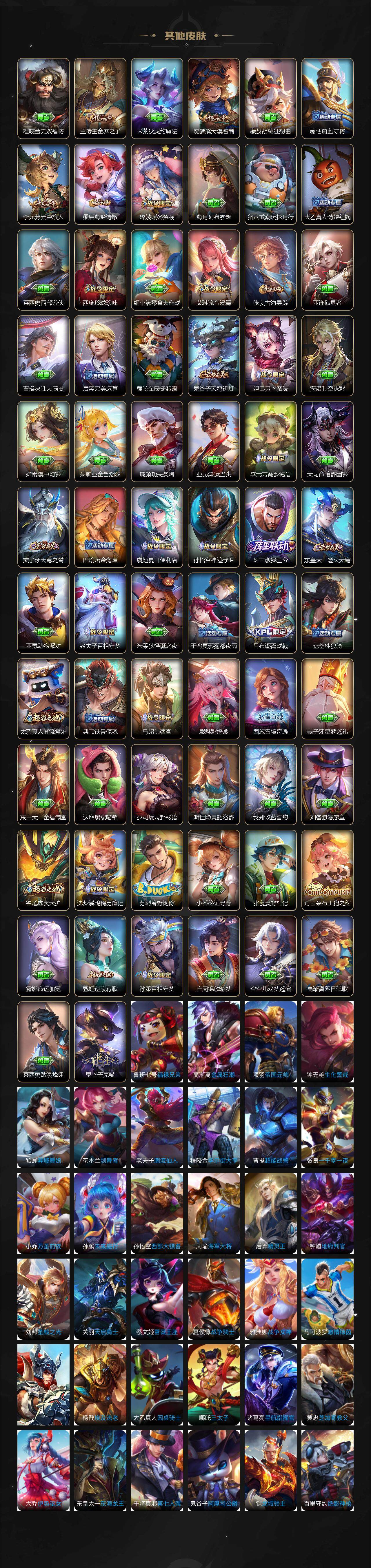 【限定皮肤】:铠冥王哈迪斯,蒙犽顽岩魄,蔡文姬夏日便利店,虞姬夏日便利店,姜子牙天穹之誓,狄仁杰阴阳师,小乔山海琳琅生,赵云皇家上将,嬴政白昼王子,庄周高山流水,高渐离玩趣恶龙,扁鹊奇幻香踪,吕布猎兽之王,吕布遇见神鼓,元歌云间偶戏,元歌无心,典韦穷奇,典韦蓝屏警告,马可波罗山海玄木吟,狄仁杰魔术师,狄仁杰万华元夜,达摩沙漠行僧,项羽海滩派对,老夫子醍醐杖,程咬金演武夺筹,兰陵王金庭之子,牛魔御旌,李元芳云中旅人,虞姬启明星使,钟馗驱傩正仪,女娲朔望之晖,干将莫邪冰霜恋舞曲,蔡文姬繁星吟游,东皇太一逐梦之光,鬼谷子原初探秘者,鬼谷子五谷丰年,苏烈玄武志,苏烈千军破阵,弈星混沌棋,沈梦溪星空之诺,沈梦溪大漠名商,明世隐疑决卦,裴擒虎李小龙,狂铁御狮,米莱狄御霄,云中君纤云弄巧,盾山御銮,嫦娥拒霜思,嫦娥暖冬兔眠,西施玲珑珍味,西施至美乘鲤谣,盘古冰霜神祇,桑启海盐诗旅,艾琳流音漫舞,司空震地狱燃心,阿古朵江河有灵,张良古海寻踪,蒙犽百解令,妲己灵卜魔法,鬼谷子天穹祈灯,小乔时之魔女,大乔乘龙忆丹青,安琪拉乘龙聚宝船,李元芳蔬乡物语,周瑜熔金海岸