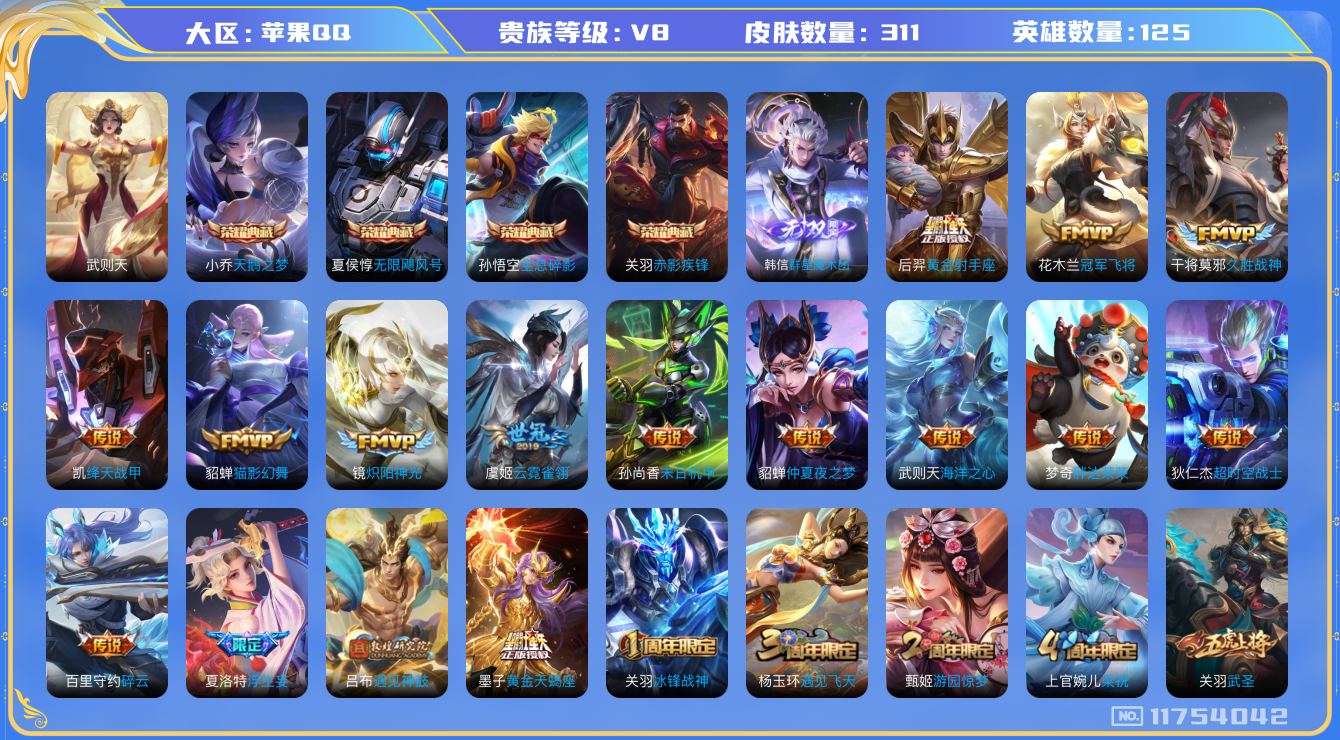 - [11917043]实名: 可修改 性别: 男号 贵族等级: V6 英雄数: 123 皮肤数: 160 传说皮: 冠军飞将,云鹰飞将,一念神魔,李逍遥 限定皮: 李小龙,神奇女侠,傲雪梅枪,五谷丰年,齐天大圣,鸣野蒿,逐霄战戟,愿照·九州拓