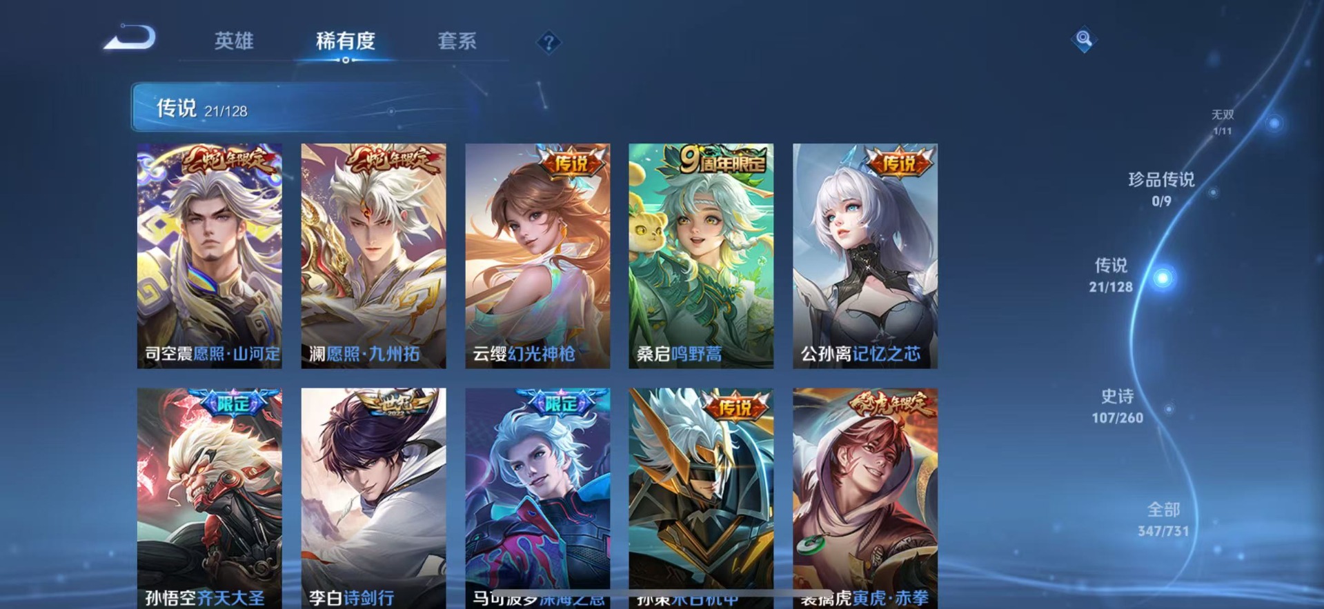 - [12174093]V7 2珍品传说 10传说 123英雄 228皮肤 可修改实名 女号 优质装备:器灵·落星盏,大耳狗之梦,云鹰飞将(小将军),一念神魔,仲夏夜之梦(大飞蛾),胖达荣荣,游龙清影(小青龙),澜逐花归海,涂山容容 传说皮:续相思 珍宝阁皮:妄想食味,蔷薇恋人 限定皮:愿照·岁时盈(虞姬年限),愿照·众生和(妲己年限),山海·碧波行(瑶年限),至美·乘鲤谣,高山流水,天狼溯光者,逐梦之音,祈雪灵祝(雪兔子),李小龙,如梦令-嫦娥,霸王别姬-虞姬,一生所爱,女儿国国王,寅虎·心曲(虎婆),玉兔公主 史诗皮:器灵·浮梦炉,龙之律动,琥珀纪元伽罗,星界战将,石田雨龙,百相守梦-黄忠,埋骨钱,涂山红红,织梦人,遇见神鹿,紫霞仙子,苍穹之光,冰冠公主,匿光侦查者,江河有灵,百解令(蒙犽),魅语,晚萤,猫狗日记-大乔,乱世虎臣,节奏热浪,修罗,女仆咖啡,摇滚巨星,水果甜心,绅士熊喵,天才门将,心灵骇客,功夫厨神,德古拉伯爵,鬼剑武藏,舞动绿茵,地狱岩魂,诗语江南,纤云弄巧,繁星吟游(呼啦呼啦),拒霜思,缤纷独角兽,乘风破浪,逐浪之夏,曙光守护者,金属风暴,圣诞恋歌,鹰眼统帅,魅力维加斯,黎明之约,未来纪元-赵云