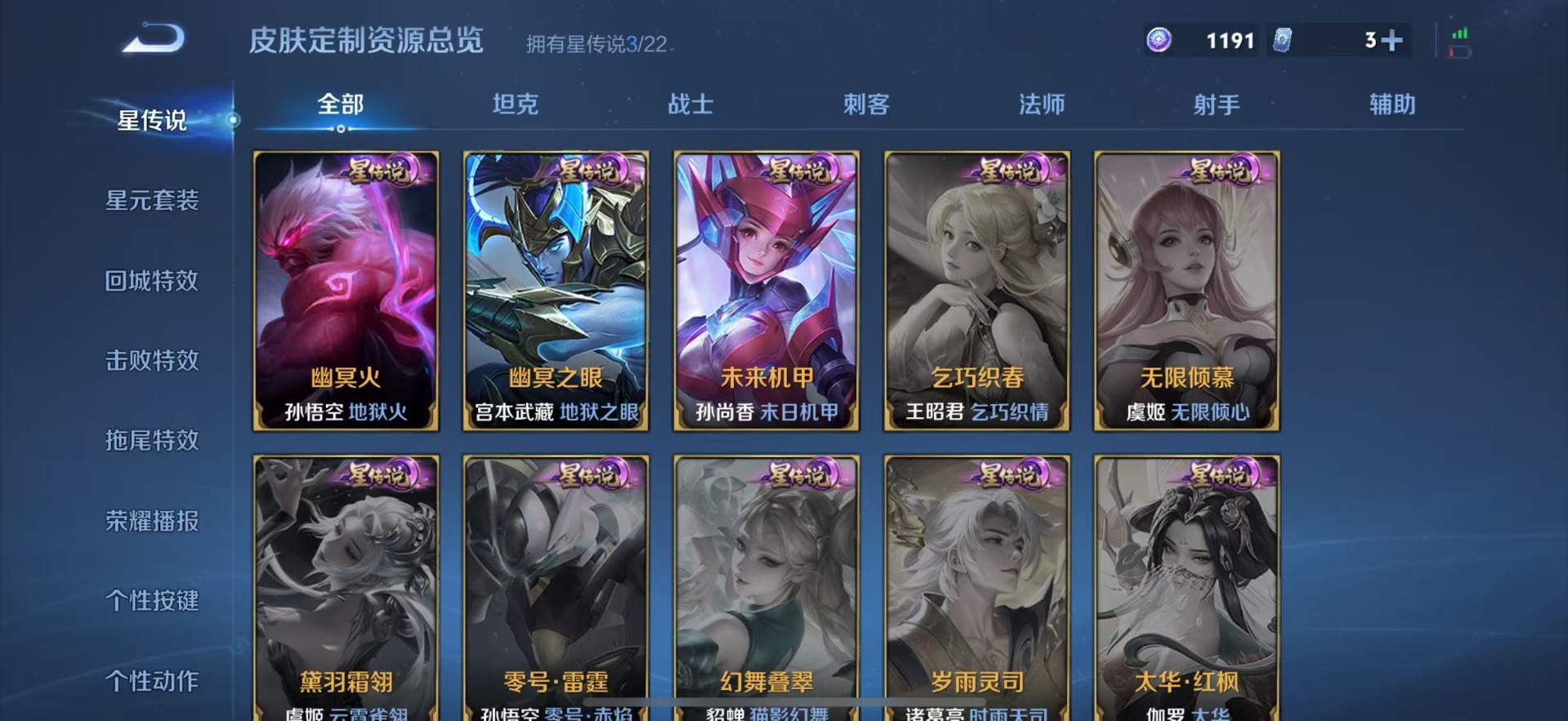 刘邦德古拉伯爵,夏侯惇乘风破浪,阿轲暗夜猫娘,阿轲节奏热浪,铠曙光守护者,曹操幽灵船长,廉颇地狱岩魂,伽罗箭羽风息,小乔缤纷独角兽,小乔青蛇,孙策猫狗日记,不知火舞魅语,赵怀真器灵·浮梦炉,鲁班七号电玩小子,项羽苍穹之光,吕布圣诞狂欢,吕布末日机甲,露娜紫霞仙子,诸葛亮黄金分割率,刘禅电玩·爆裂旋风,司马懿暗渊魔法,刘禅天才门将,刘禅绅士熊喵,宫本武藏鬼剑武藏,公孙离无限星赏官,亚连糖绘人间,兰陵王暗隐猎兽者,貂蝉圣诞恋歌,苍狼魂孤将,花木兰水晶猎龙者,夏洛特永昼,李白千年之狐,安琪拉心灵骇客,白起星夜王子,白起苍鳞隐世,亚瑟心灵战警,嬴政摇滚巨星,程咬金功夫厨神,百里玄策热力回旋,百里玄策原初追逐者,雅典娜冰冠公主,雅典娜黎明之约,李元芳逐浪之夏,百里守约特工魅影,墨子金属风暴,蔡文姬舞动绿茵,澜赏金猎手,弈星滕王阁序,娜可露露晚萤,王昭君偶像歌手,嫦娥拒霜思,钟馗乐园奇幻夜,橘右京修罗