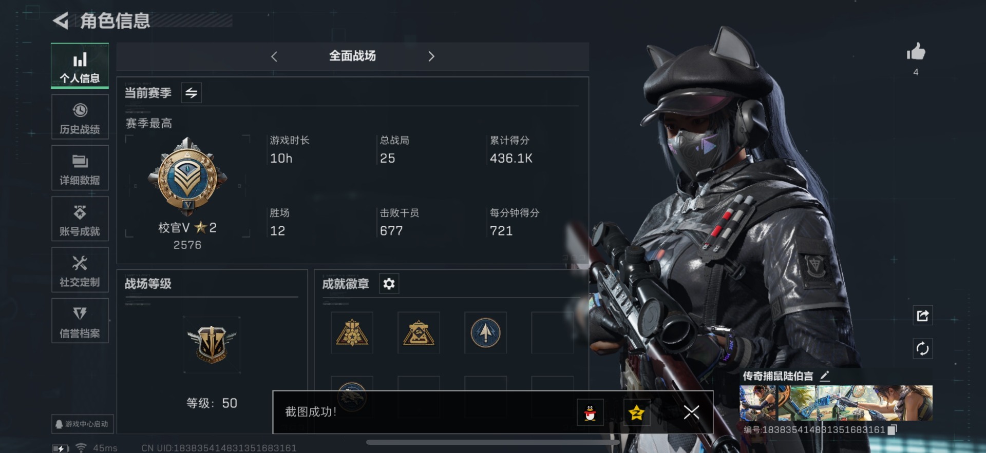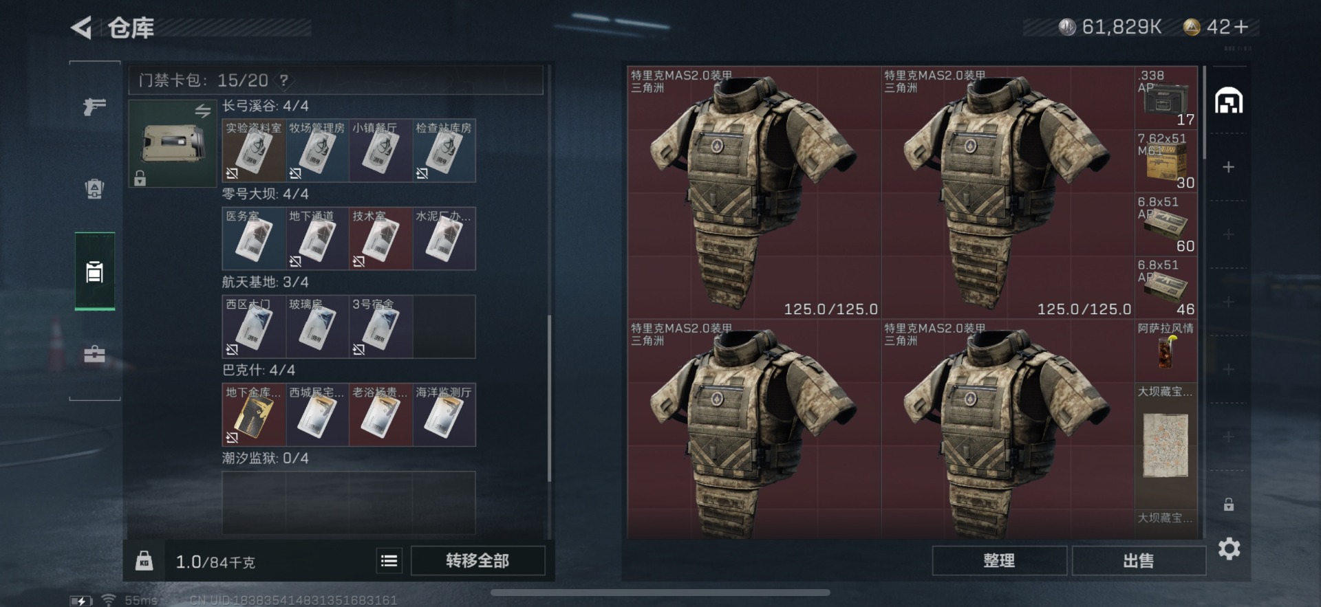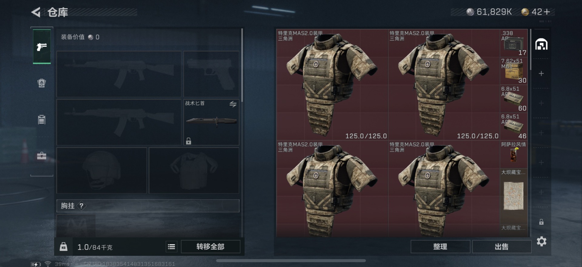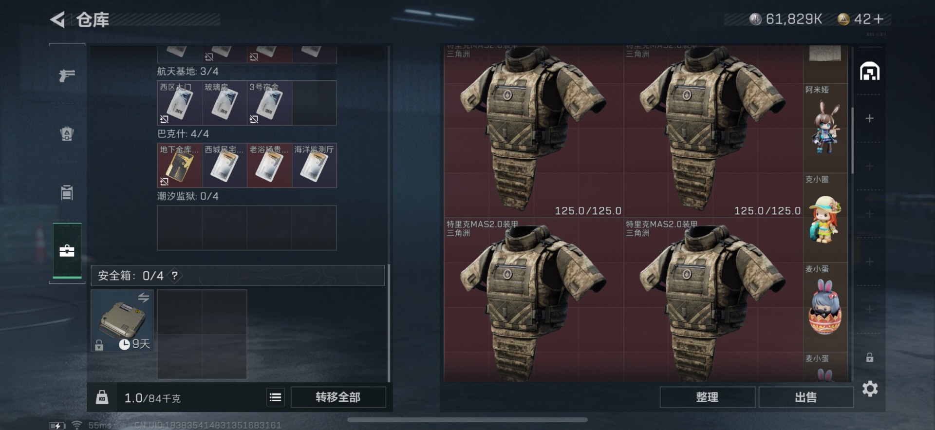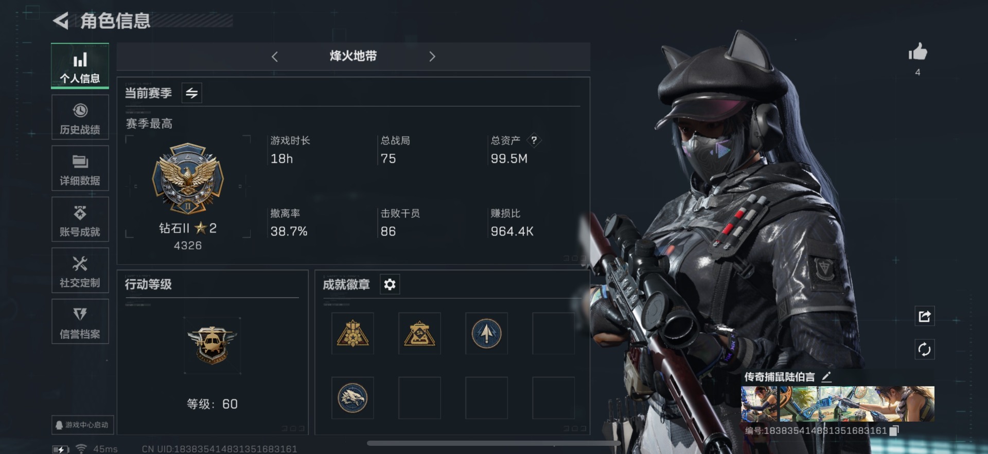 [11631147]总资产:99.5M 1干员外观 5传说枪械 哈夫币:61.839K 进阶安全箱(9.15到期) 可二次 可修改实名 优质装备:K416突击步枪-命运(典藏) 烽火地带段位:钻石 全面战场段位:校官 传说武器皮肤:SMG45冲锋枪-骑士,勇士冲锋枪-能天使-午夜邮差,复合弓-黑-天际线,CAR-15突击步枪-阿米娅 史诗武器皮肤:M700狙击步枪-蝮蛇,M1014霰弹枪-林中猎手,勇士冲锋枪-深海恐惧,SG552突击步枪-深海恐惧,AKM突击步枪-林中猎手,M16A4突击步枪-竞赛选手,M250通用机枪-囚徒,SV-98狙击步枪-林中猎手,SV-98狙击步枪-囚徒,SVD狙击步枪-暗夜猎手,沙漠之鹰-曙光,Vector冲锋枪-阿萨拉文明,SVD狙击步枪-阿萨拉工艺,S12K霰弹枪-曙光 干员外观:露娜-黑·天际线