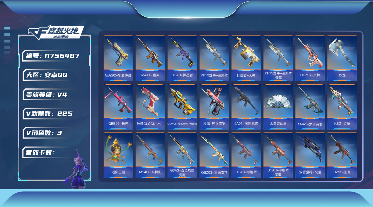 [11756487]可二次 可修改实名 V4 8王者武器 225英雄武器 3英雄角色 313万化 枪皇S 武器:王者之影,王者之心,王者之蝶,M12S-雷霆王者,M4A1-仲达,CZ75-策,AN94-卷帘大将军,KSG-孟获,激昂霸王枪,MK47-云舞,CZS2-善财童子,王者之魂,M4A1-死神,M4A1-雷神,M4A1-黑龙,M4A1-黑骑士,AK47-木兰,巴雷特-极光,巴雷特-毁灭,M4A1-冰锋觉醒,AK47-机械迷城,AK47-火麒麟,AK47-死神,AK47-无影,AK47-燎天净火,AUG-机械纪元,AWM-天使,QBZ03-金色蔷薇,QBB95-极光,双持斯泰尔-天使,MK5-极光,M4A1-龙血,M4A1-玫瑰精灵,M4A1-赛博雷神,巴雷特-冬灭觉醒,M4A1-破空冰刃,M4A1-运输船,M4A1-猎神,M4A1-心动次元,M4A1-海骑士,AK47-樱斗士-超觉,AK47-黑鲨,AK47-猩红传说,AK47-华夏传说,AK47-血武士,暗杀神,剑齿虎-炫彩,9A91-天神,AN94-四凶觉醒,SCAR-幽暗骑士,SCAR-幽暗骑士觉醒,SCAR-探星者,AWM-裁决,AWM-天龙,AK12-天启,M14EBR-天神,GM6-战争风云觉醒,SR25-燃烧泰坦,AK47-破空冰刃,CBJ-MS-毒蜂,刘易斯-星际方舟觉醒,QCW05-变形金刚·大黄蜂,汤姆逊-烈龙,CZS2-血月,CZS2-心动次元觉醒,寒霜烈龙,KSG-火力竞放觉醒,AA12-火药,PP19野牛-造纸术觉醒,PP19野牛-造纸术,地狱火,AA12-火药觉醒,地狱烈炎,打击者-天神,SCAR-印刷术,SCAR-印刷术觉醒,QBZ97-岚舞,MK47-鼓龙,G3A3-五色琉璃觉醒,QBZ03-玉面羞花,M14EBR-拂影,MG3-雏凤,刘易斯-血月,加特林-蟒蛇,VSK-94-九黎兵主觉醒,RPK-盘龙,RPK-美杜莎,加特林-堡垒,加特林-堡垒觉醒,MK23-幻神,双管猎枪-文远,AK47-雅韵青花,AN94-赳赳秦师,M4A1-太白诗仙,USP-仁德,9A91-魔蜥觉醒,白骨利刃,墨刃-幻神,CZ75-龙映钟山觉醒,沙鹰-无影,沙鹰-修罗,USP-机械迷城,沙鹰-神兵修罗,M16-恶魔,沙鹰-宇航兔兔,QSZ92-华夏传说,改装GLOCK-木兰,毛瑟-毒蜂,手斧-机械迷城,尼泊尔-机械纪元