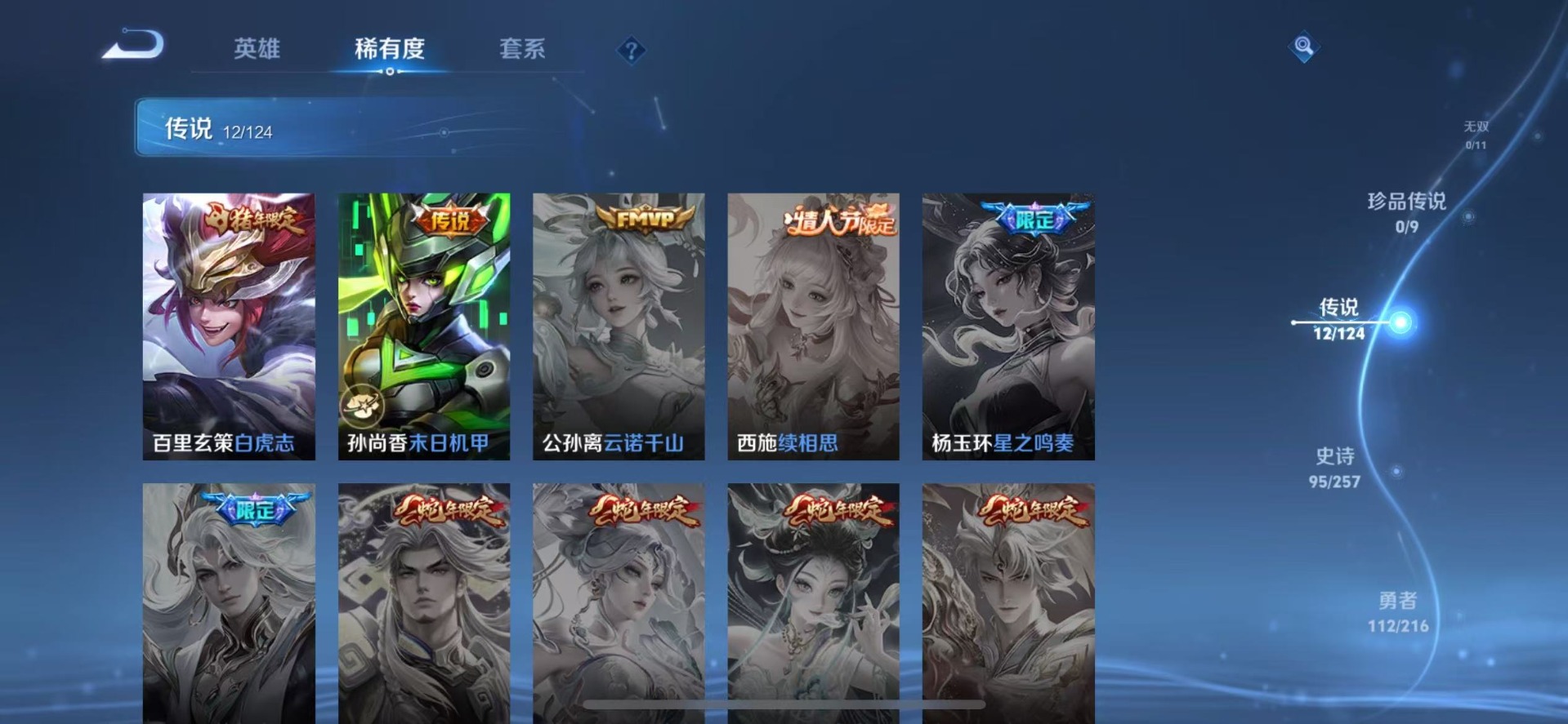 - PX_2103290-实名: 可修改 贵族等级: V6 英雄数: 124 皮肤数: 146 珍品传说: 器灵·落星盏 传说皮: 仲夏夜之梦,音你心动-小乔,貂蝉曦玄引,黄金天蝎座,幻光神枪 限定皮: 高山流水,玉兔公主,至美·乘鲤谣,鸣野蒿,愿照·众生和