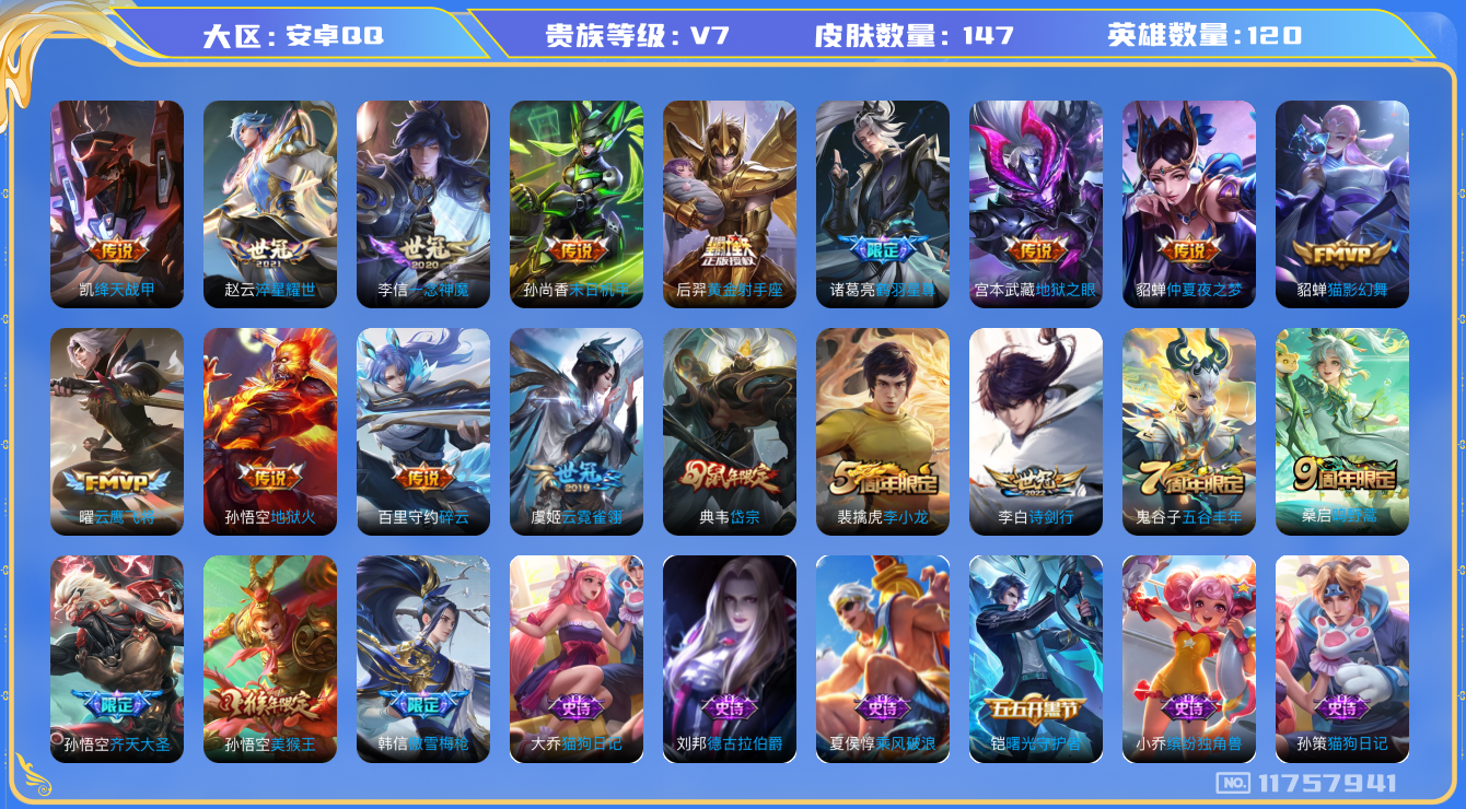 - PX_2060175-实名: 可修改 贵族等级: V7 英雄数: 123 皮肤数: 270 荣耀水晶: 全息碎影 无双皮: 小乔时之魔女 珍品传说: 器灵·落星盏 传说皮: 仲夏夜之梦,零号·赤焰,云诺千山 限定皮: 李小龙,引擎之心,辉光之辰,时之彼端,飞衡,逐梦之影,凤求凰,美猴王,傲雪梅枪,五谷丰年,愿照·岁时盈,愿照·福禄聚,愿照·九州拓
