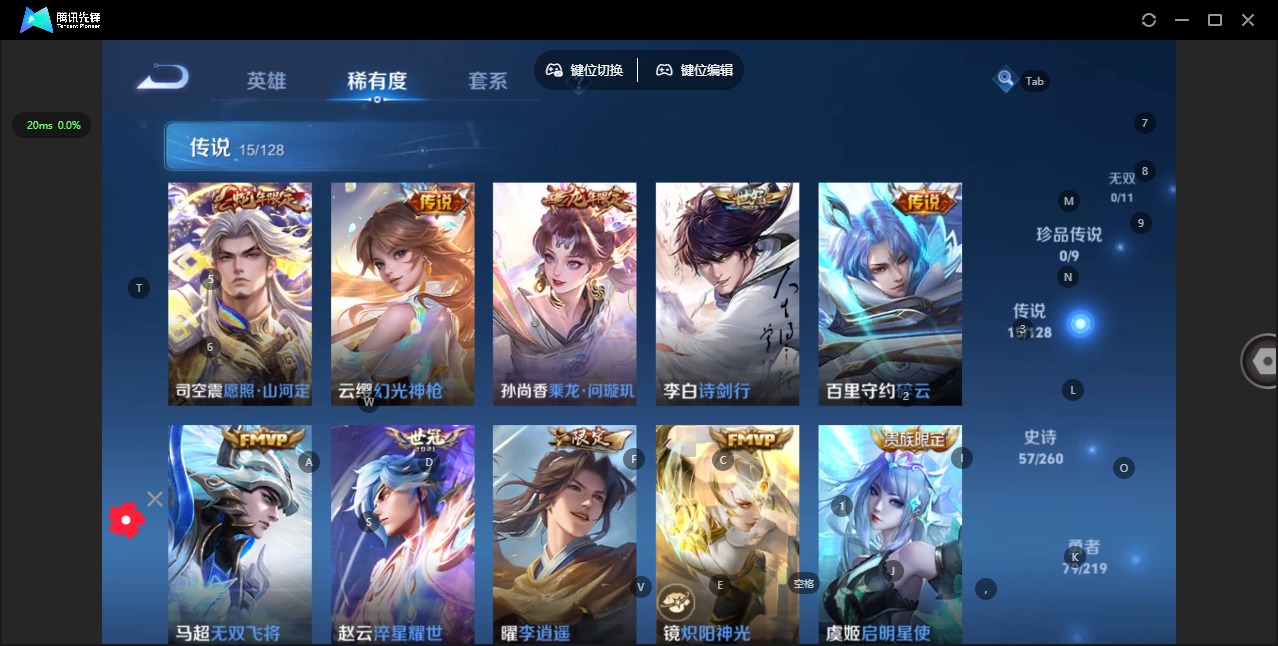 - [11529126]V6 4传说 109英雄 85皮肤 可修改实名 优质装备:云鹰飞将(小将军),无双飞将,澜逐花归海 传说皮:落雪白狼 珍宝阁皮:万物之道 限定皮:五谷丰年,神器·万象笔 史诗皮:化蝶舞,龙之律动,百相守梦-黄忠,特工魅影,江河有灵,百解令(蒙犽),水果甜心,鬼剑武藏,曙光守护者,金属风暴,鹰眼统帅,魅力维加斯,未来纪元-赵云