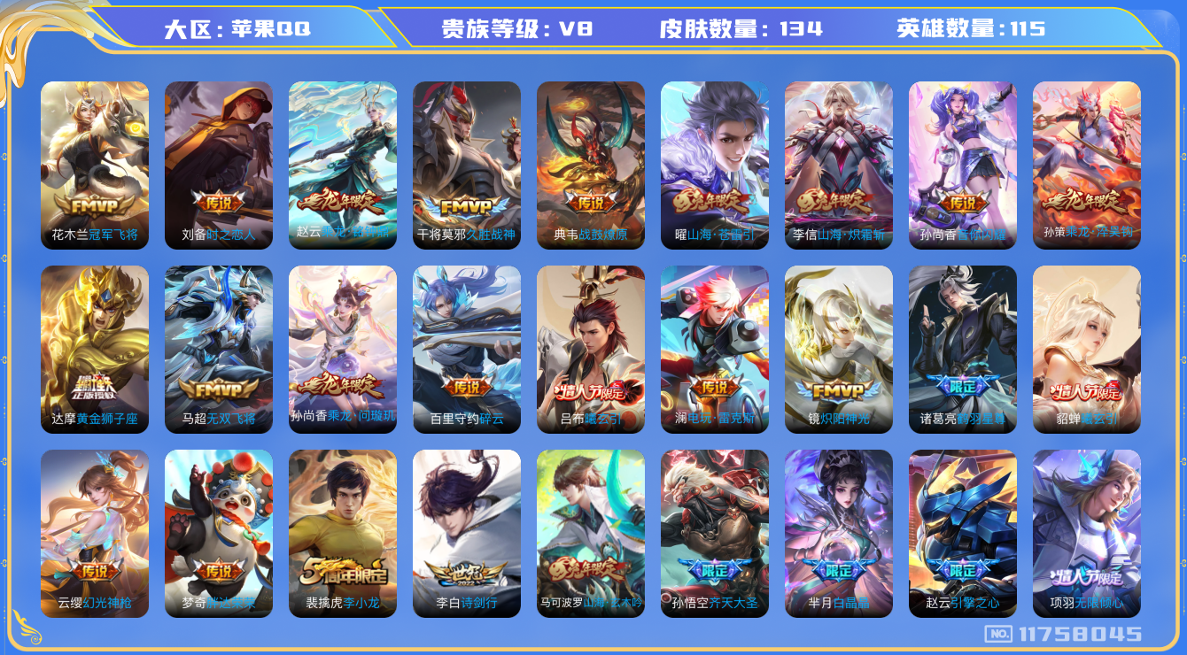 [11758045]V8 26传说 115英雄 134皮肤 可修改实名 优质装备:黄金狮子座,冠军飞将,久胜战神,炽阳神光,胖达荣荣,时之恋人-刘备(电焊工),无双飞将,音你闪耀(rap皮),碎云,山海·炽霜斩(李信年限),山海·苍雷引(电光曜子),电玩·雷克斯,鹤羽星尊 传说皮:乘龙·问璇玑(孙尚香年限),乘龙·铭钟鼎(赵云年限),乘龙·淬吴钩(孙策年限),貂蝉曦玄引,吕布曦玄引,典韦战鼓燎原,幻光神枪 珍宝阁皮:妄想食味 限定皮:白晶晶,无限倾心-项羽,诗剑行,无限倾心-虞姬,齐天大圣,怒海麟威,降魔,李小龙,引擎之心,山海·玄木吟(马可年限) 史诗皮:蔬乡物语(鲁班七号),乘龙·聚宝船(安琪拉年限),乘龙·忆丹青(大乔年限),高渐离燃音魔法,偶像歌手,电玩·爆裂旋风,末日机甲-吕布,猫狗日记-孙策,摇滚巨星,水果甜心,星夜王子,幽灵船长,鬼剑武藏,乘风破浪,圣诞狂欢,鹰眼统帅,魅力维加斯,黎明之约,无心,玫瑰异探