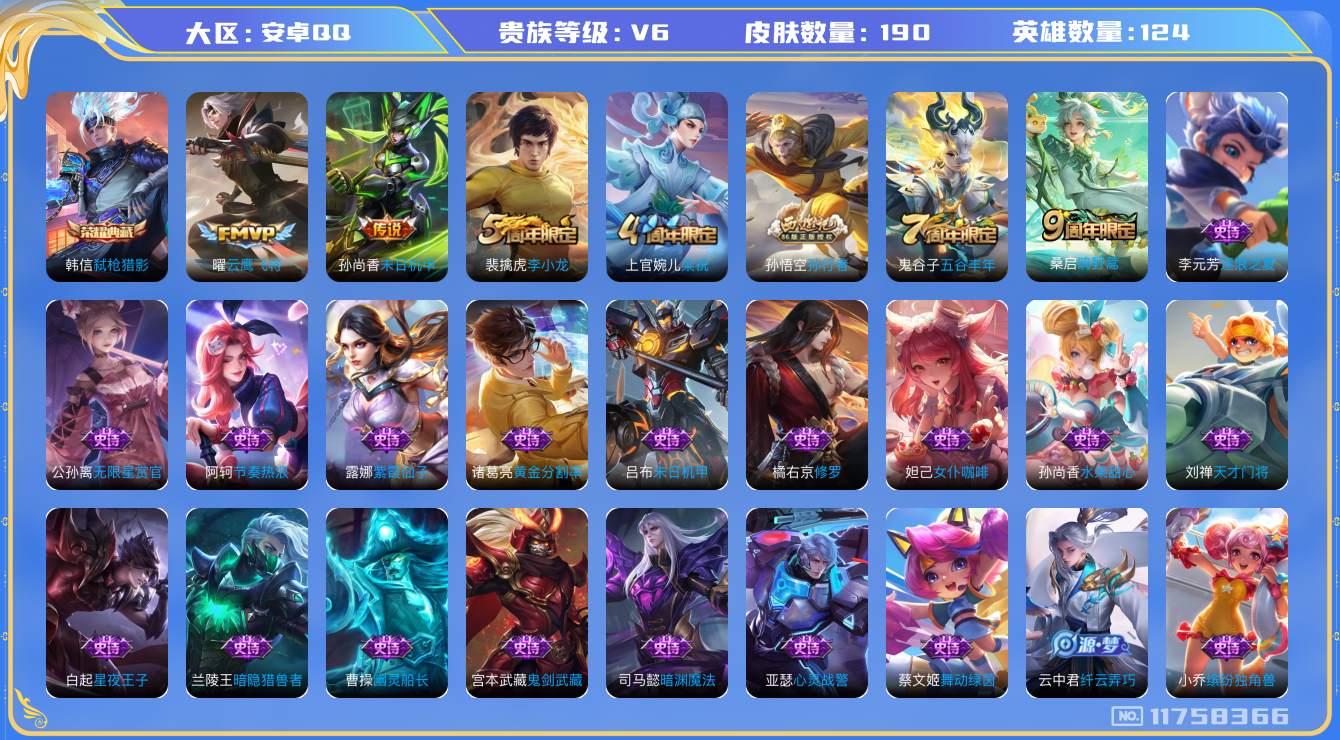 [11758366]【商品标题】:安卓Q-V6-最强王者段位-124英雄-190皮肤-1典藏-0珍品无双-0无双-0珍品传说-3传说-50史诗